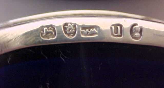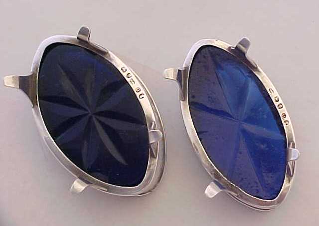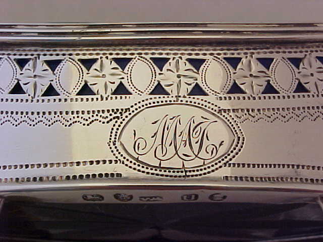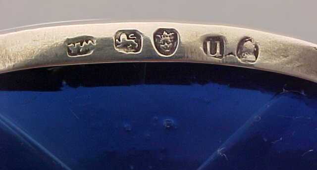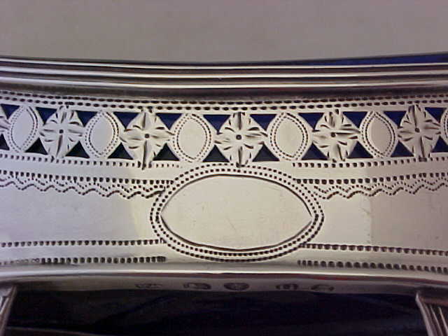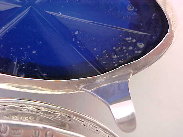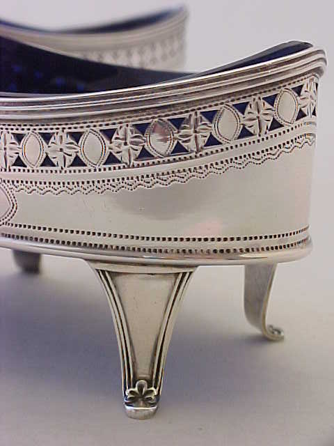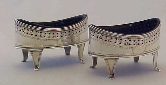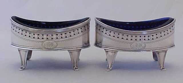 DESCRIPTION | Elegant pair of Georgian silver salts with a monogram engraving to the cartouche on one side, the other still blank. Both blue glass liners have star cut bases, one is old and the other a later replacement. |