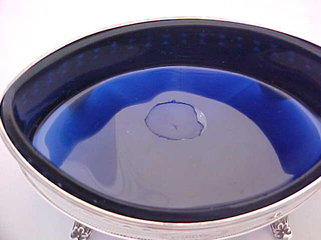 one leg has probably been reattached. The old liner has some micro rim chips and an original flaw to the centre of the base, most likely caused by a bubble in the glass. The replacement liner has some very small rim chips. |