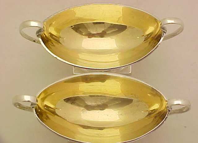 Pair of large silver pedestal salts with gilded interiors and a pair of gilded silver salt spoons. |