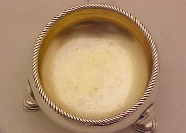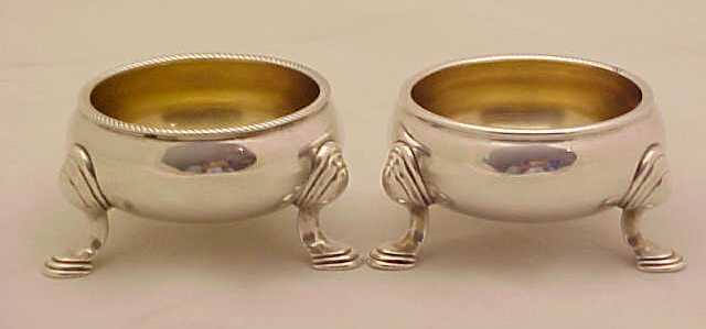Very good quality pair of early George II silver cauldron salts with gilded interiors and rope twist rims. One is faintly crested. The legs are thick and strurdy. |