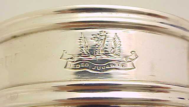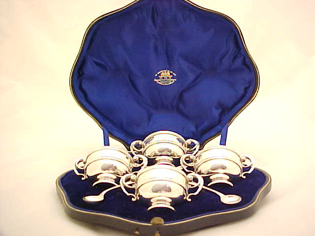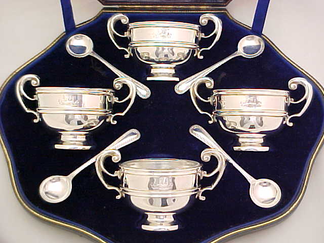 Original cased set of four Edwardian silver pedestal salts with twin, capped 'C' scroll handles and clear glass liners. Each is crested above the motto 'Deo Juvante', God Assisting. Complete with four bead edged Victorian silver salt spoons. |