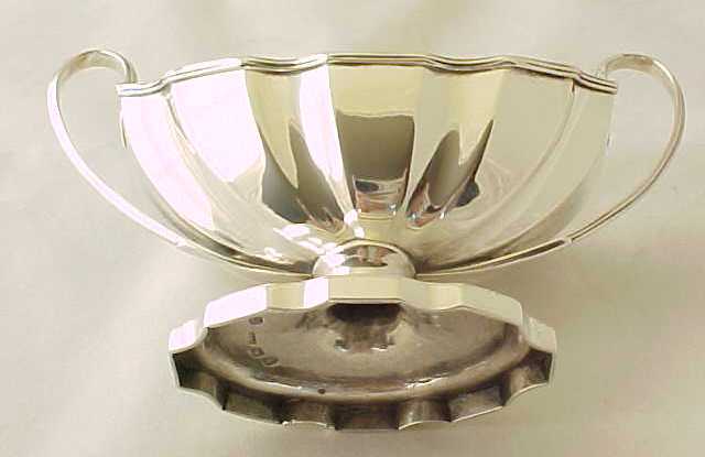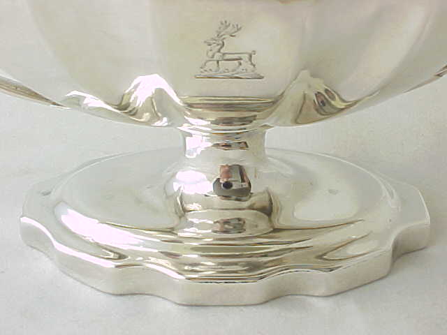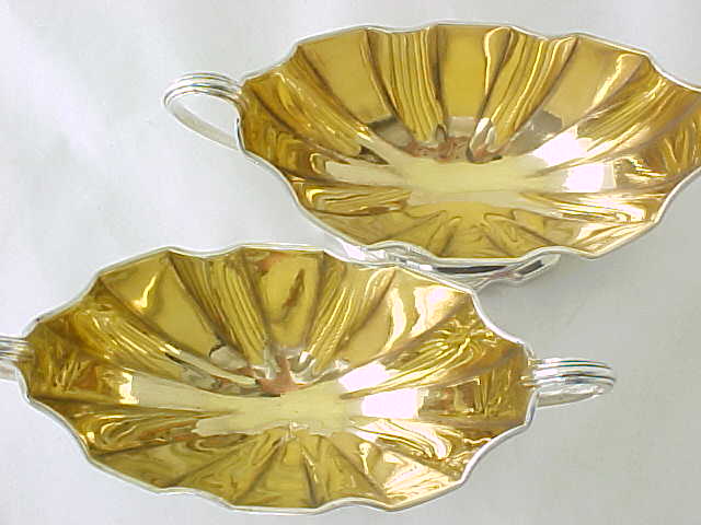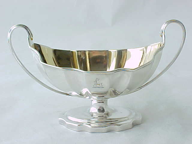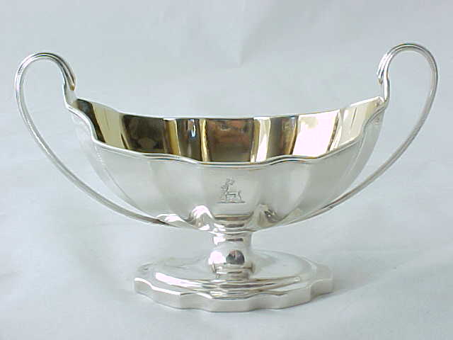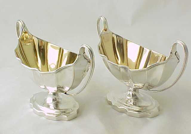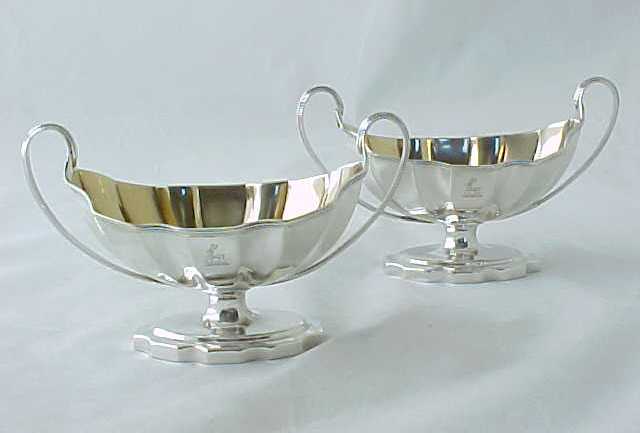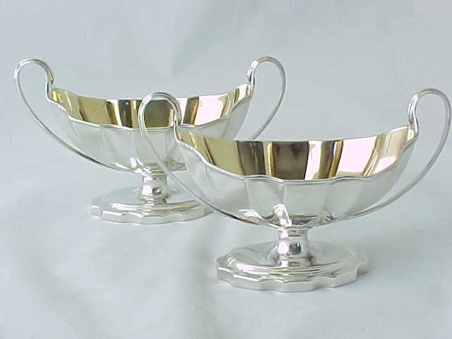 Superb pair of Georgian silver navette shaped two handled pedestal salts, stag crested and with reeded borders and richly gilded interiors. The hallmarks are within the base and so are as crisp now as the day when they were struck. |