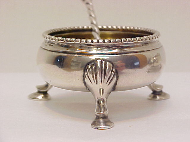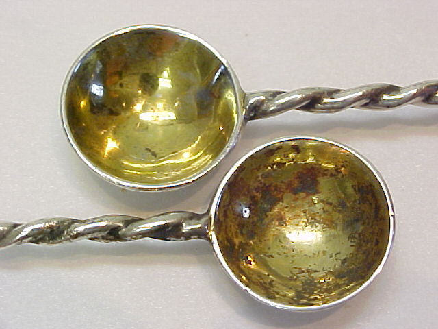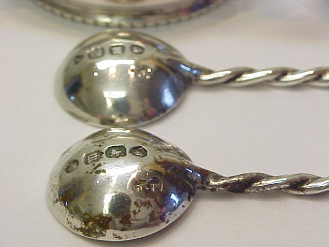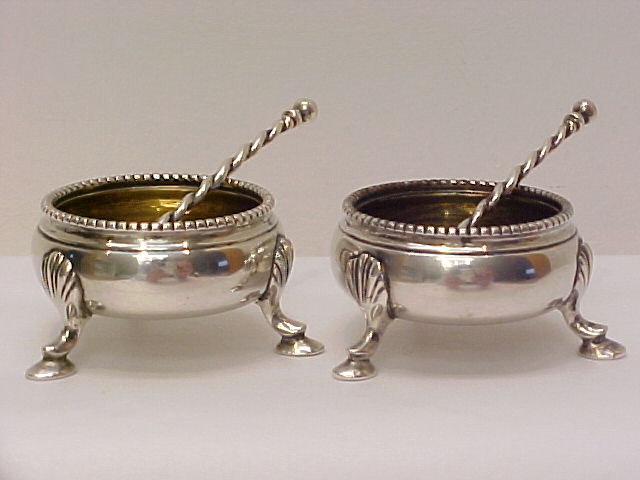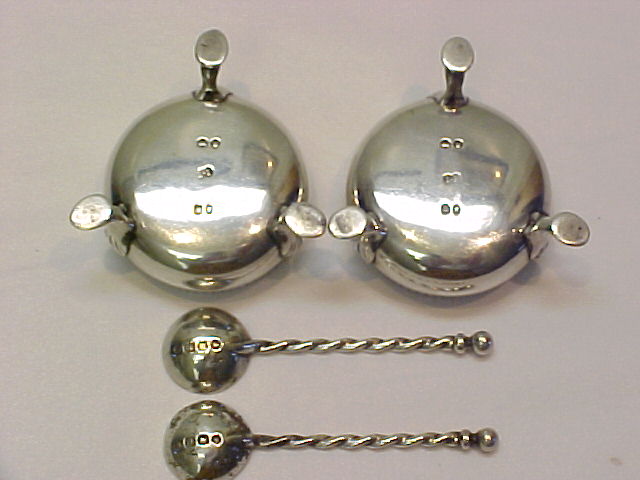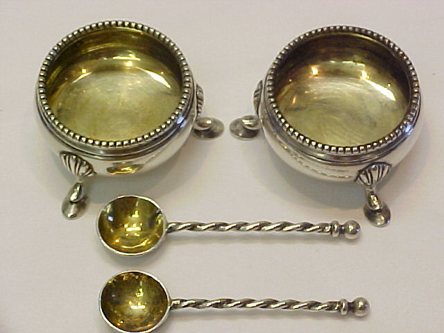 Very pretty pair of Victorian silver salts and matching salt spoons all with the original gilded interiors. Perhaps smaller than you would expect at just over 1½" and of good weight. |
