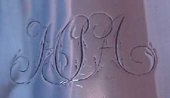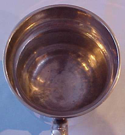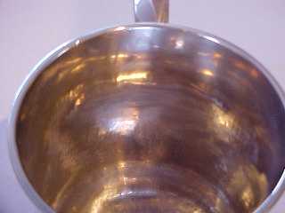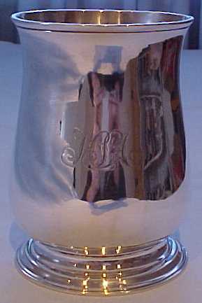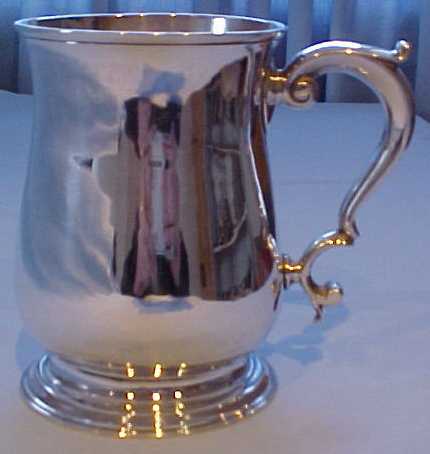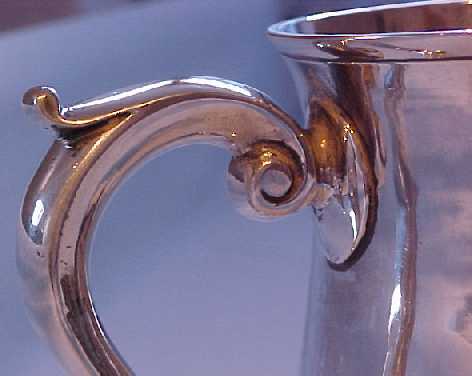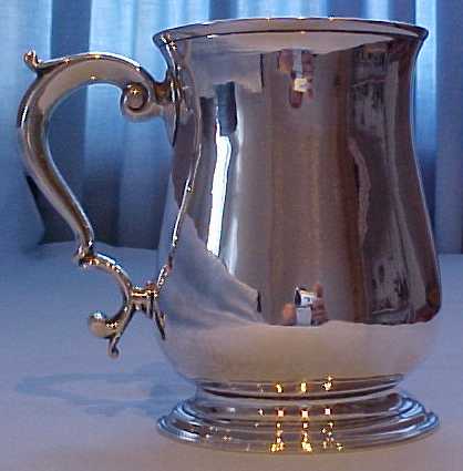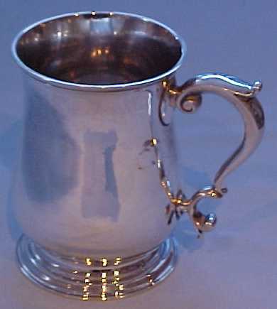 George II silver one pint baluster mug on a stepped foot and with a scrolling handle. There is a small engraved monogram HSA in flowing script. | ||