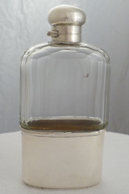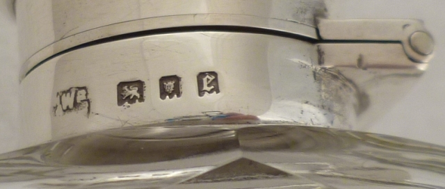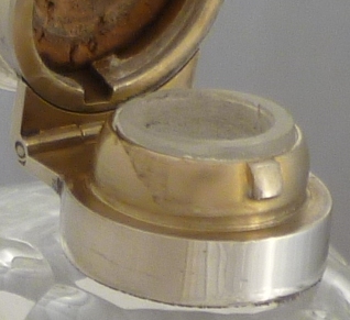 OVERALL CONDITION | silver excellent, firm and tight hinge/lid action that seals well, glass has a small chip to an outside shoulder, micro hairline and chips to neck rim, the black mark mid bottle is just a piece of surface debris that I could not get at having misplaced my bottle brush. |
