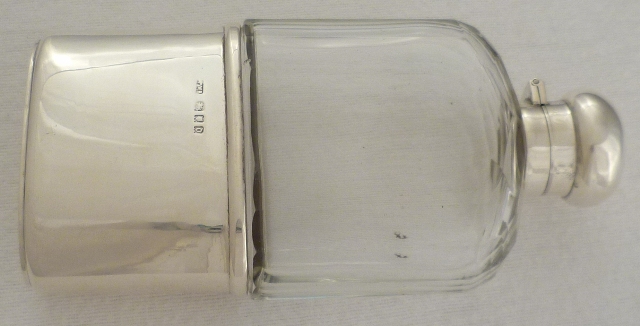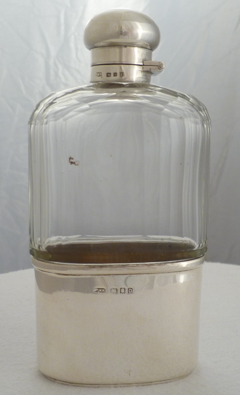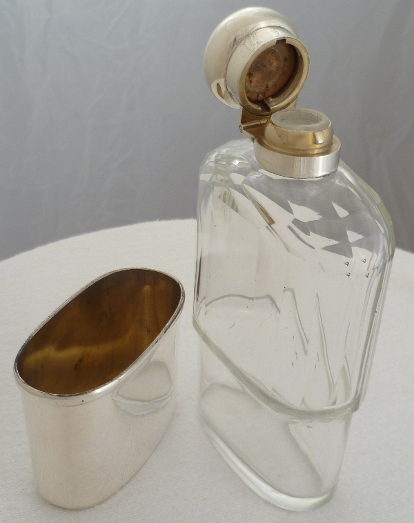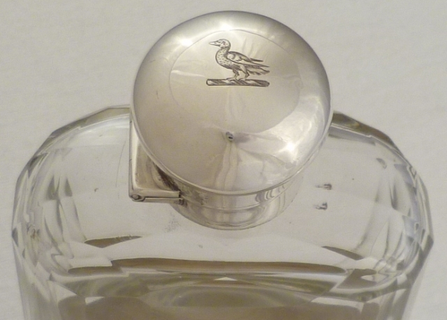DESCRIPTION | Facetted cut glass pocket flask mounted with a silver gilt pull off drinking cup to the base and a crest engraved silver gilt hinged lid fitted with a cork stopper. |