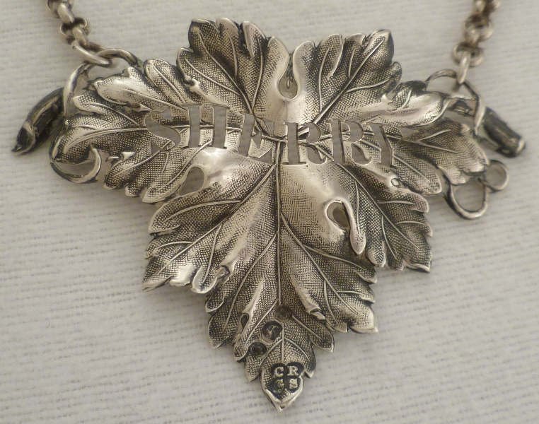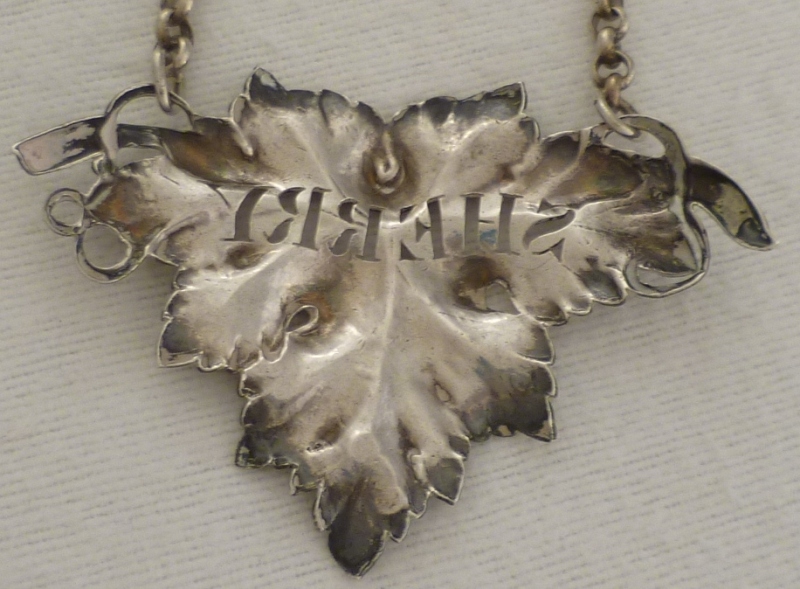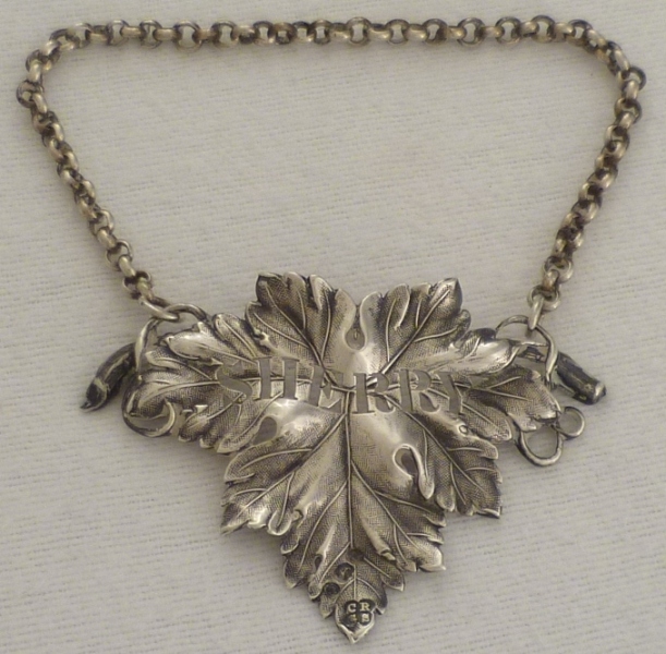 DESCRIPTION | Good William IV silver vine leaf label pierced SHERRY complete with a probably plated suspension chain. |