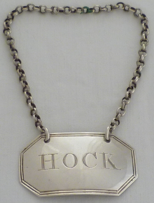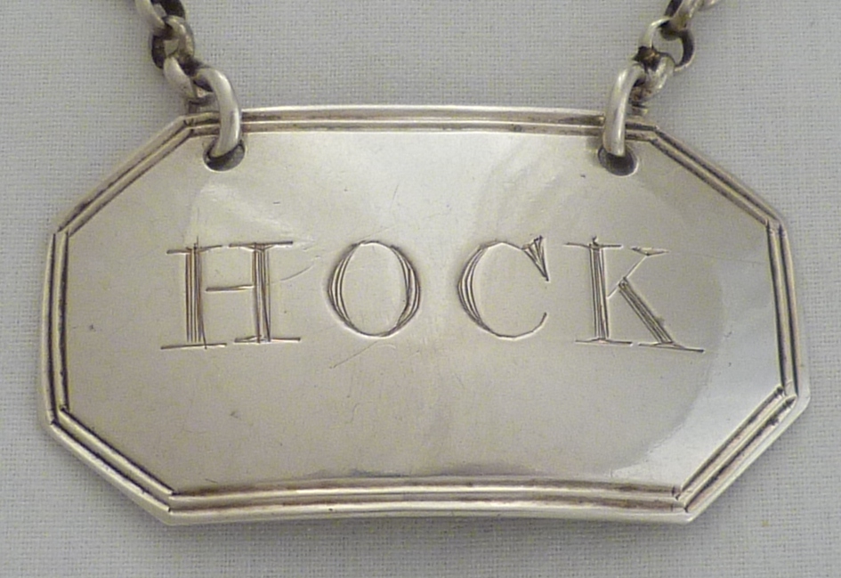 DESCRIPTION | Good Georgian silver wine label incised 'HOCK' with cut corners and a thread border. Matching examples are available. |