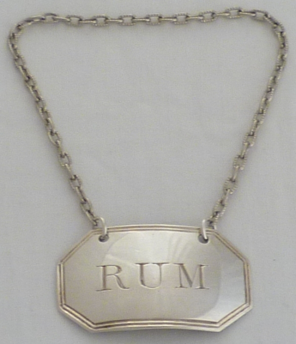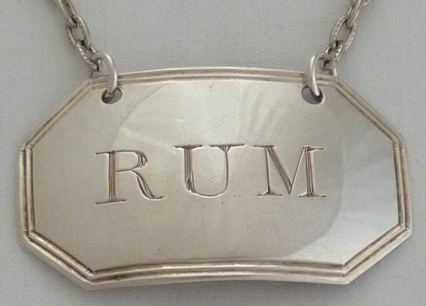 DESCRIPTION | Good Georgian silver wine label incised 'RUM' with cut corners and a thread border. |