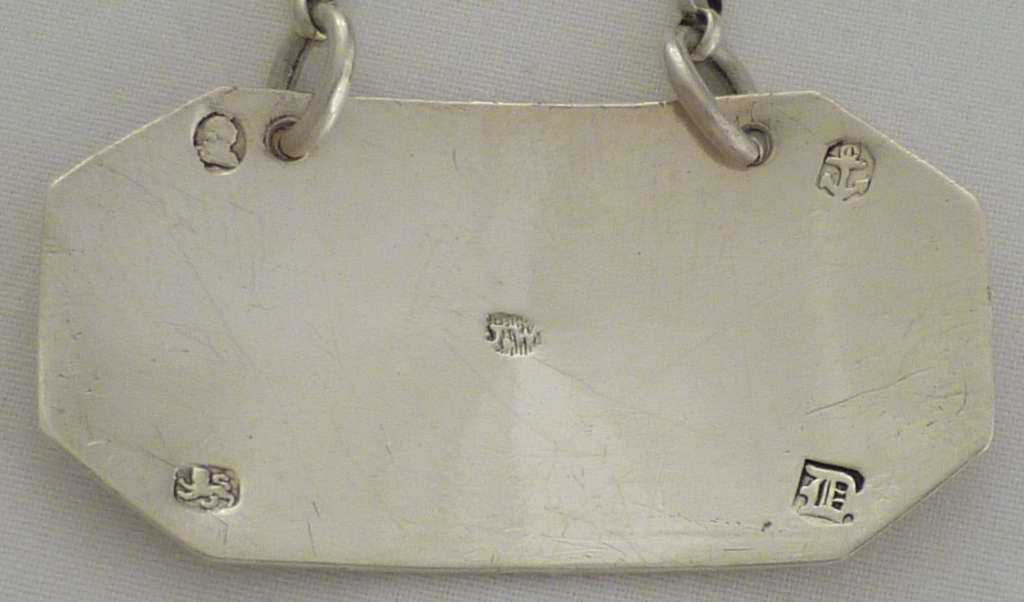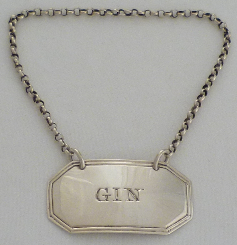 DESCRIPTION | Georgian silver GIN label with cut corners and a thread decorated border. |