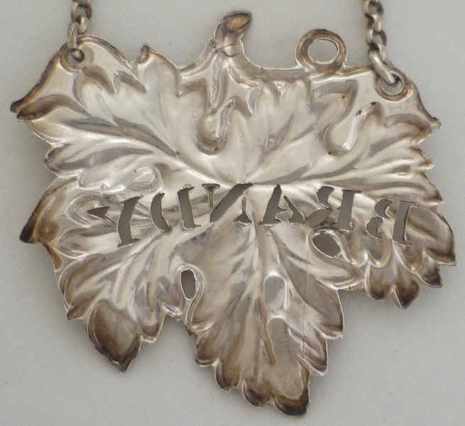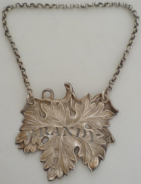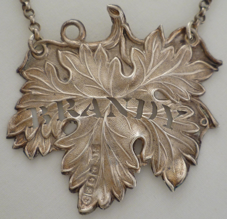 DESCRIPTION | Victorian silver vine leaf wine label pierced BRANDY. |