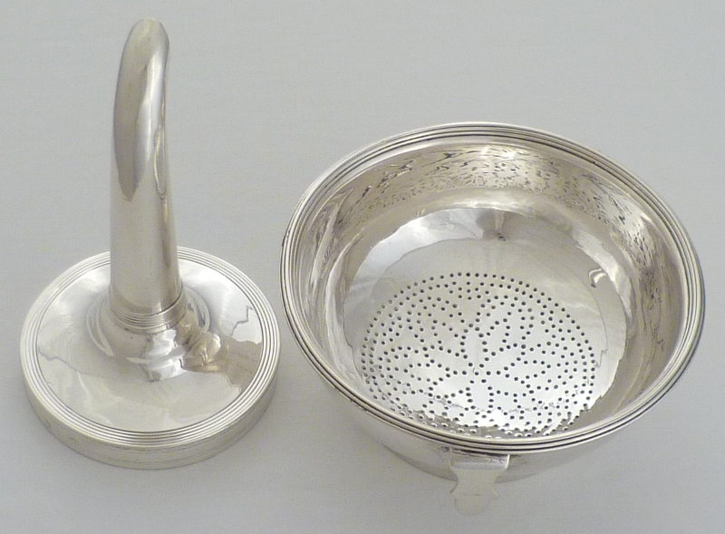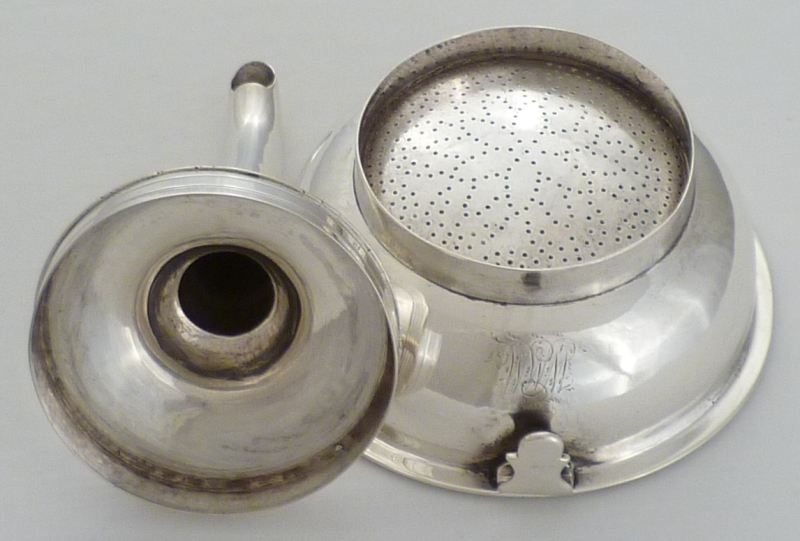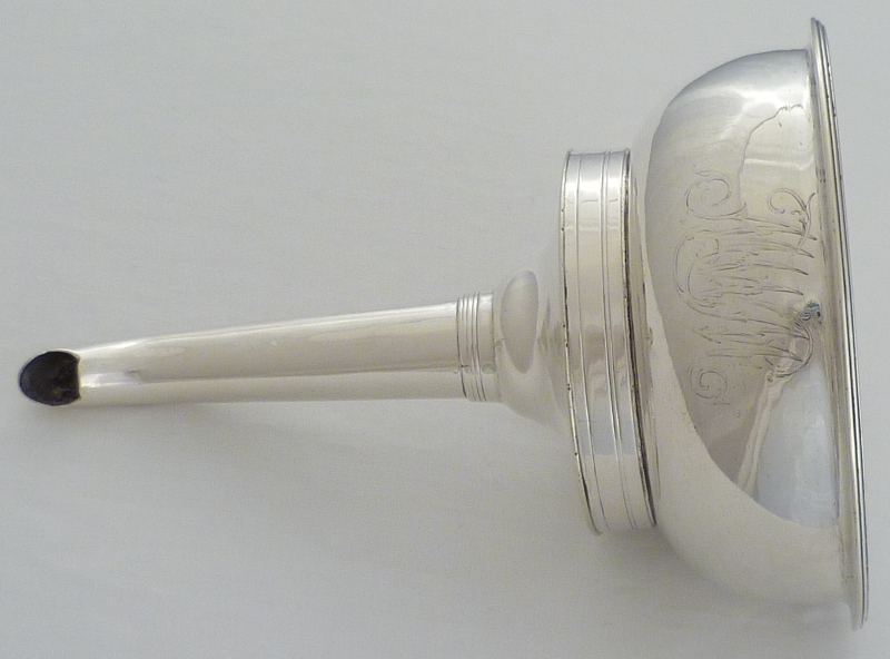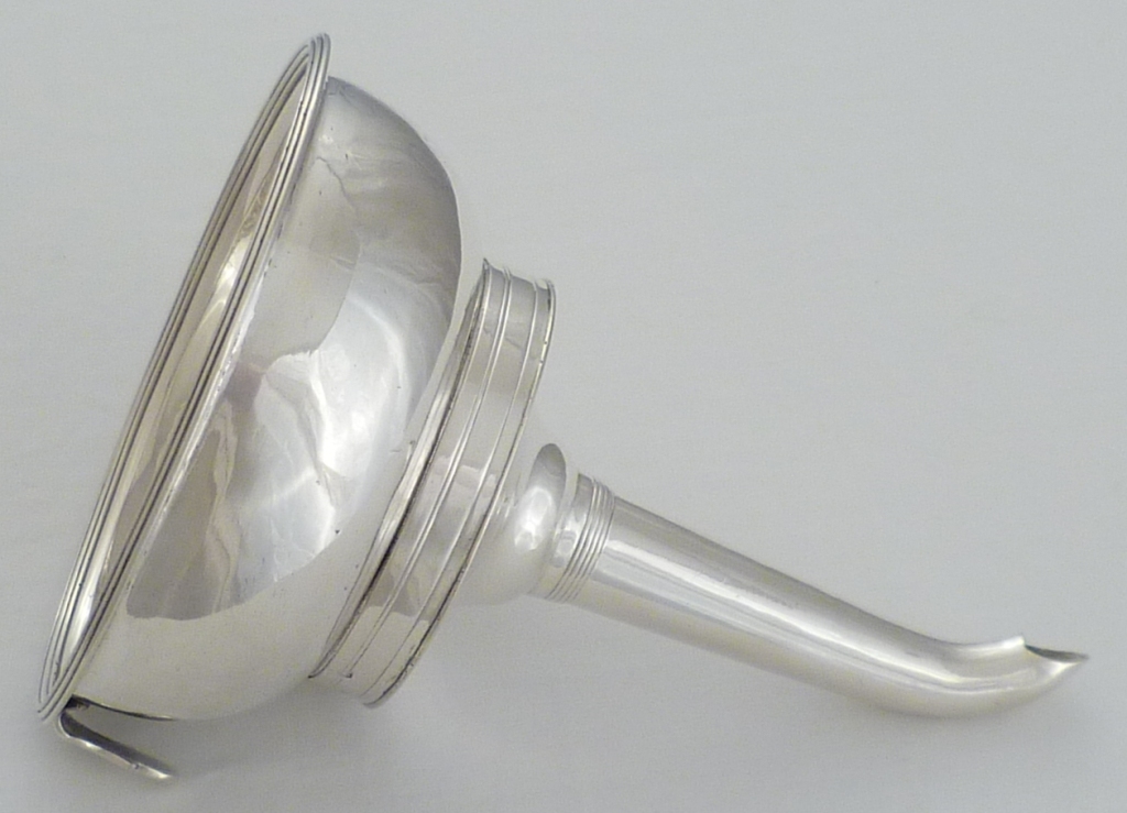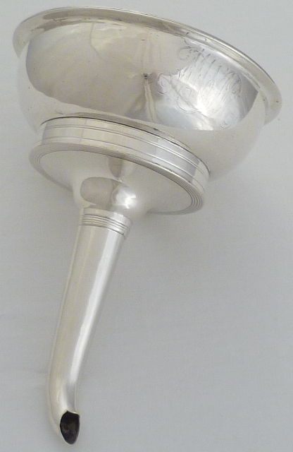 DESCRIPTION | Very good Georgian silver wine funnel with thread decoration and a shaped tang. Large but faint monogram engraving opposite the tang and a smaller one beneath. Correctly hallmarked with a very clear full set to the strainer section and partial marks to the base. |