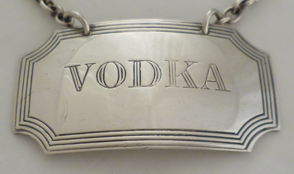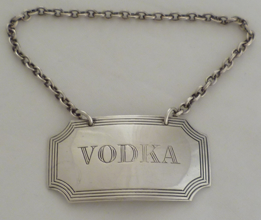 DESCRIPTION | Silver 'VODKA' label with cut corners. |