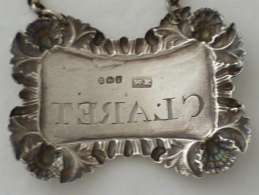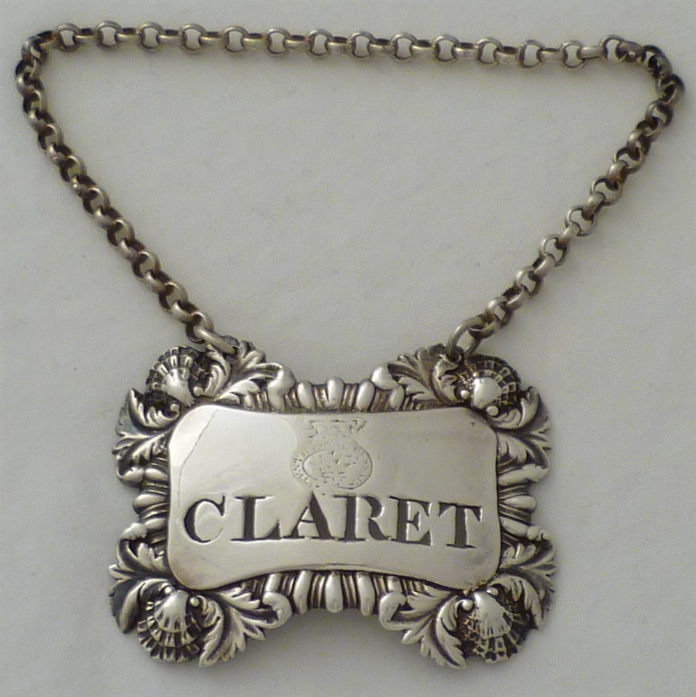 DESCRIPTION | Georgian silver wine label incised 'CLARET' below engraved crest for the Tenth Royal Hussars (Prince of Wales's Own) and complete with suspension chain. |