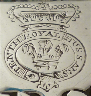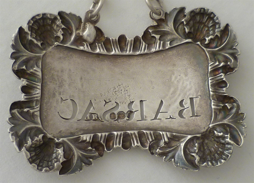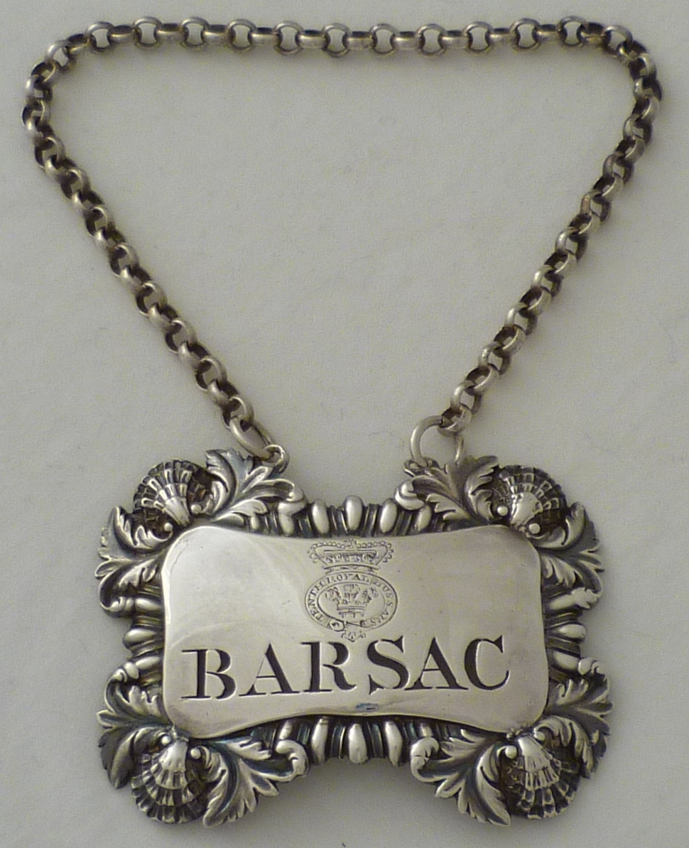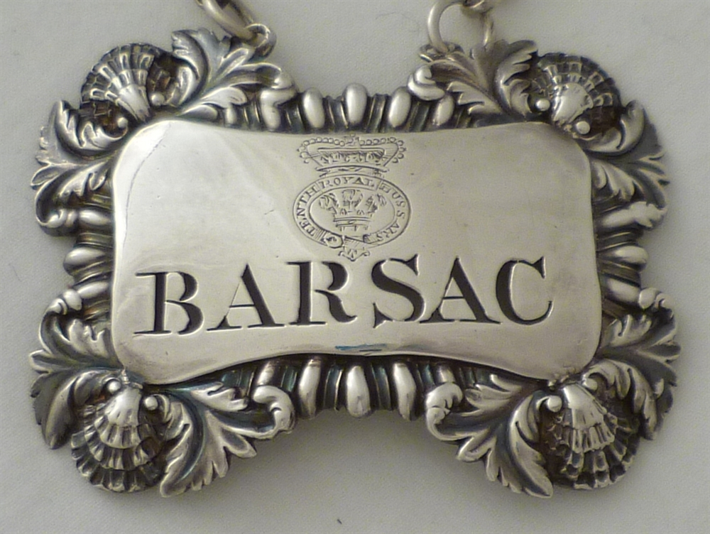 DESCRIPTION | Georgian silver wine label incised 'BARSAC' below engraved crest for the Tenth Royal Hussars (Prince of Wales's Own) and complete with suspension chain. |