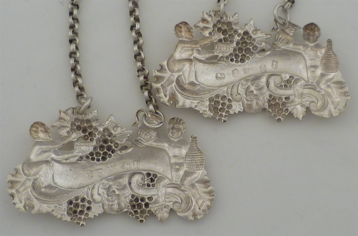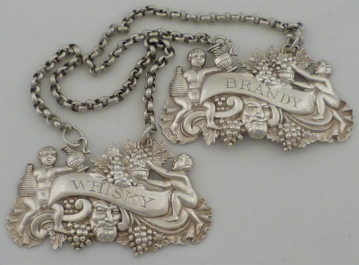 DESCRIPTION | Pair of Georgian silver wine labels depicting Bacchanalian revellers, ewer, Bacchus mask and grapevines. One inscribed 'BRANDY', the other 'WHISKY'. |