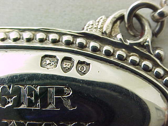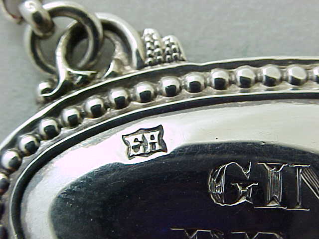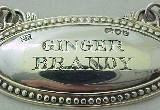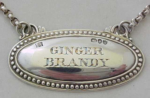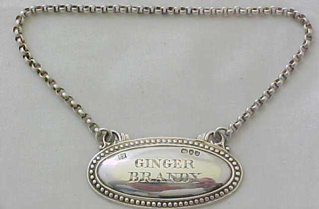 DESCRIPTION | Victorian sterling silver oval GINGER BRANDY label with bead edge decoration and long suspension chain. |