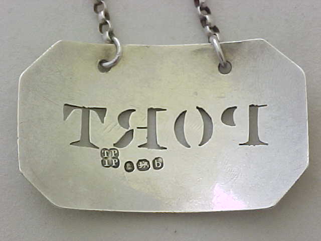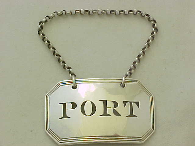 DESCRIPTION | Georgian sterling silver pierced PORT bottle label with a thread border and suspension chain. |