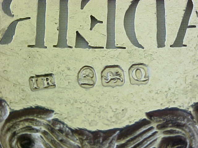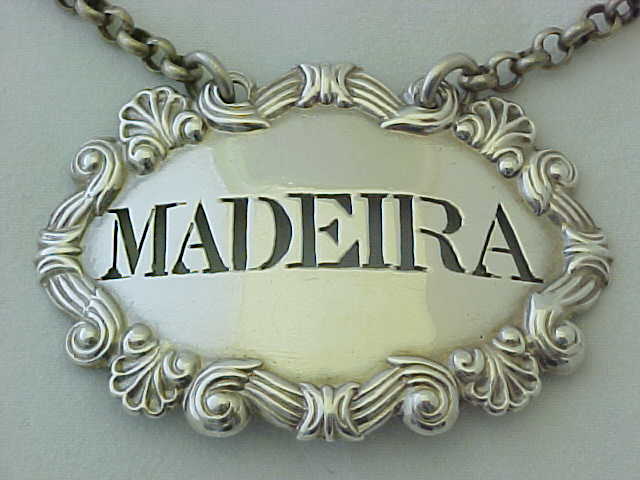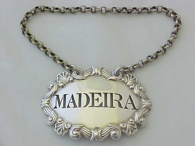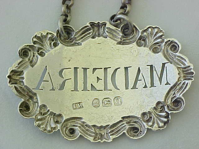 DESCRIPTION | Georgian solid sterling silver wine label pierced MADEIRA with a shell and scroll border and on a probable plated chain. See Salter fig: 553. |