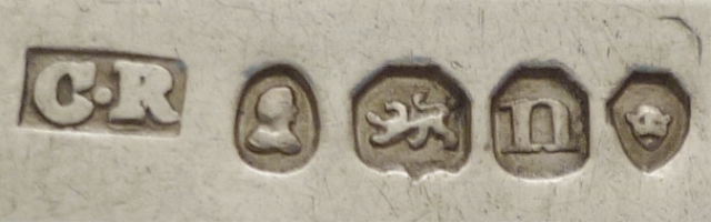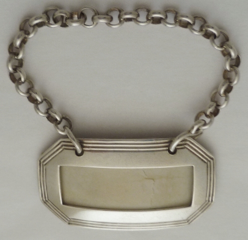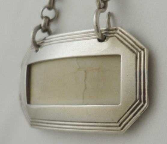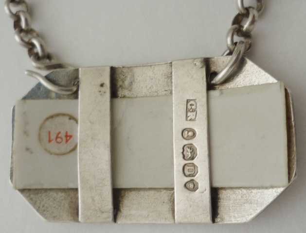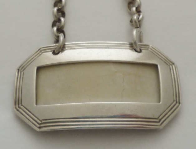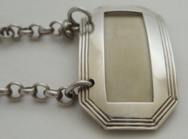 DESCRIPTION | Georgian sterling silver slot type wine label, chunky suspension chain with detaching hook and waxy material slot insert. |