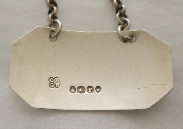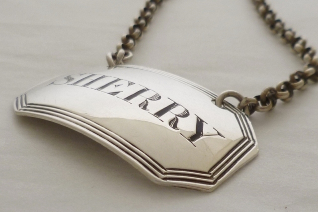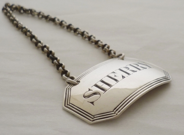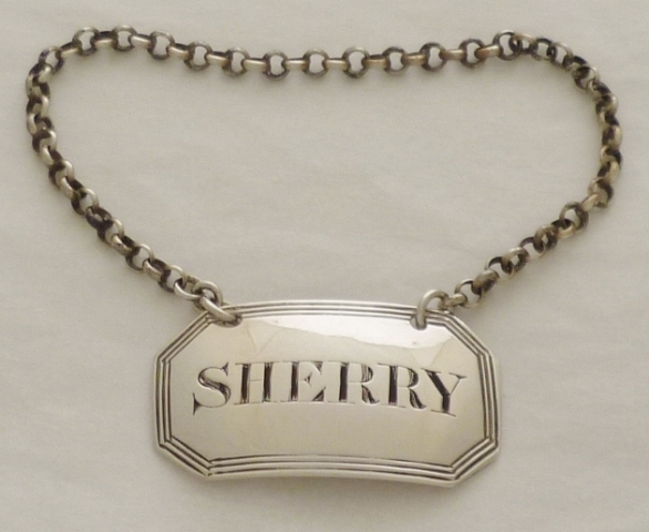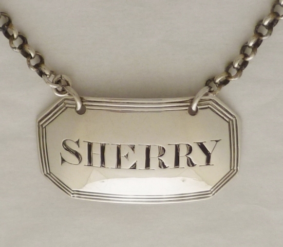 DESCRIPTION | William IV solid sterling silver wine label 'SHERRY' incised and black filled, with cut corners and a double thread border. |