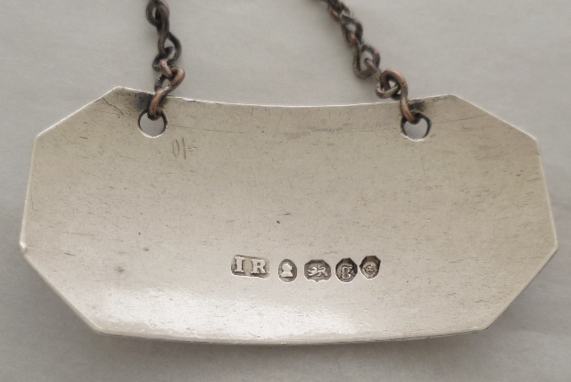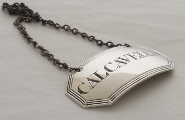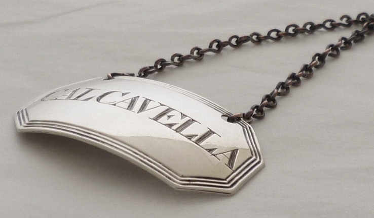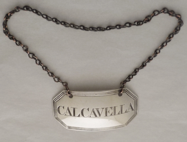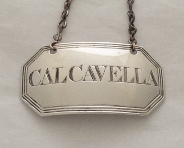DESCRIPTION | Georgian solid sterling silver wine label incised 'CALCAVELLA' with cut corners and a double thread border. |