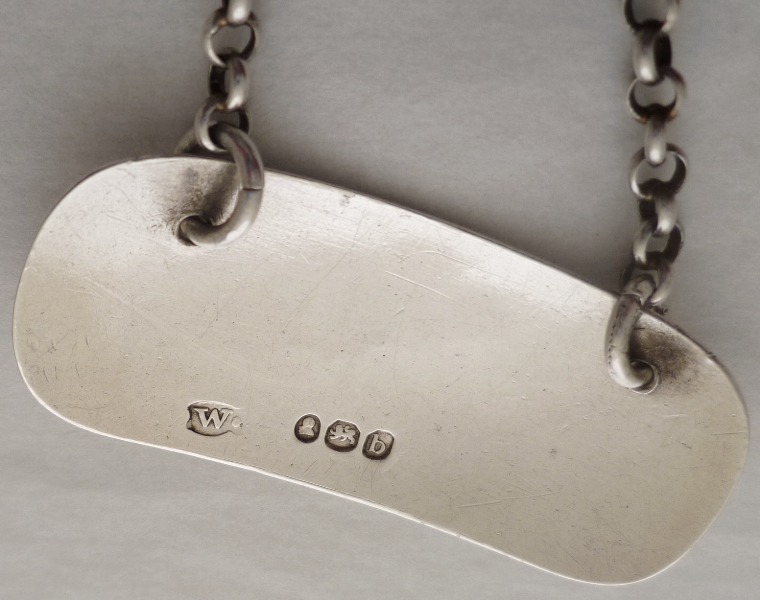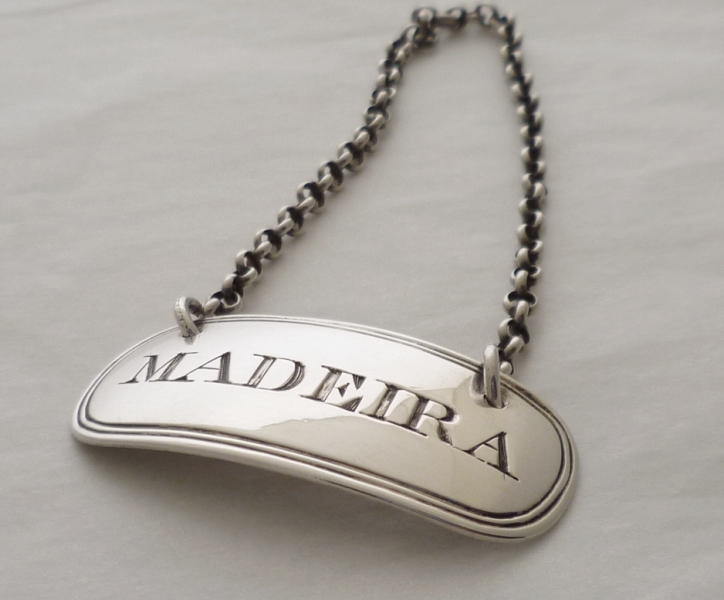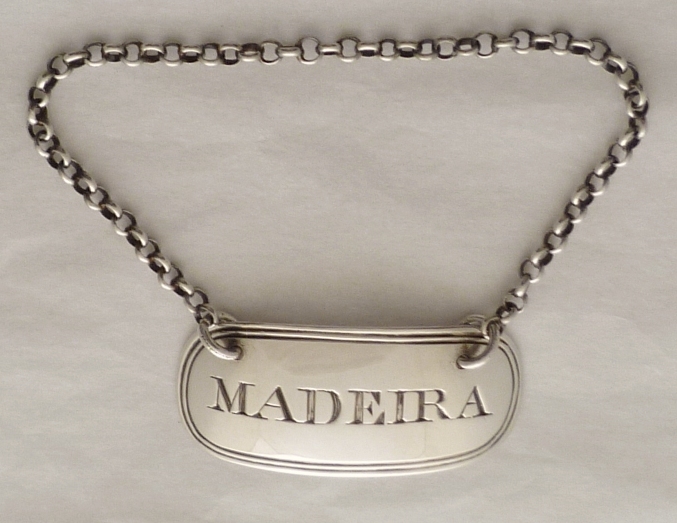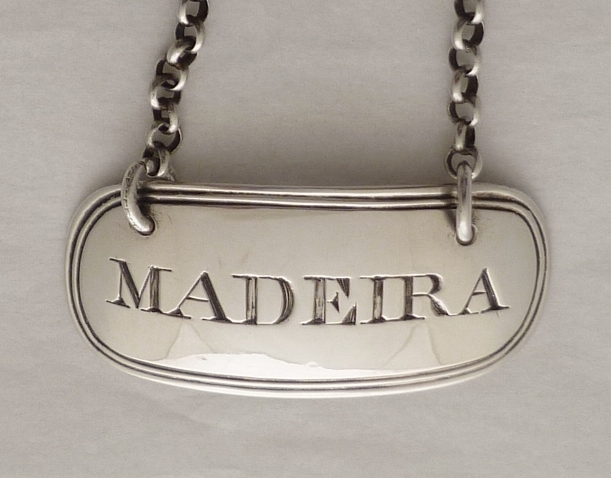DESCRIPTION | Georgian solid sterling silver wine label incised 'MADEIRA' with rounded corners and a thread border. |