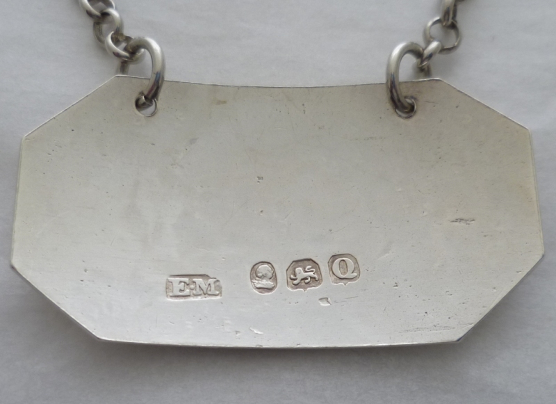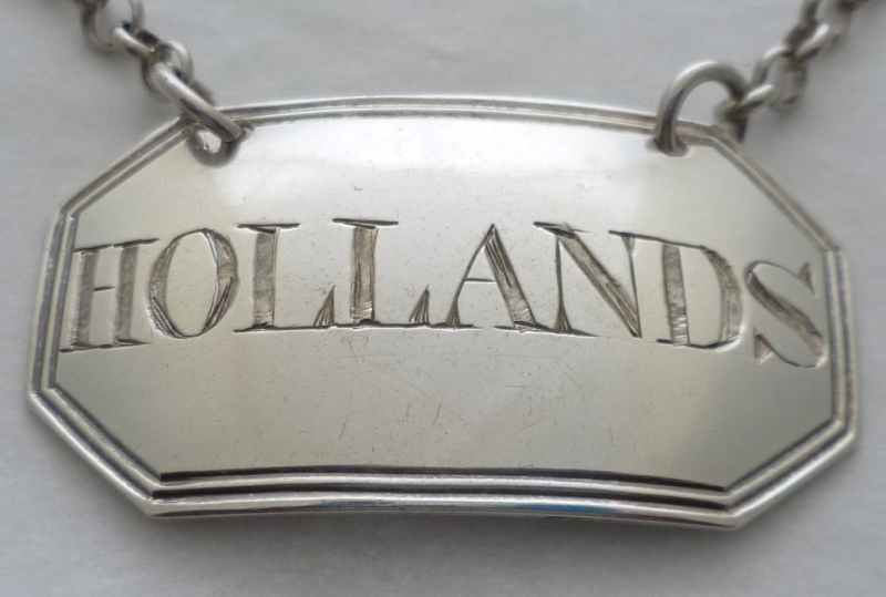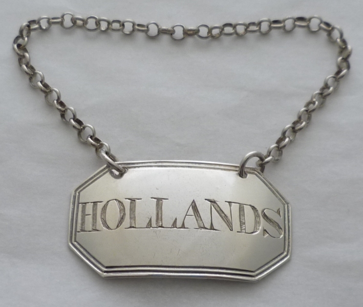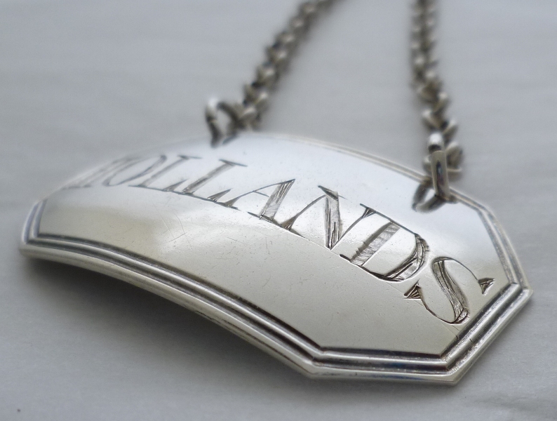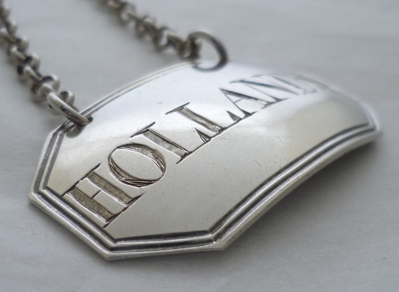 DESCRIPTION | Georgian solid sterling silver wine label incised 'HOLLANDS' with cut corners and a thread border. |