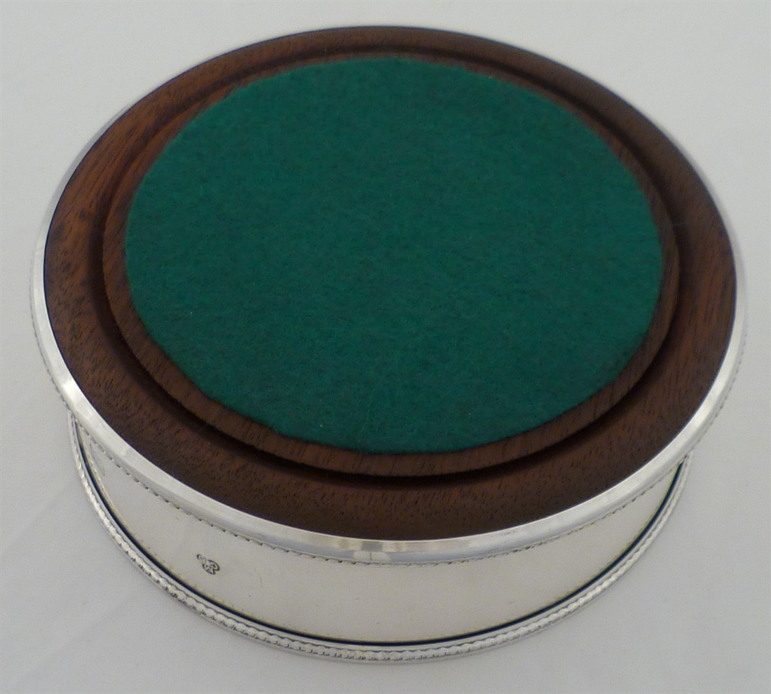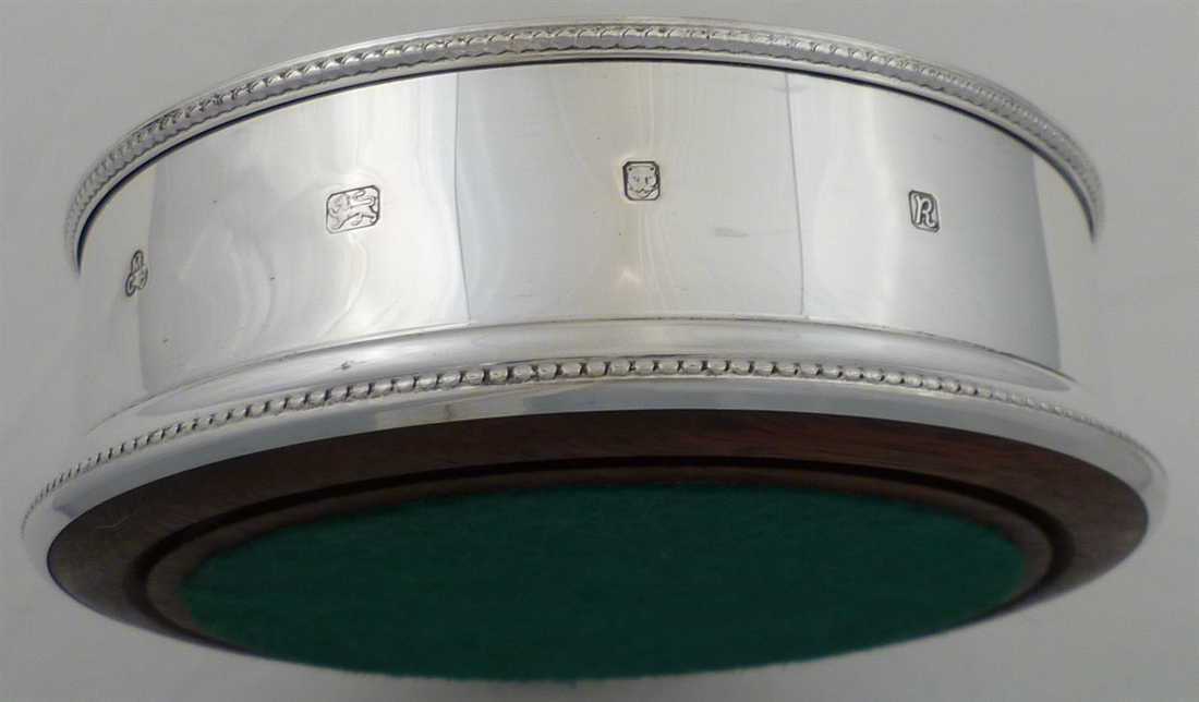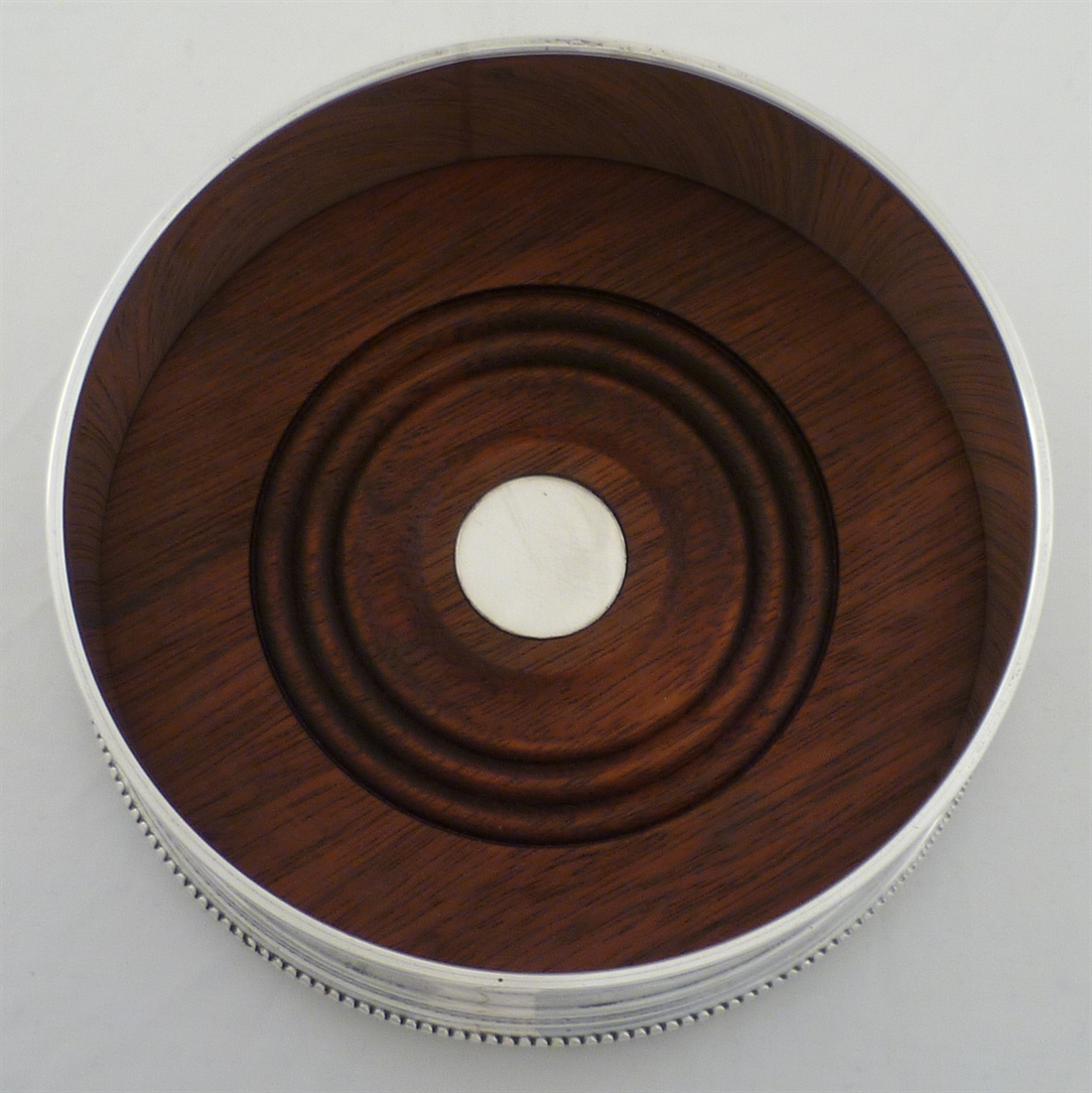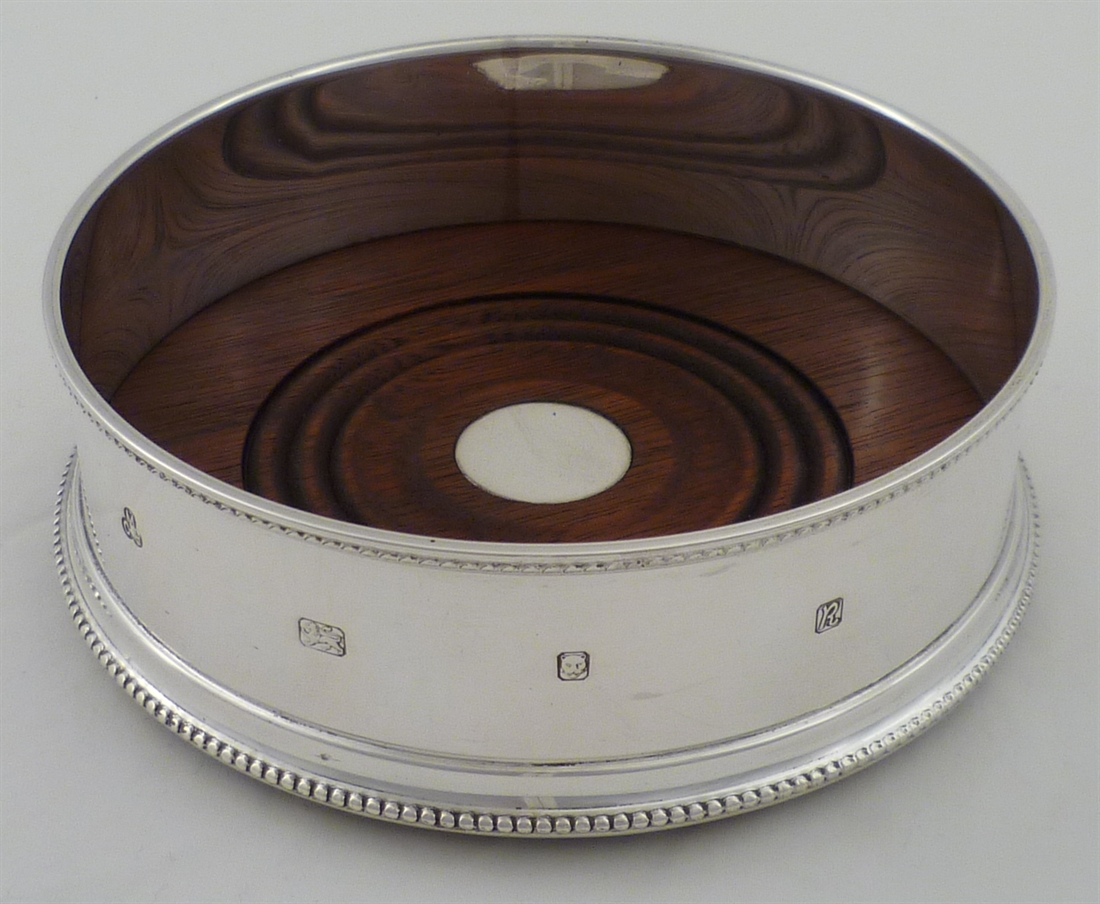 DESCRIPTION | Solid silver large bottle or decanter coaster with bead edge decoration and button inset turned wood base with a felt bottom. |