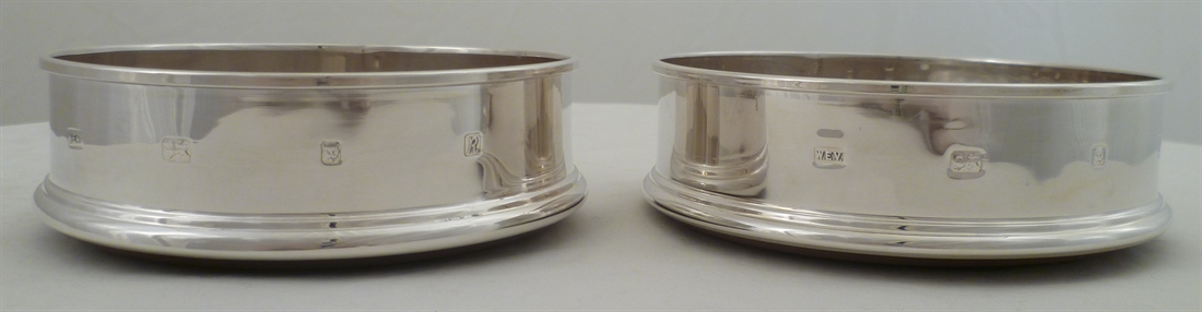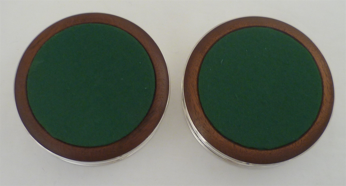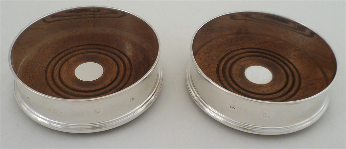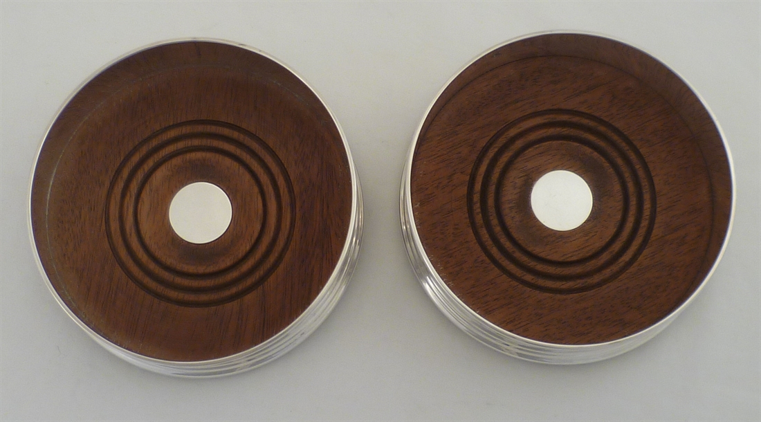 DESCRIPTION | Good pair of solid silver decanter coasters with silver button inset turned wood bases and felt bottoms. |