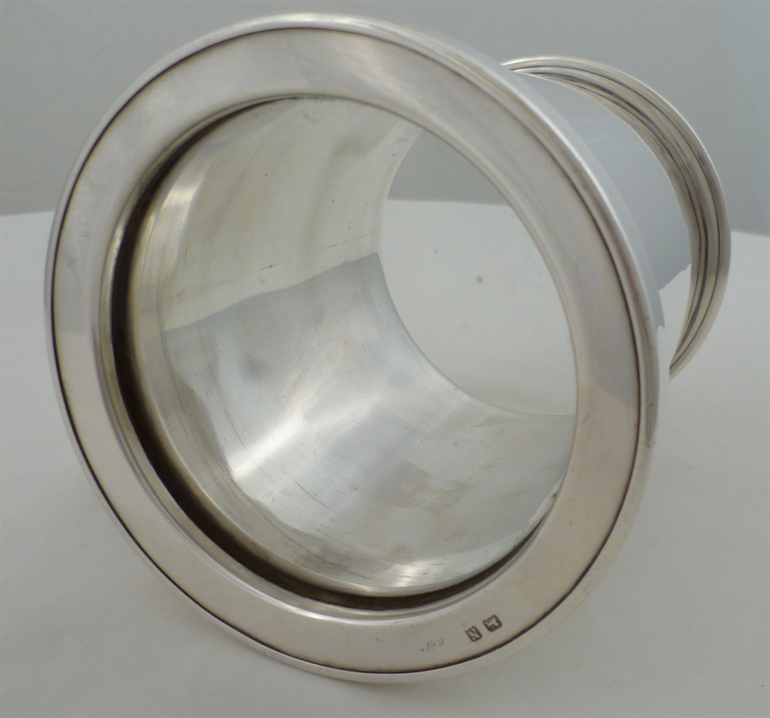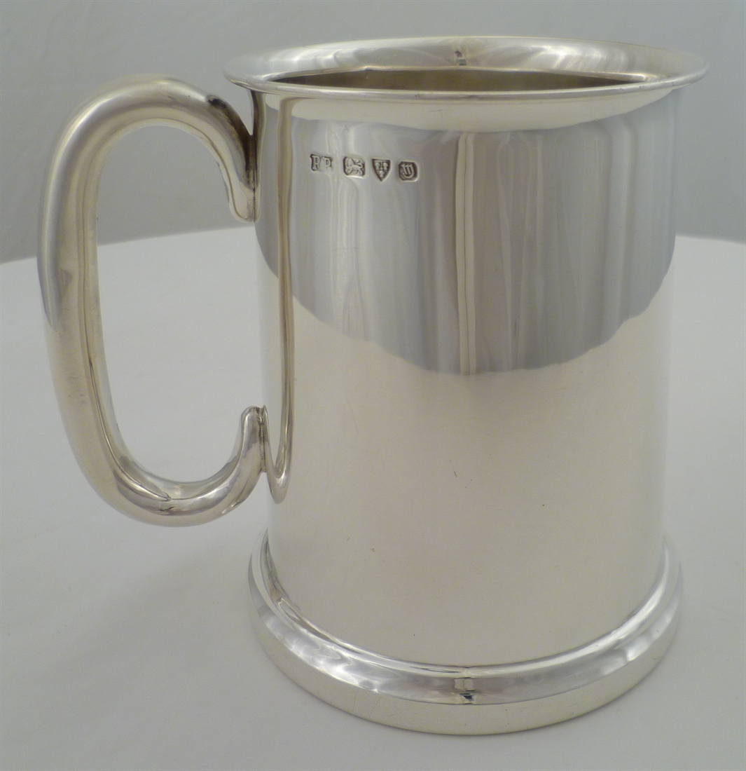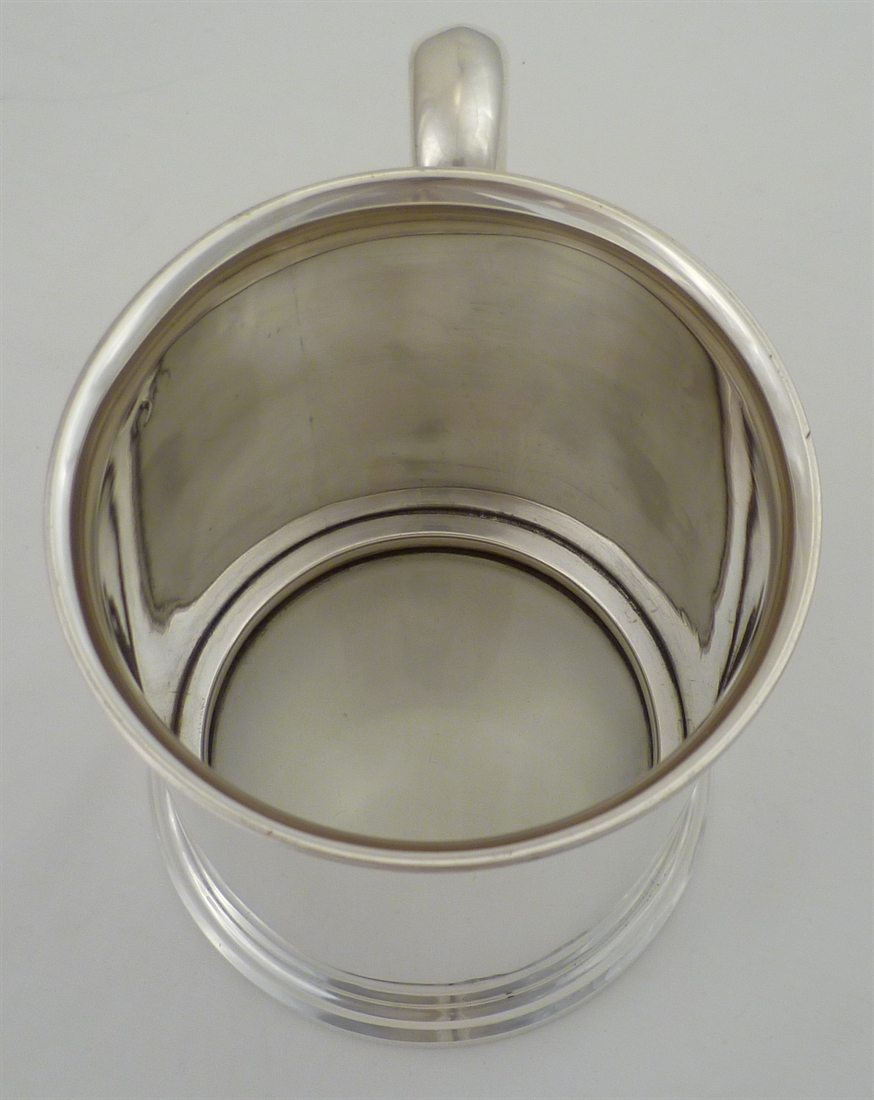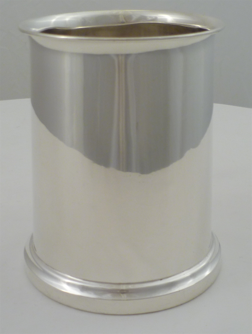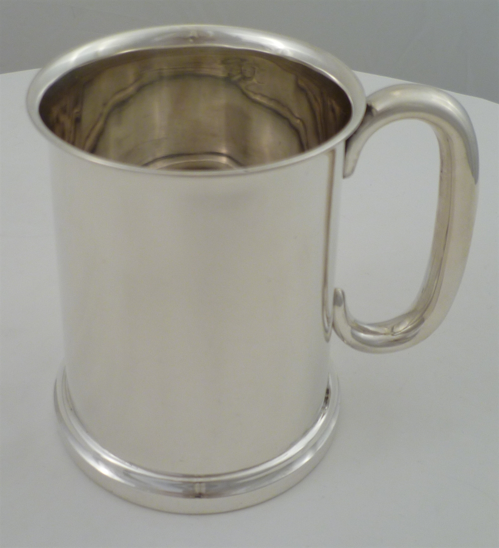 DESCRIPTION | Heavy solid silver one pint mug with a glass bottom and no engraving. Holds just over one pint, one pint plus about 12mm for the head. |