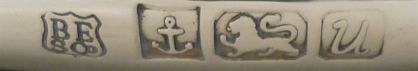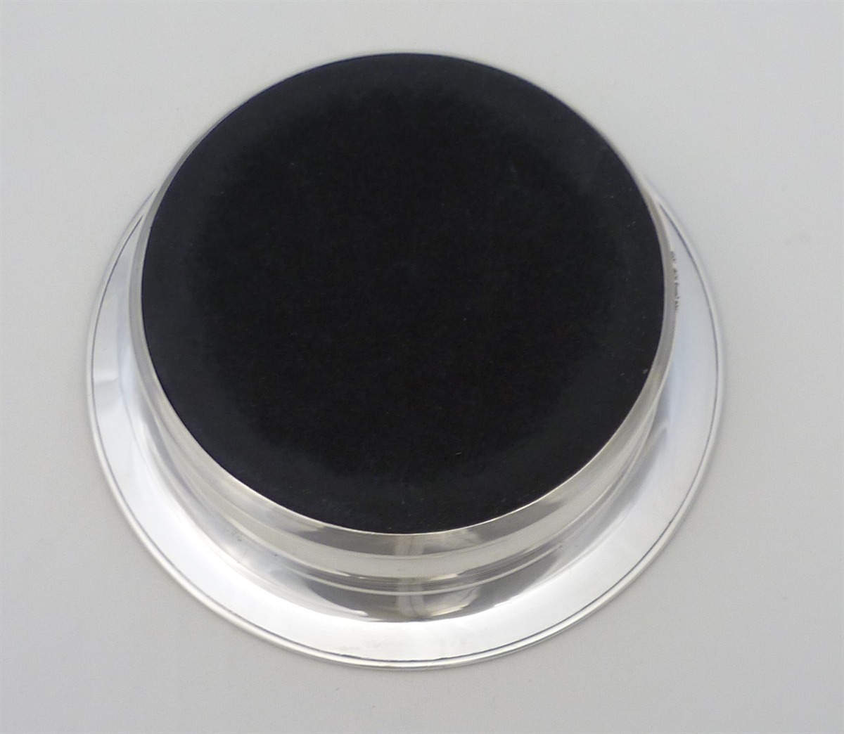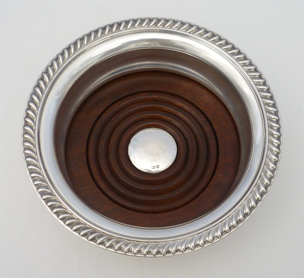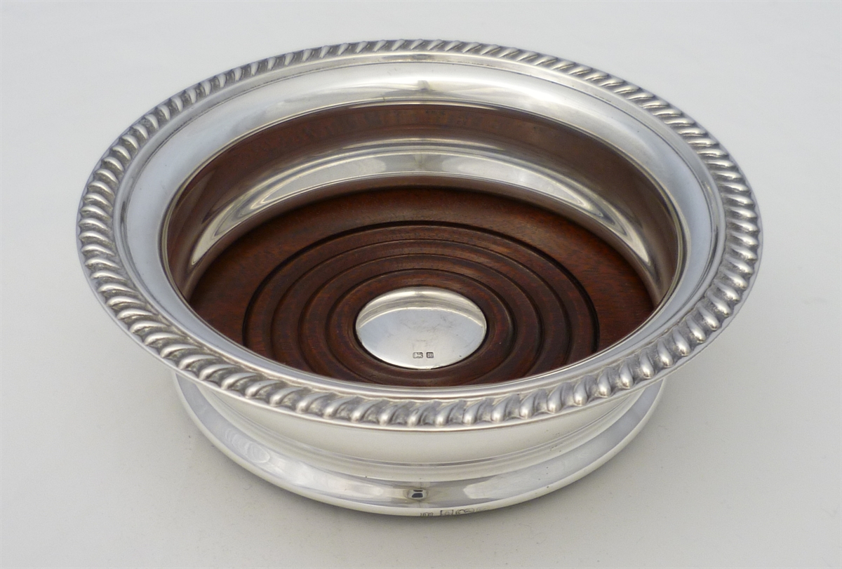 DESCRIPTION | Large solid sterling silver bottle coaster with a flared and gadrooned top rim, silver button inset turned wood base, a felt bottom and no engraving or erasure. Larger size probably designed for champagne bottles. |