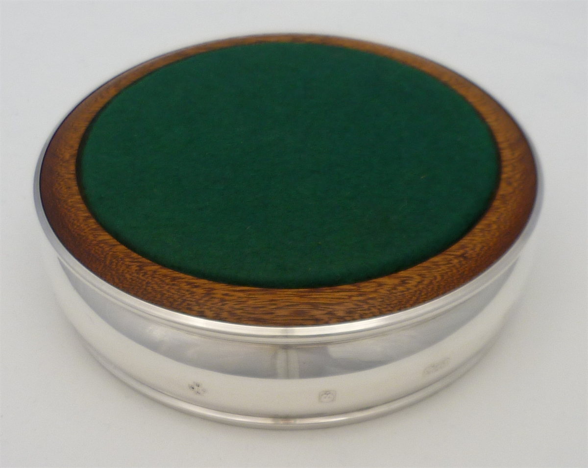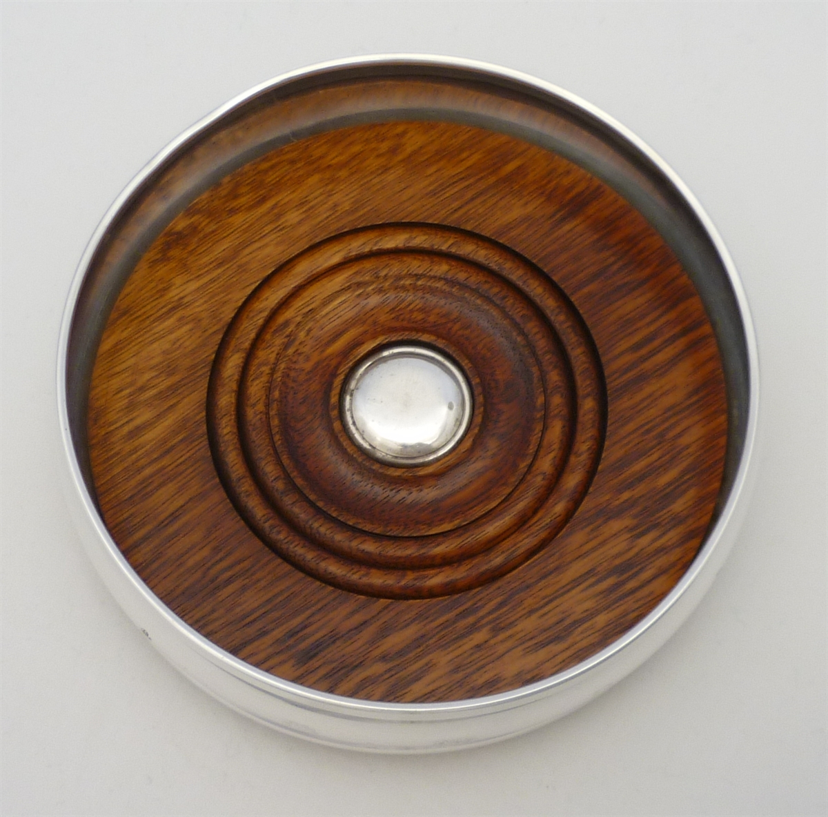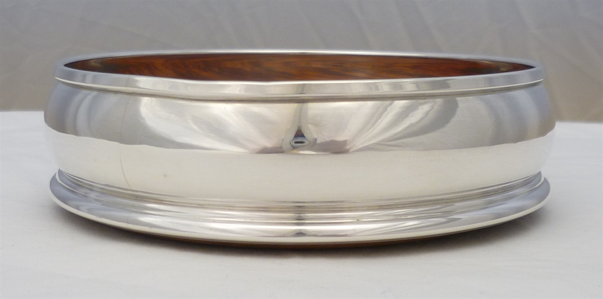DESCRIPTION | Solid sterling silver bottle or decanter coaster with a silver button inset turned wood base and a felt bottom. |