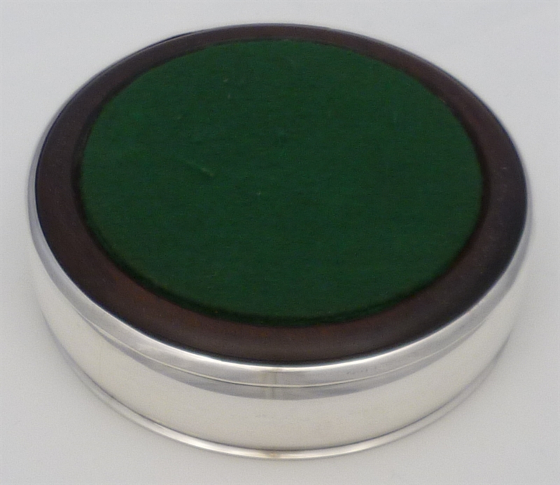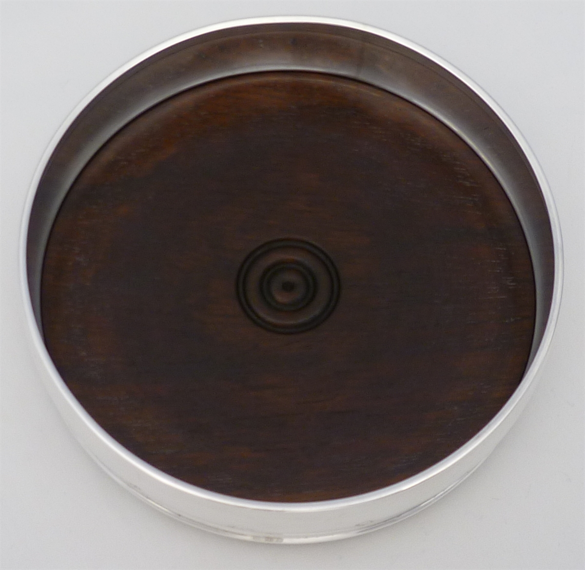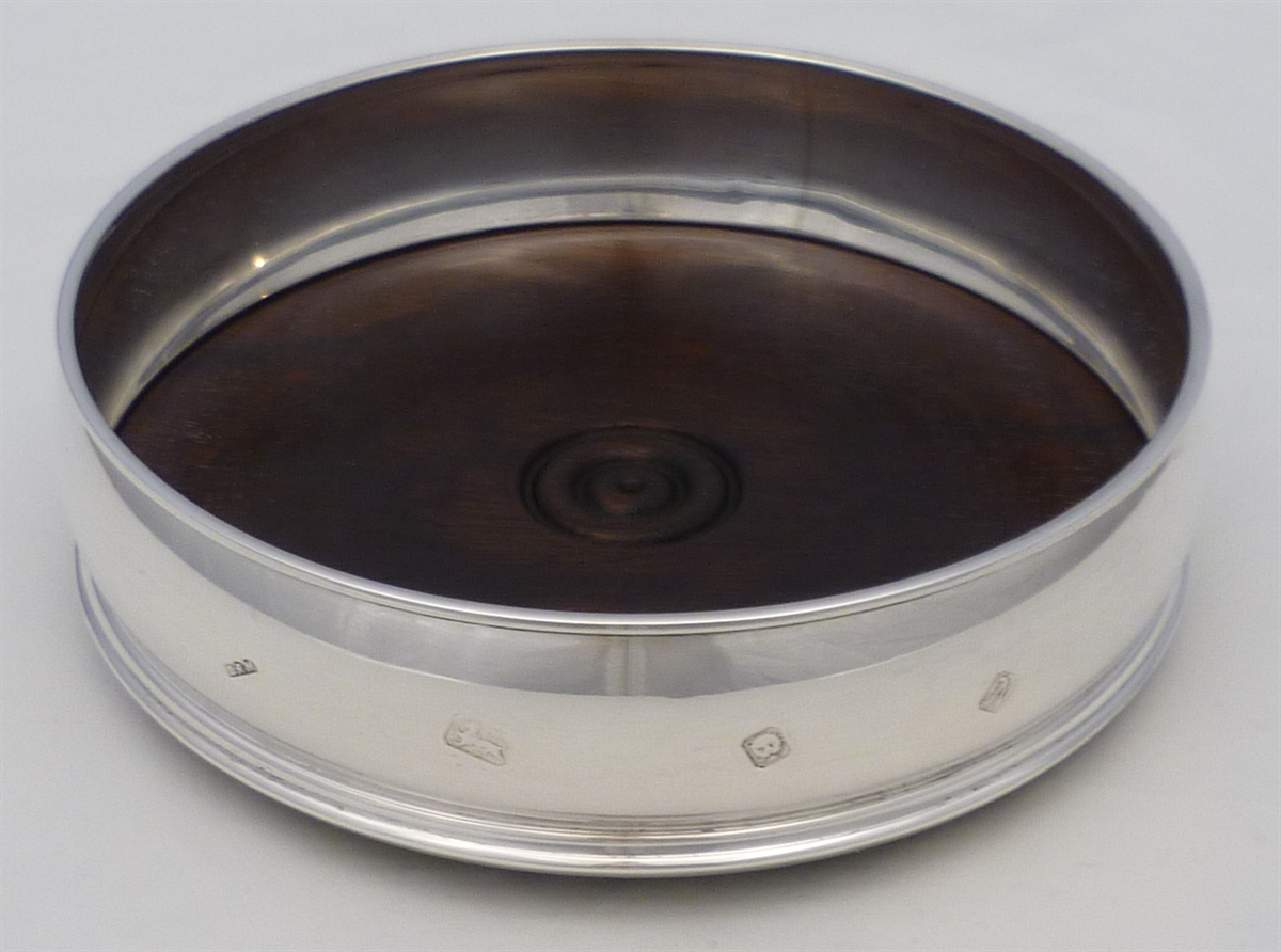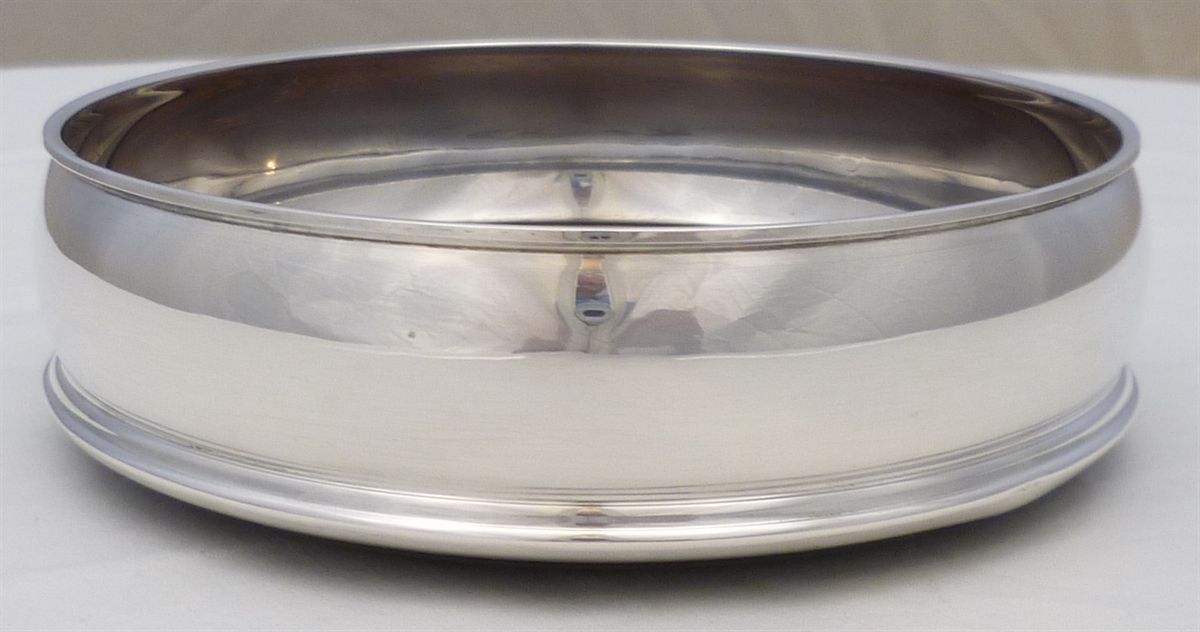 DESCRIPTION | Solid sterling silver decanter or bottle coaster with a turned wood base and a felt bottom. |