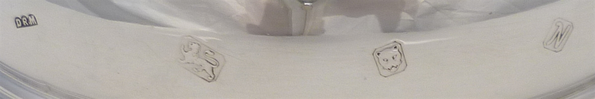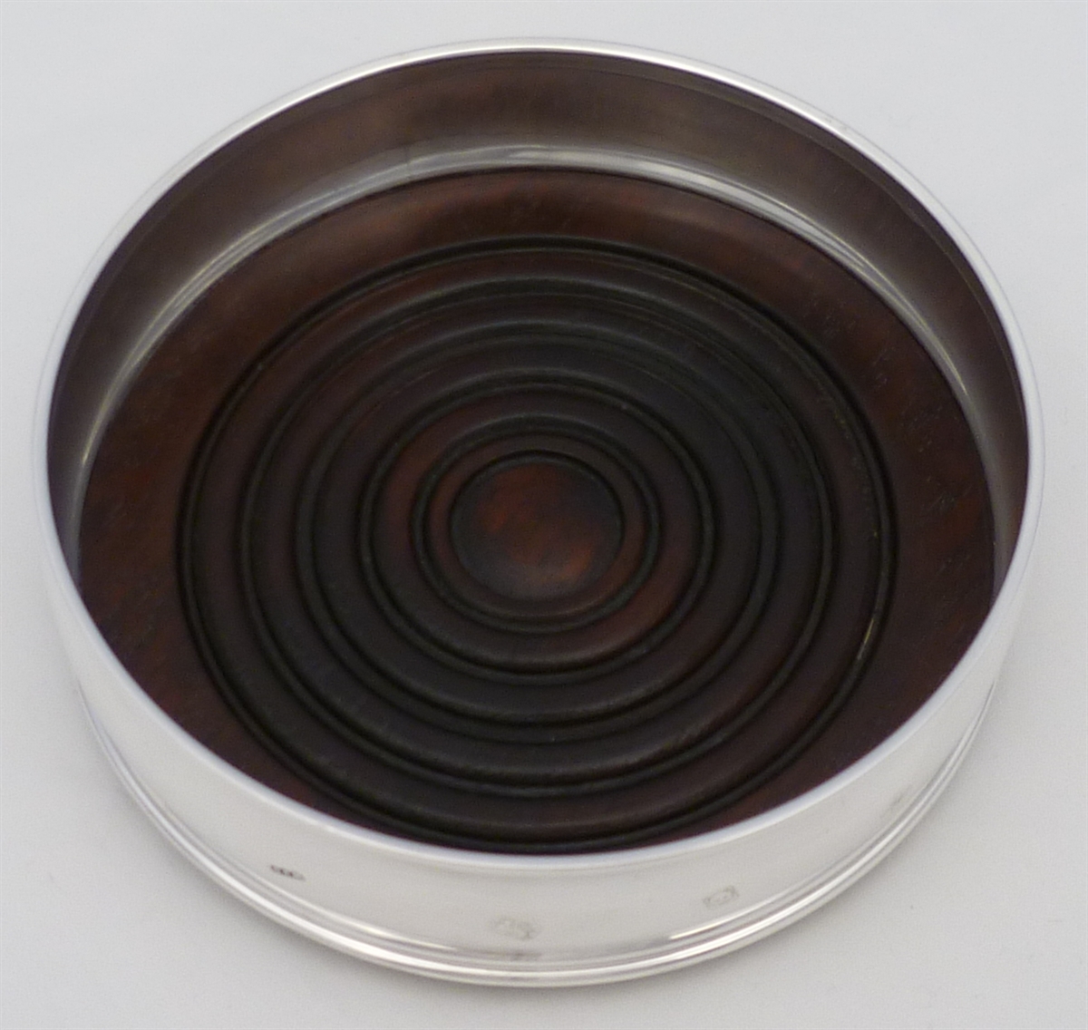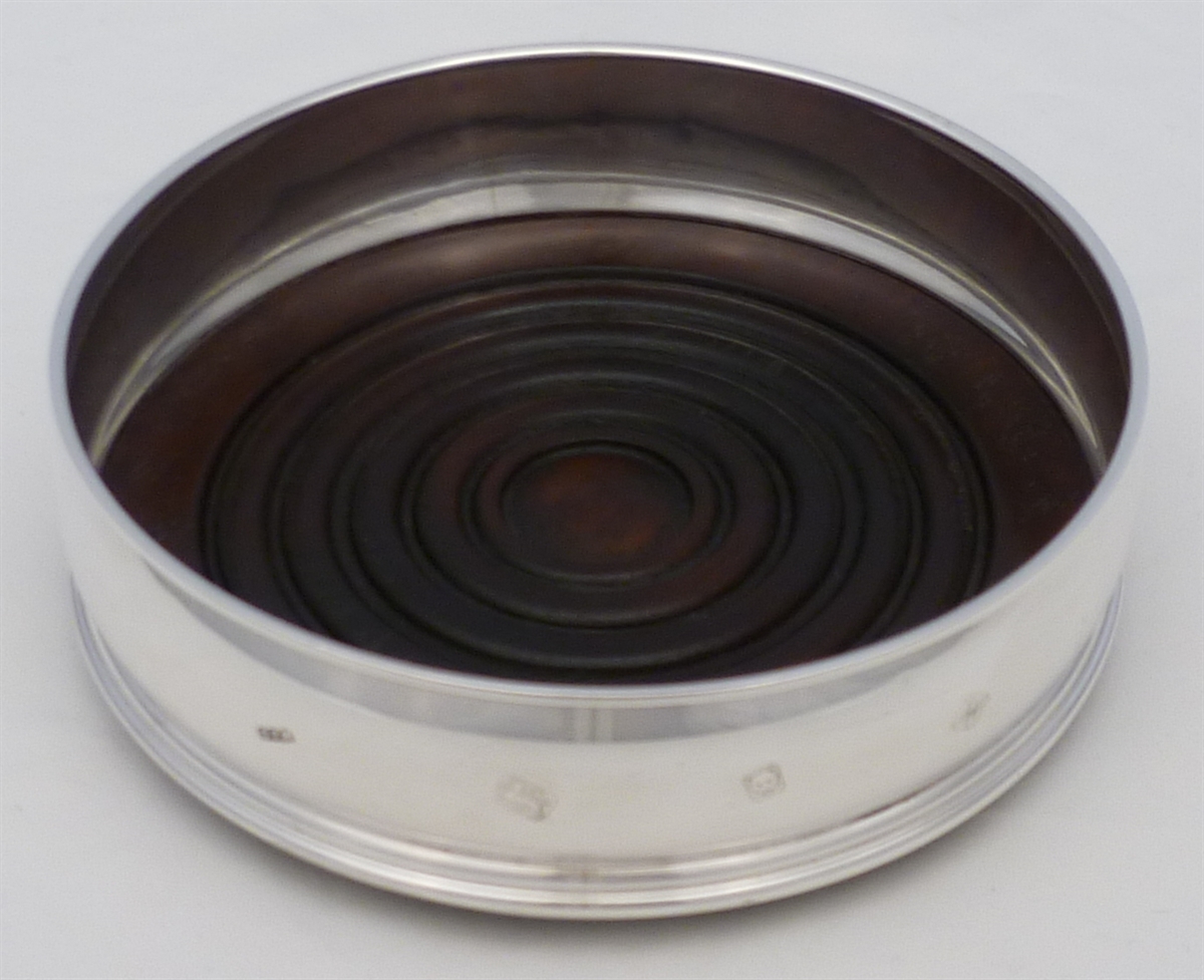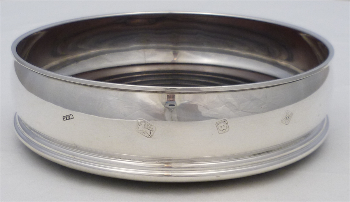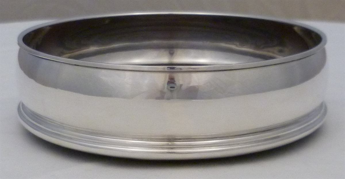 DESCRIPTION | Solid sterling silver decanter or bottle coaster with a turned wood base and a felt bottom. |