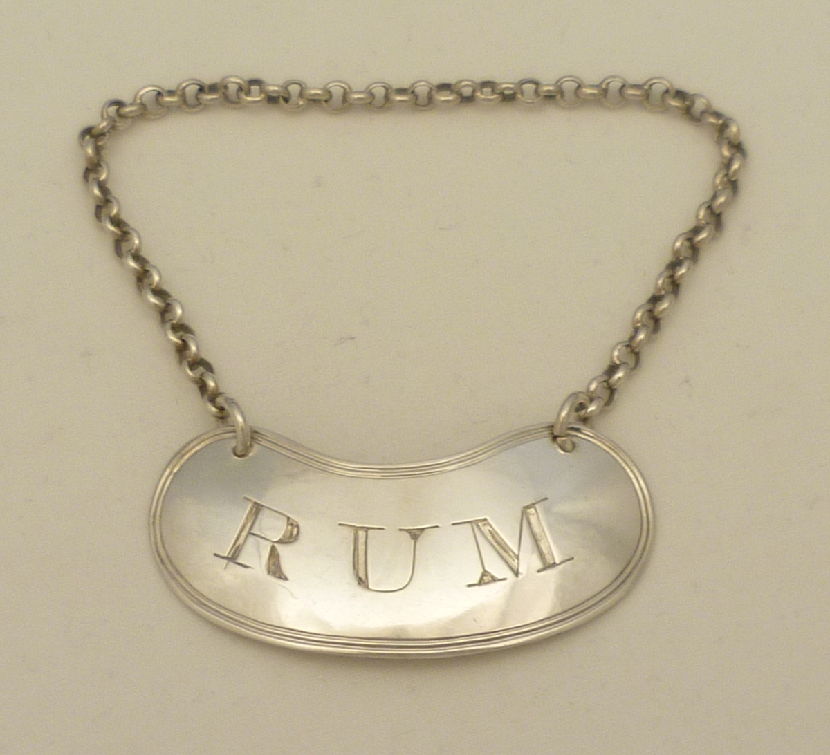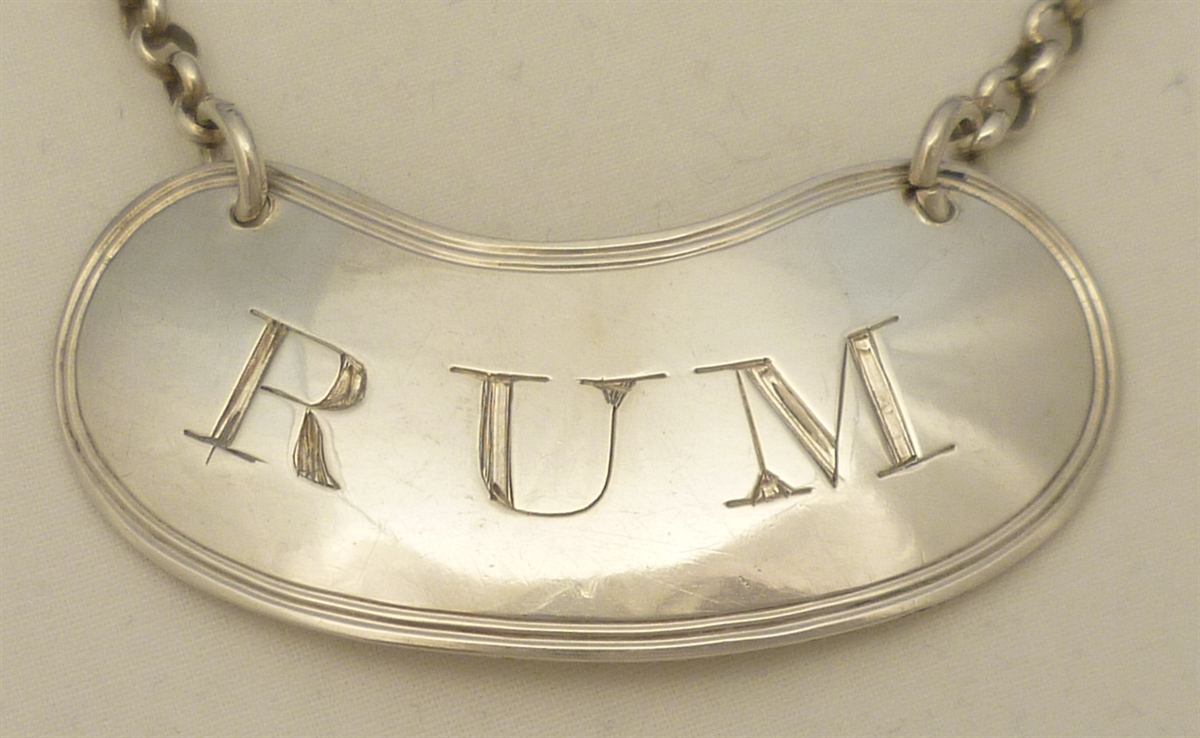 DESCRIPTION | Georgian solid sterling silver 'RUM' label with suspension chain. |