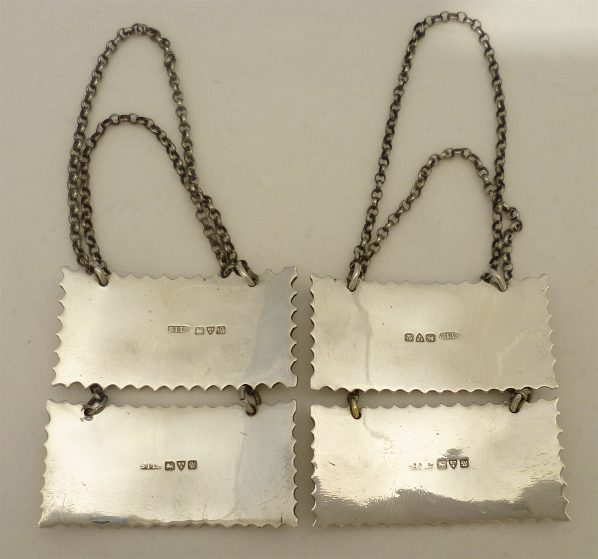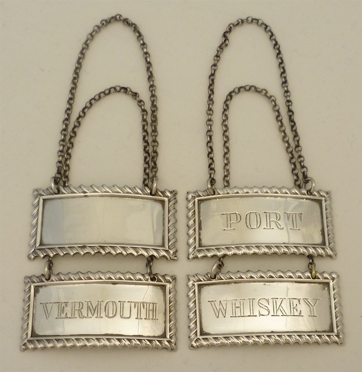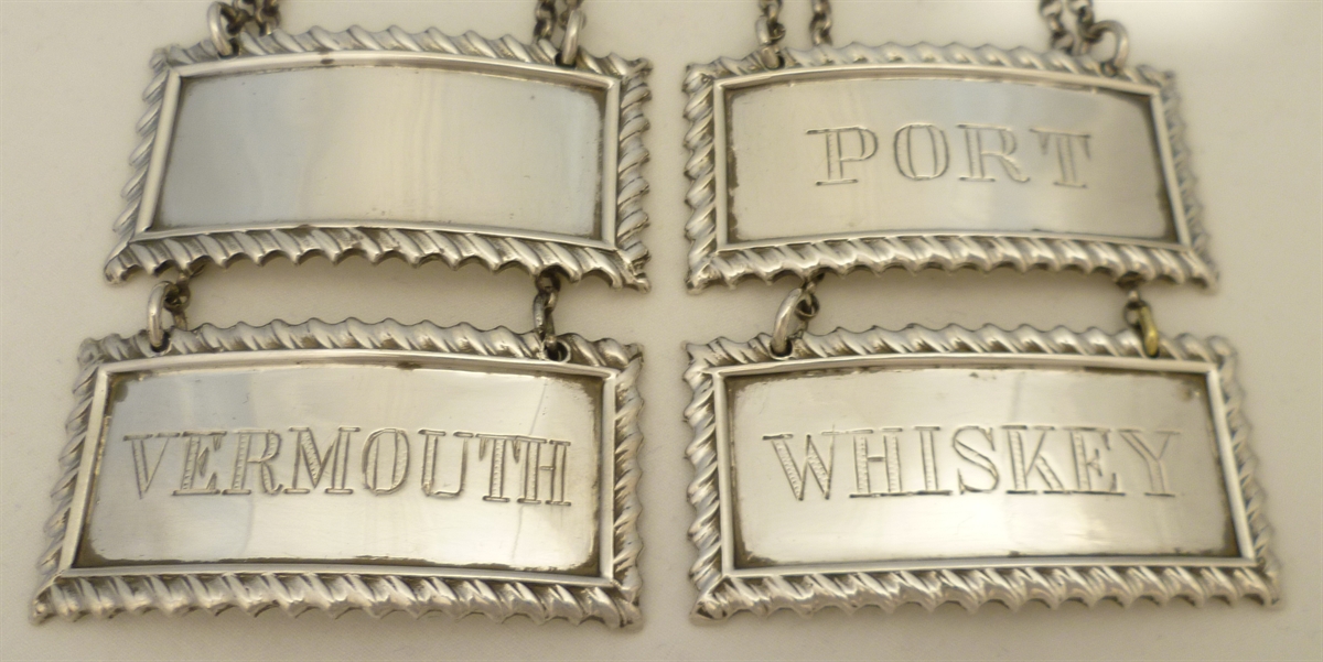 DESCRIPTION | Set of four heavy solid sterling silver wine labels with suspension chains. WHISKEY, VERMOUTH, PORT, blank (no engraving or erasure). |