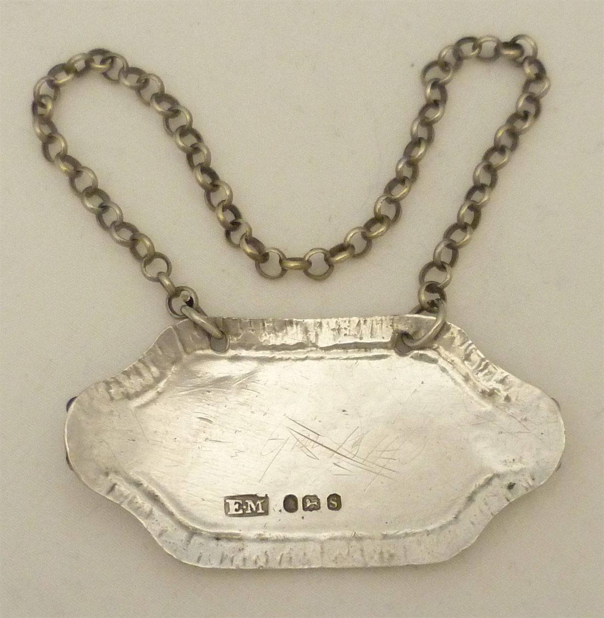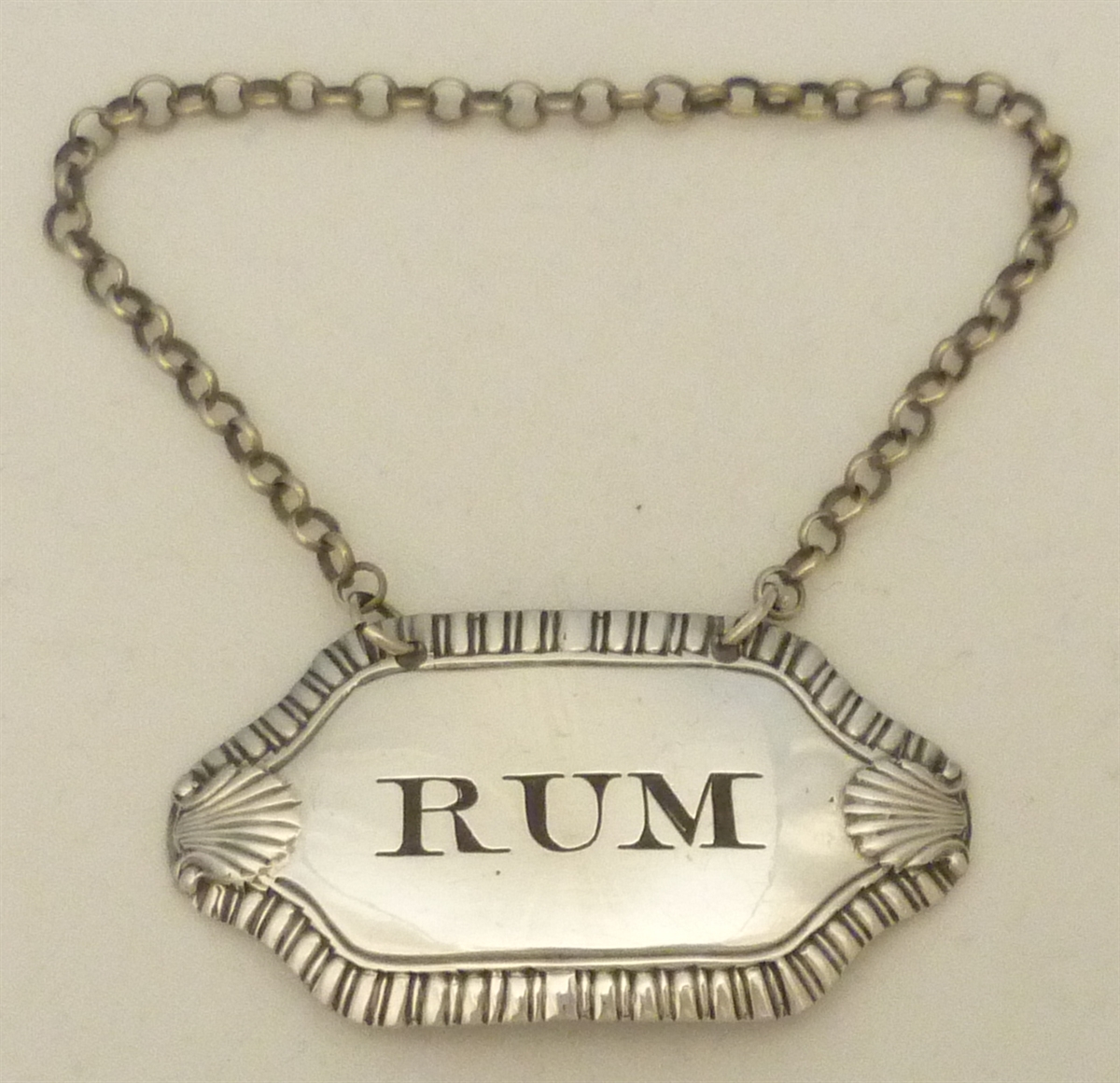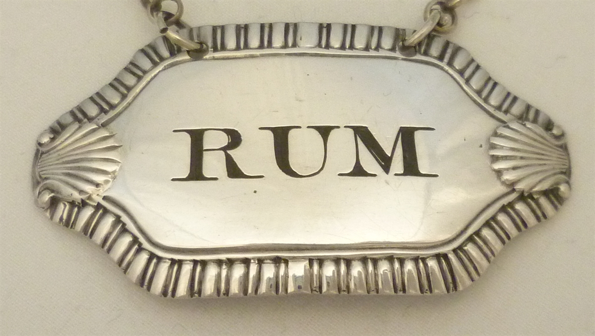 DESCRIPTION | Superb Georgian cast solid sterling silver RUM label with gadroon and shell rim decoration and pitch in-filled letters. |