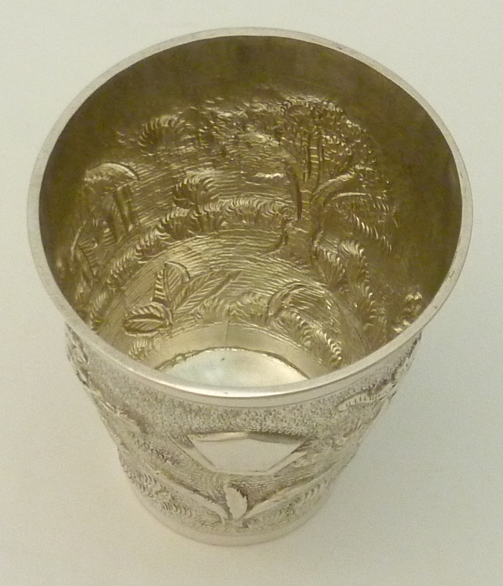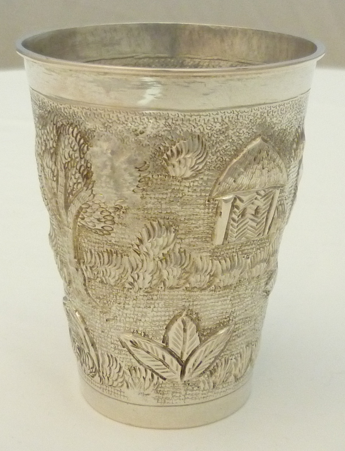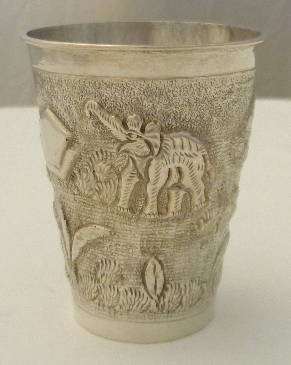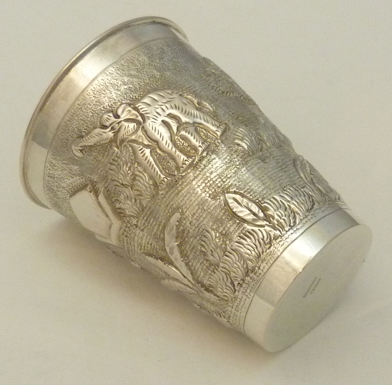 DESCRIPTION | Asian solid silver wine cup with embossed and engraved decoration of rural scenes featuring an Indian elephant and a blank pentagonal cartouche. |