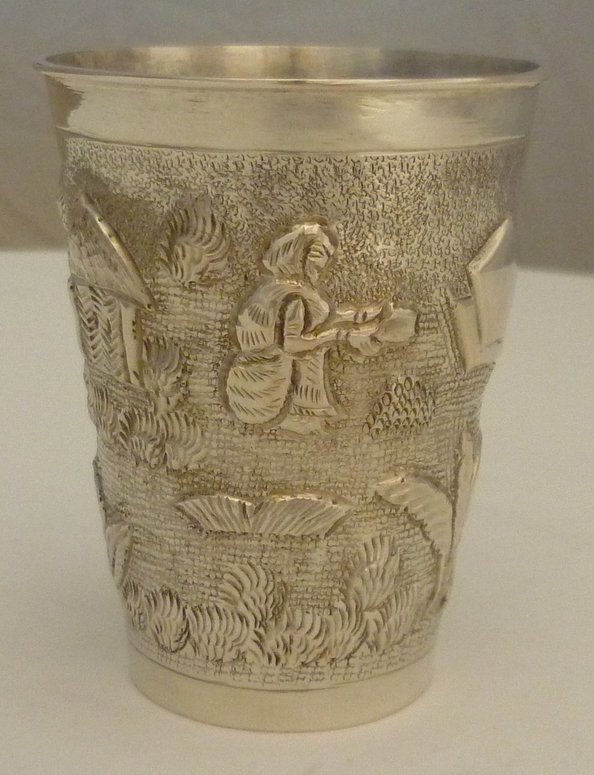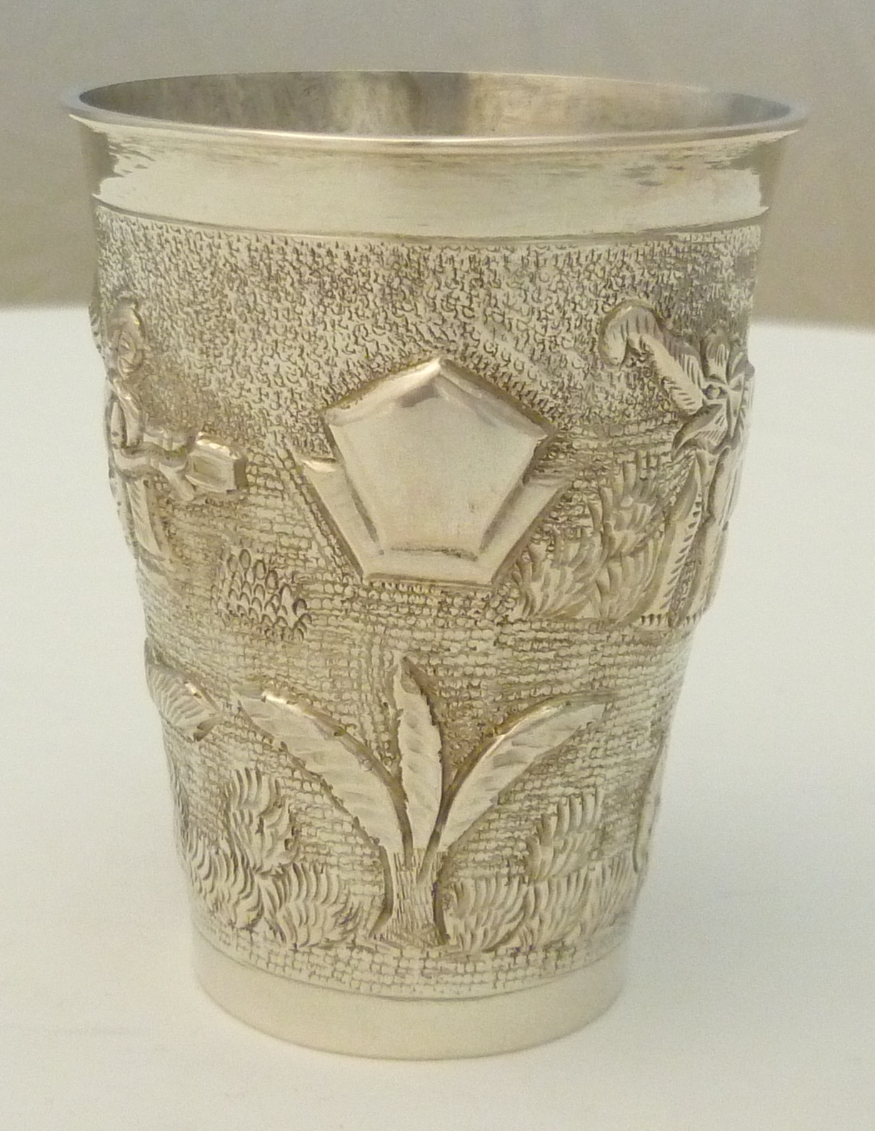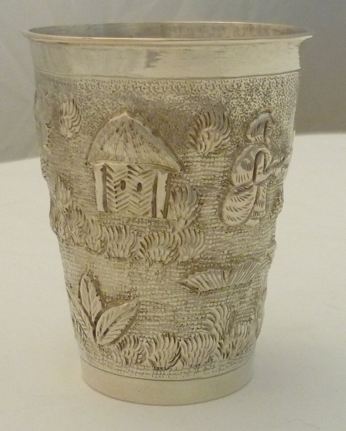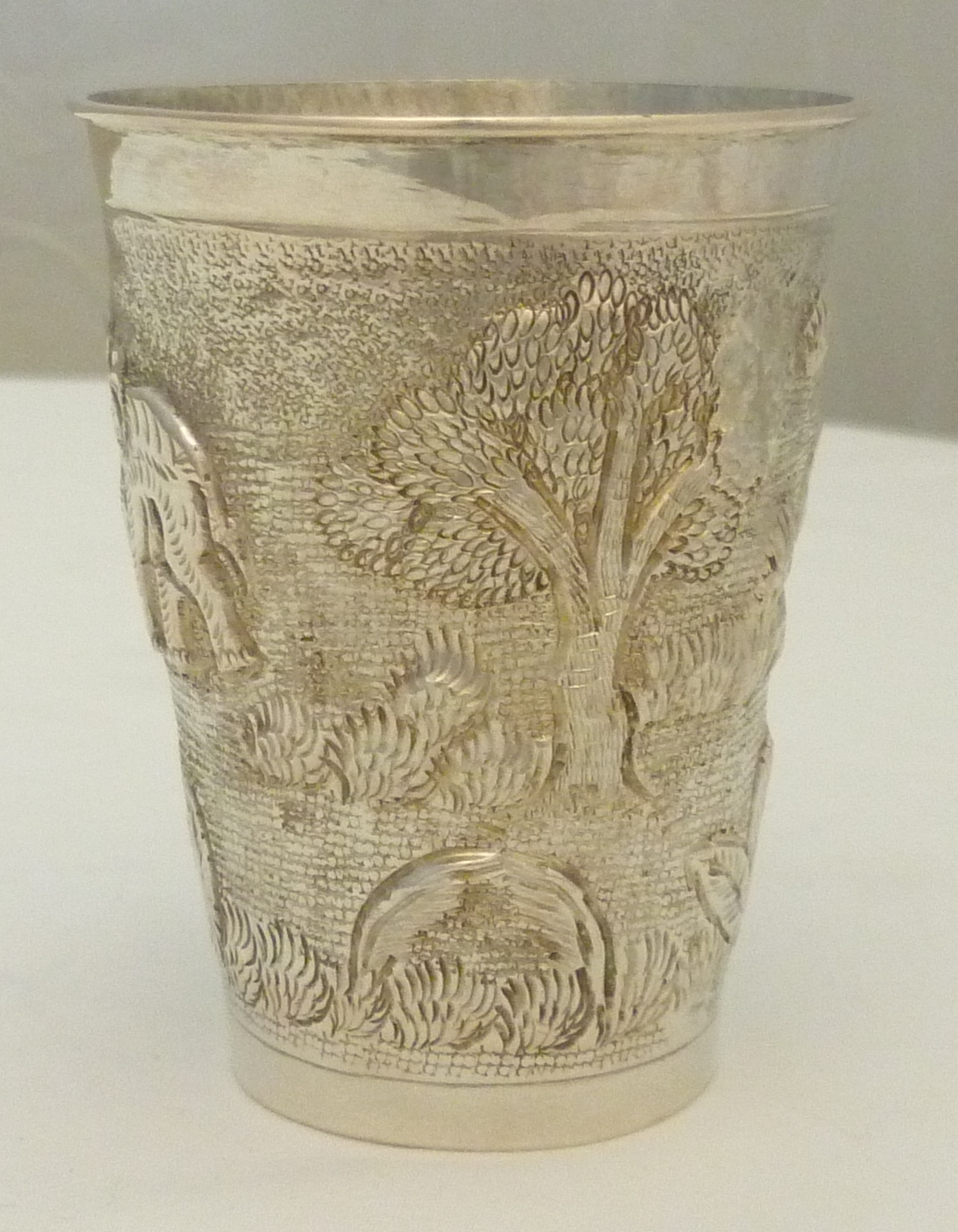 DESCRIPTION | Asian solid silver wine cup with embossed and engraved decoration of rural scenes featuring an Indian elephant and a blank pentagonal cartouche. |