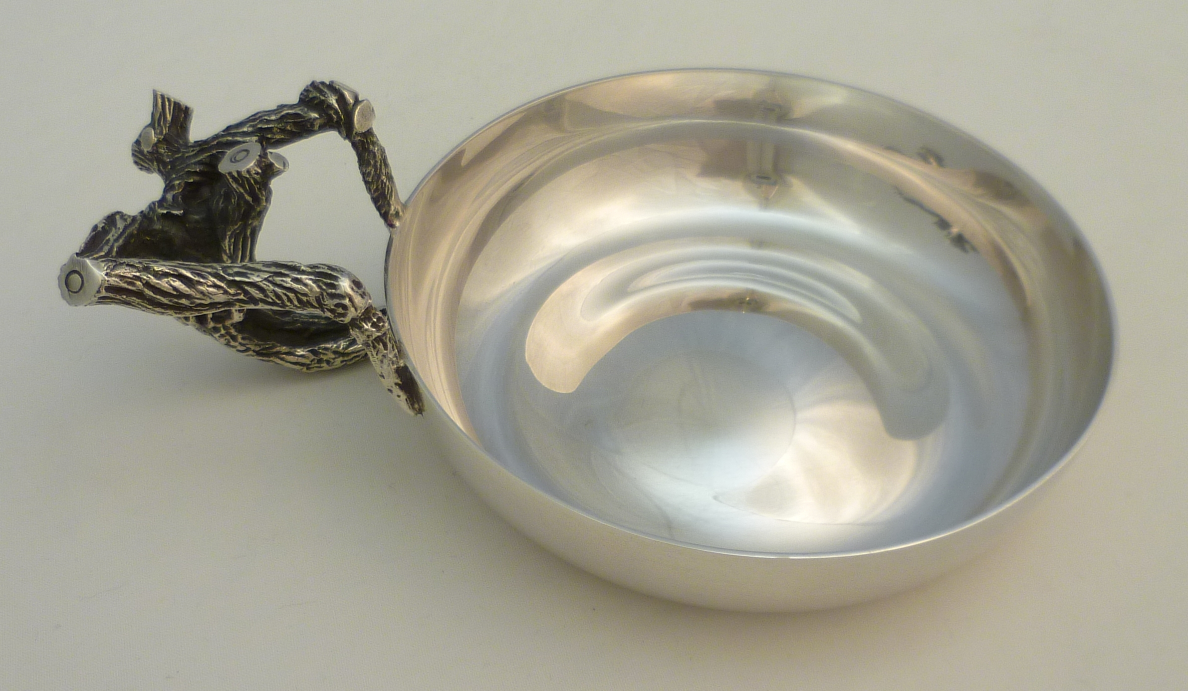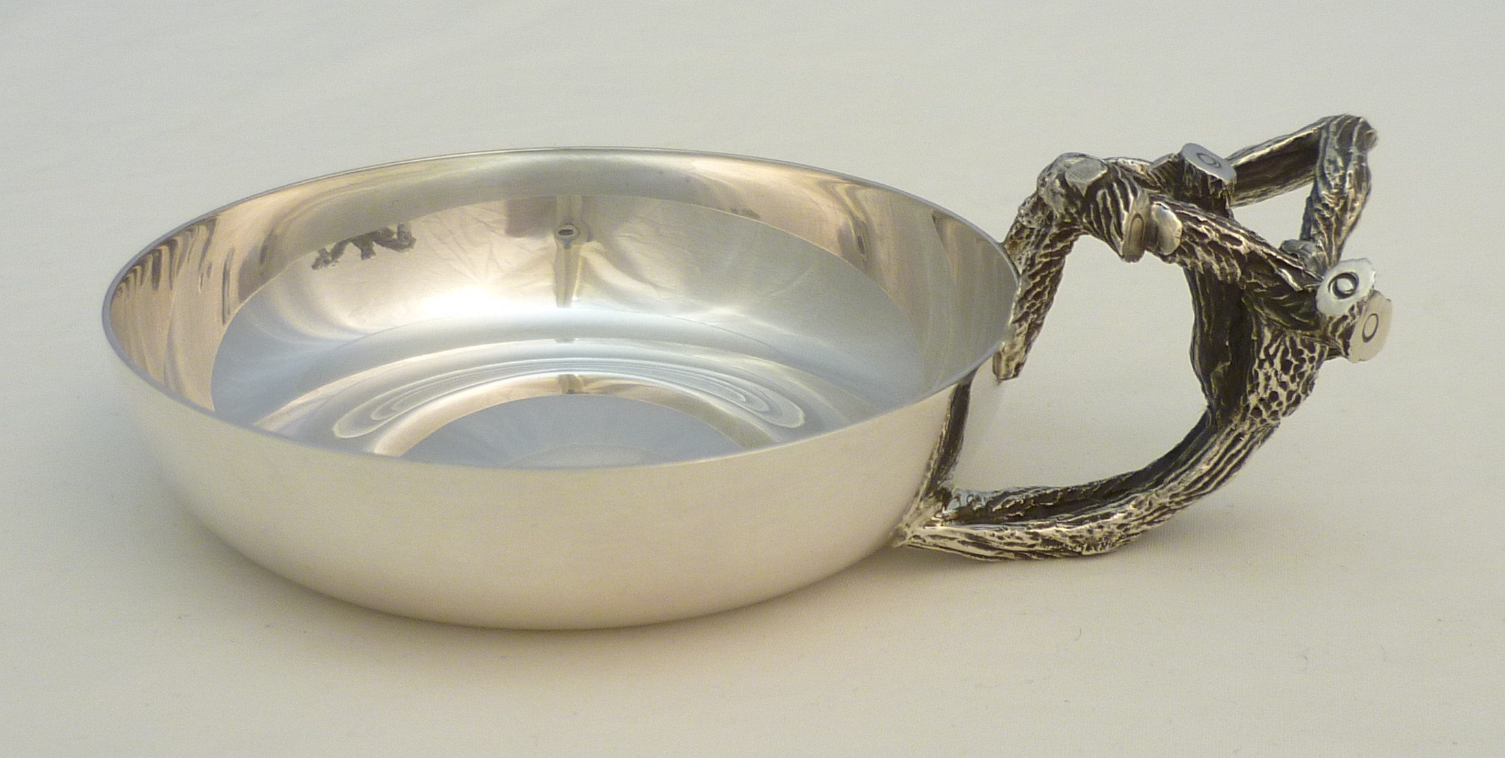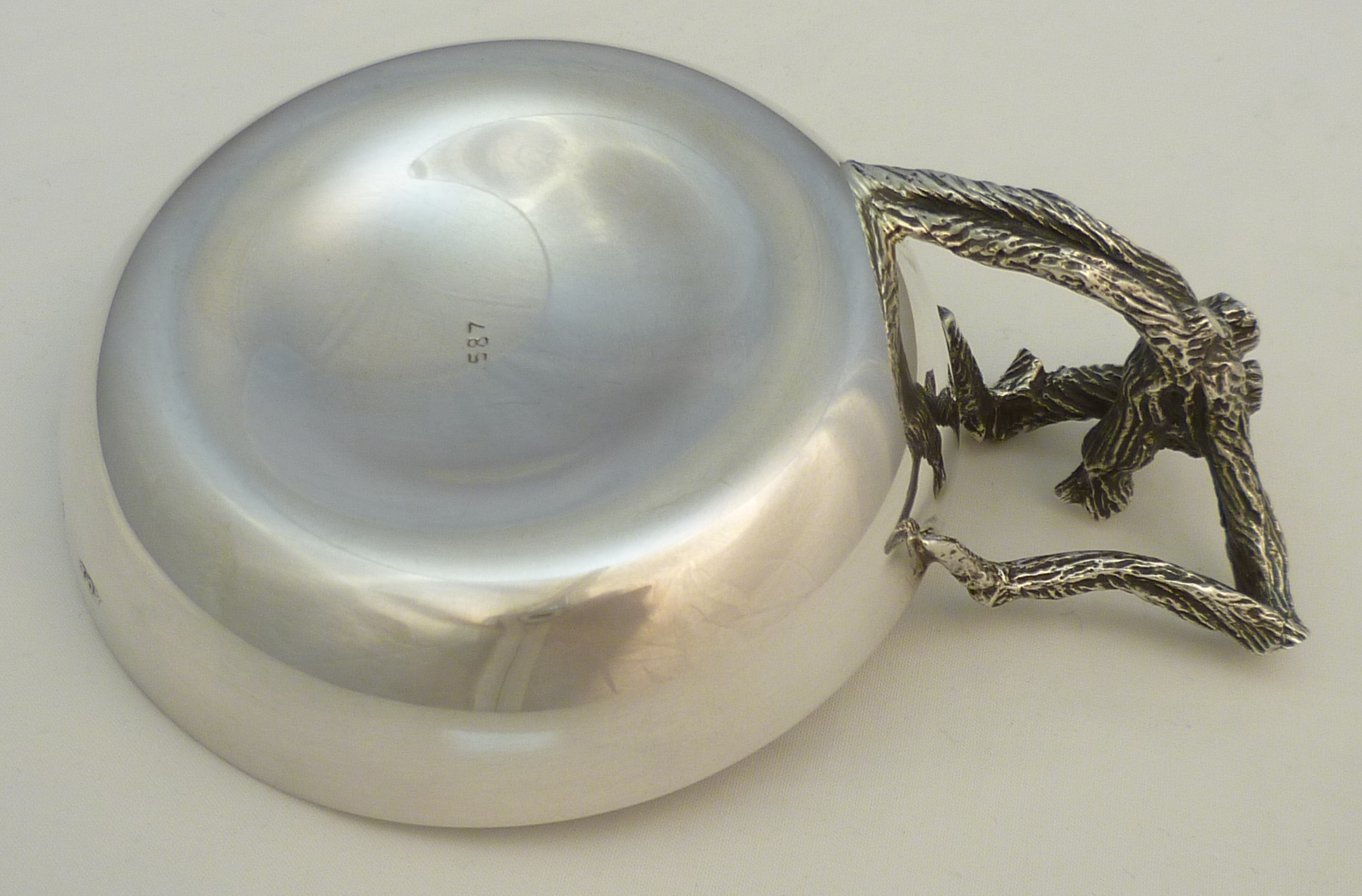 DESCRIPTION | Beautiful, high quality solid sterling silver wine taster with naturalistic handle and original box. |