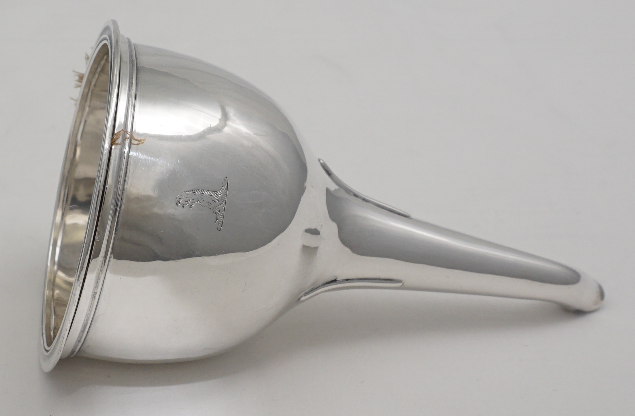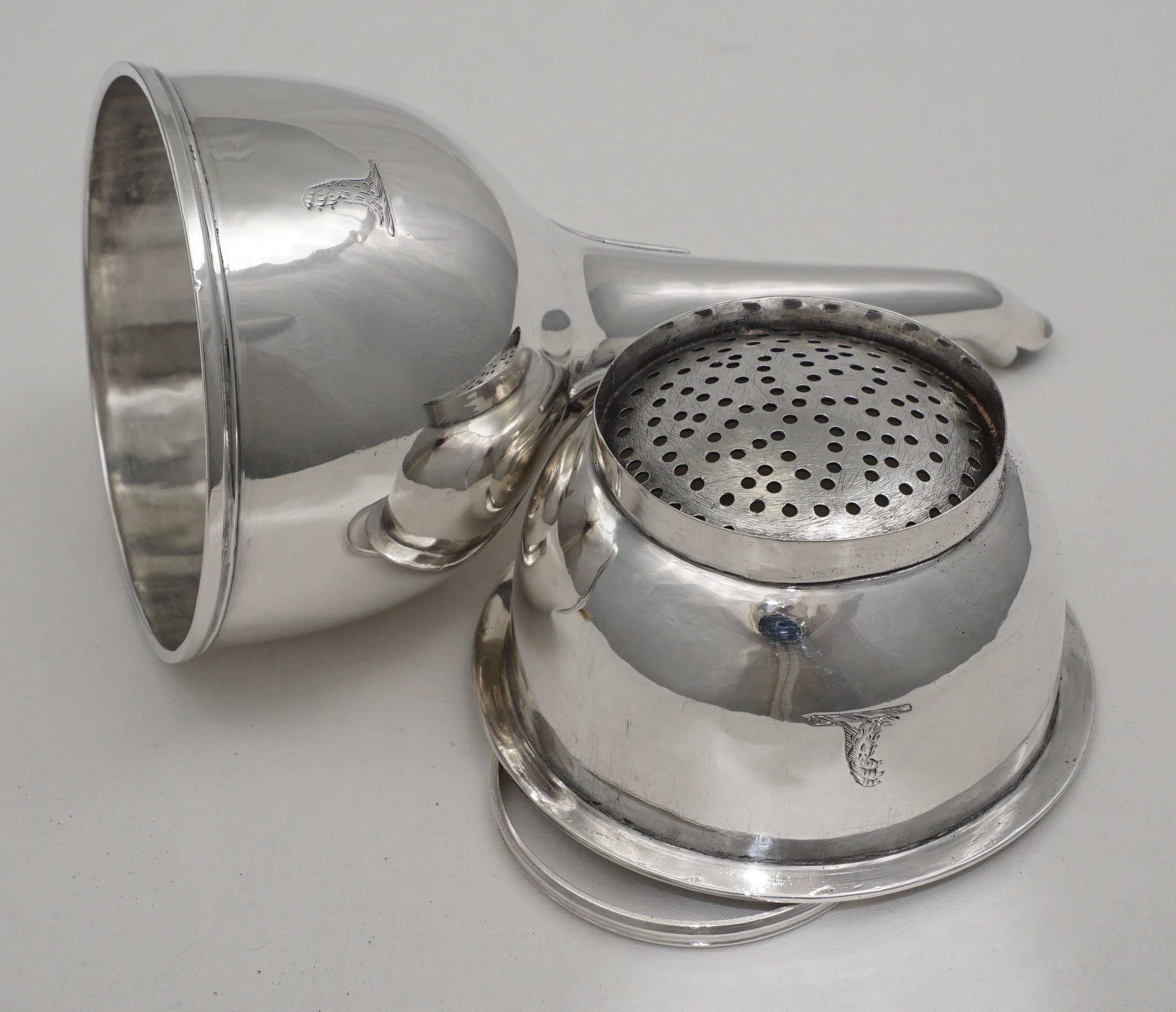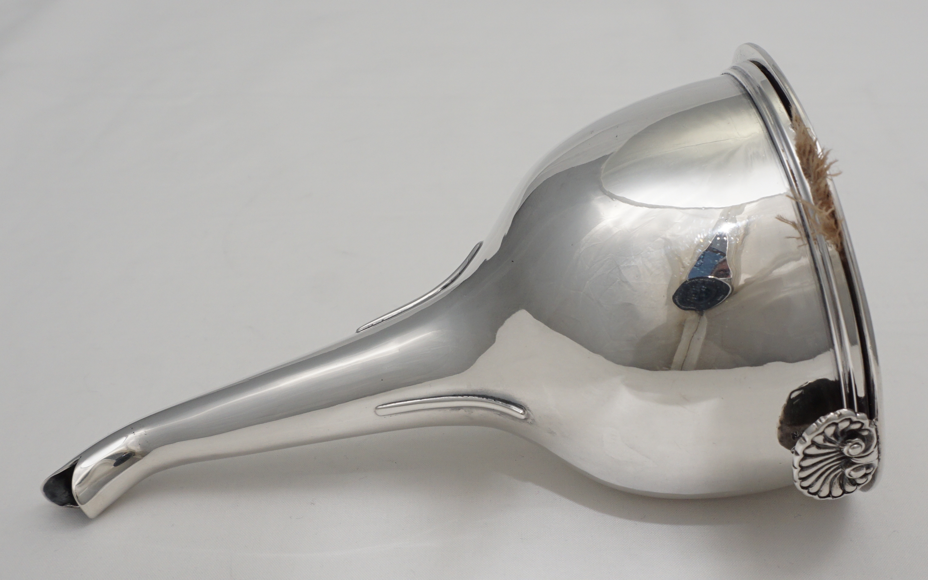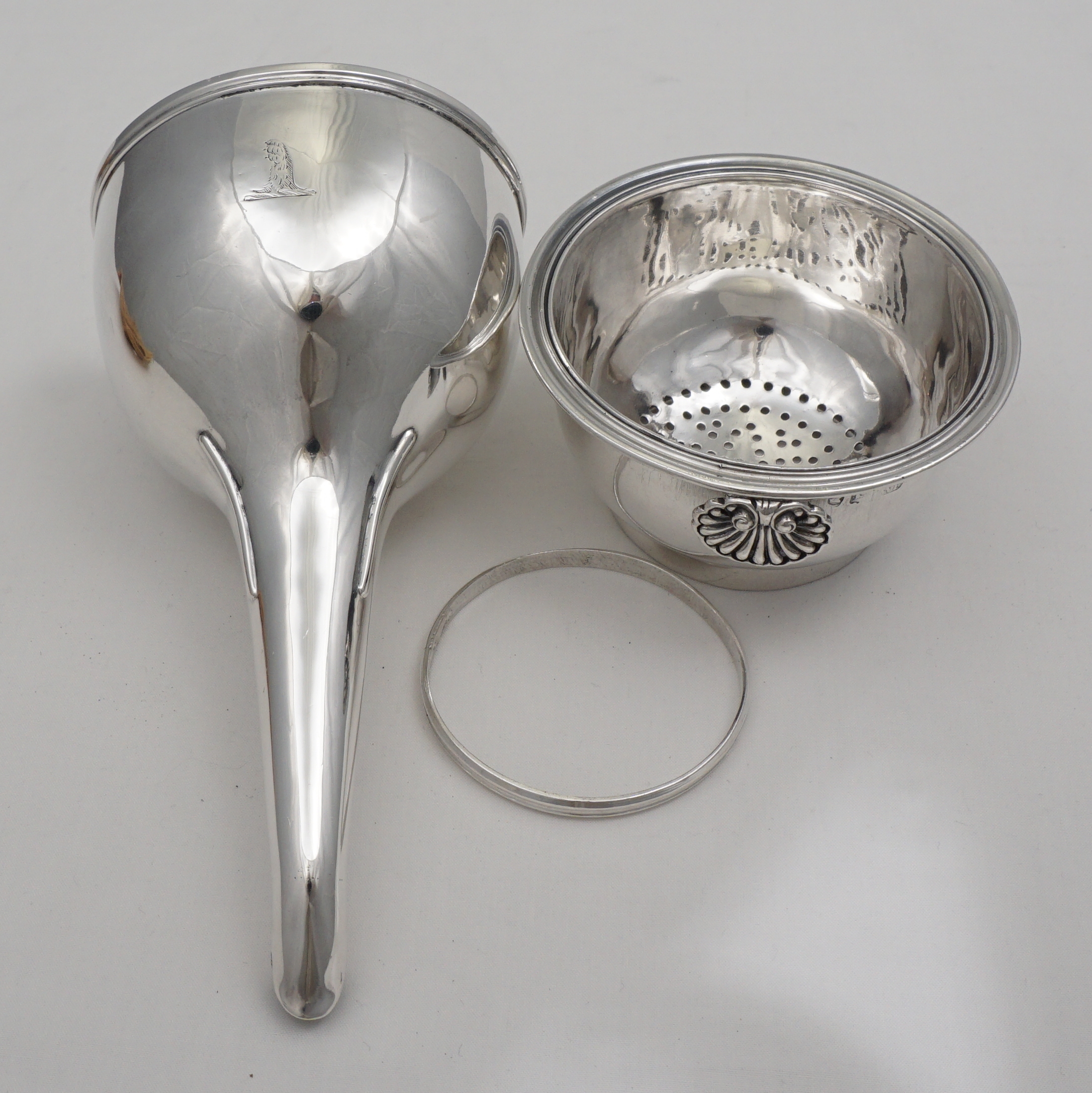 DESCRIPTION | Superb antique English Georgian solid sterling silver wine funnel with thread decorated top rims, cast shell tang, original silver strainer section and muslin ring. Full set of hallmarks to main body and matching partial hallmarks to strainer and ring showing that the pieces have always been together. Pretty little crest, repeated on the strainer, is of a vertical lion's gamb (gamb = late Latin thence old French for animal's leg). |