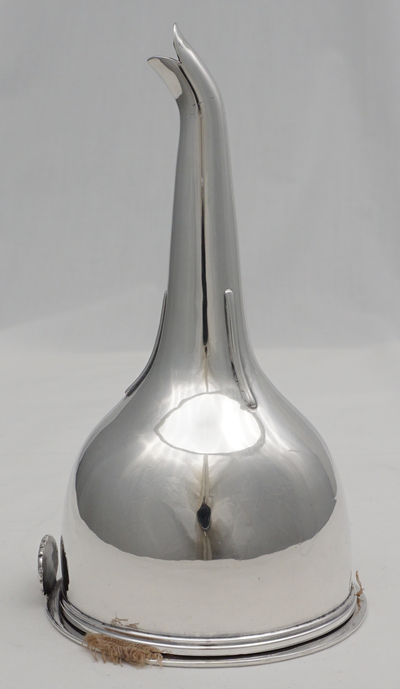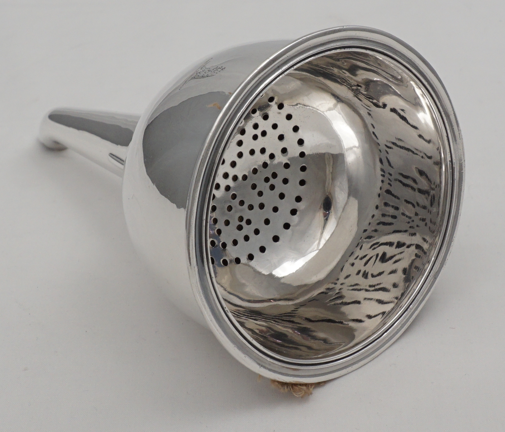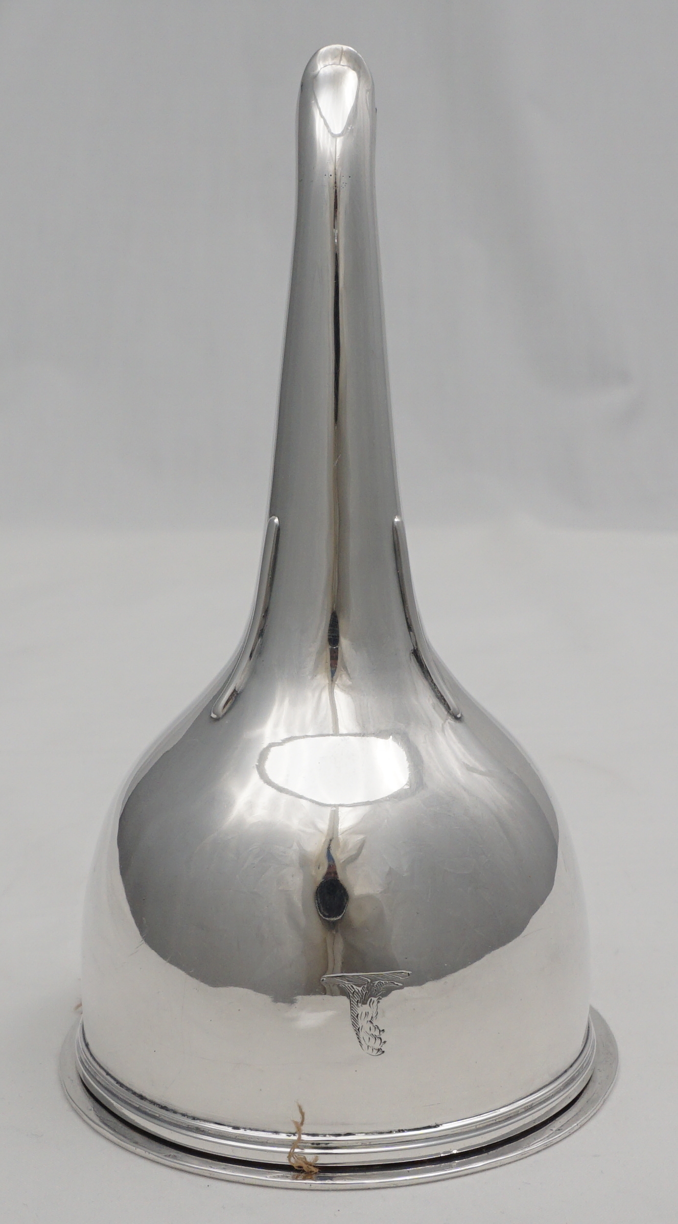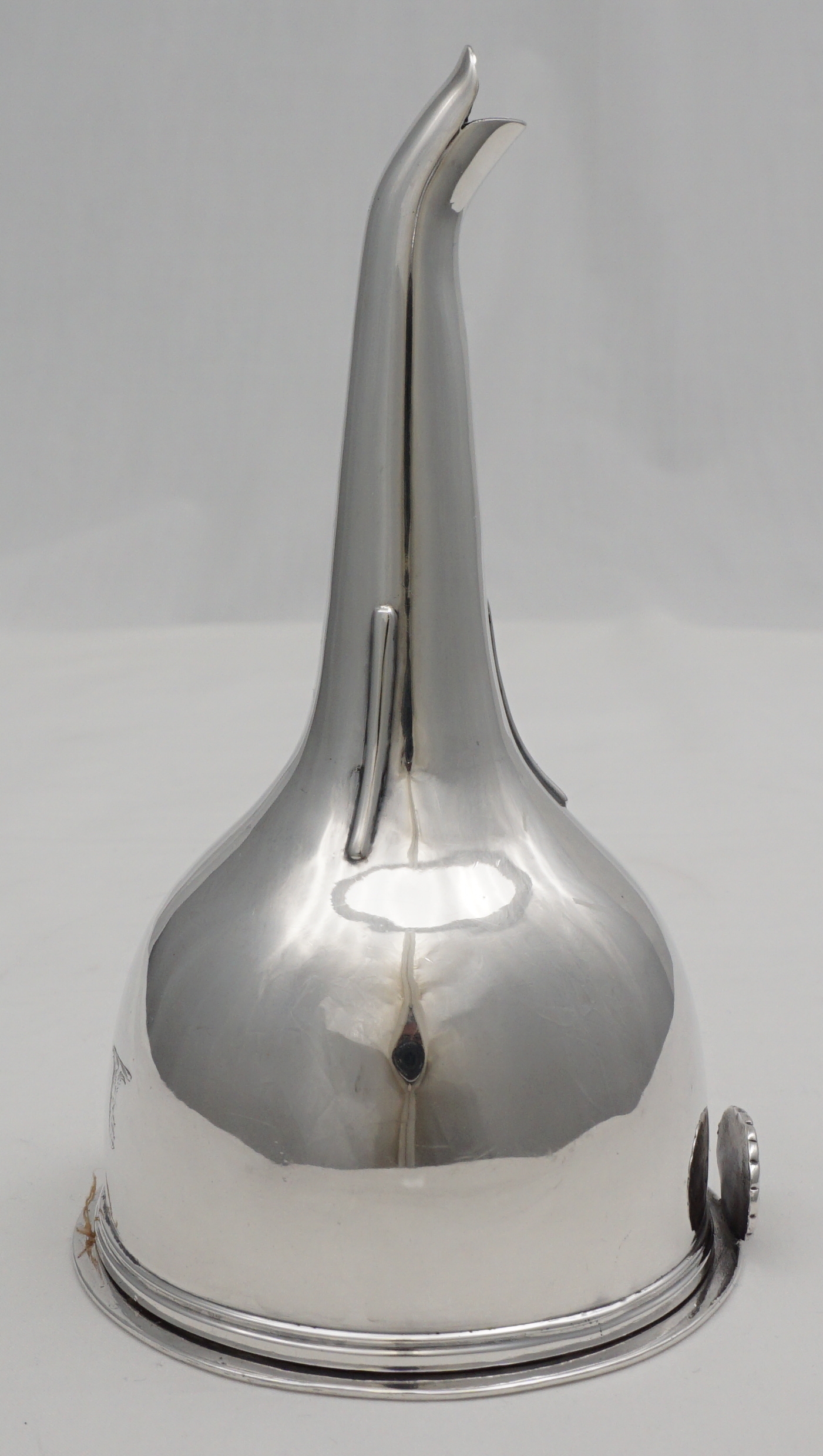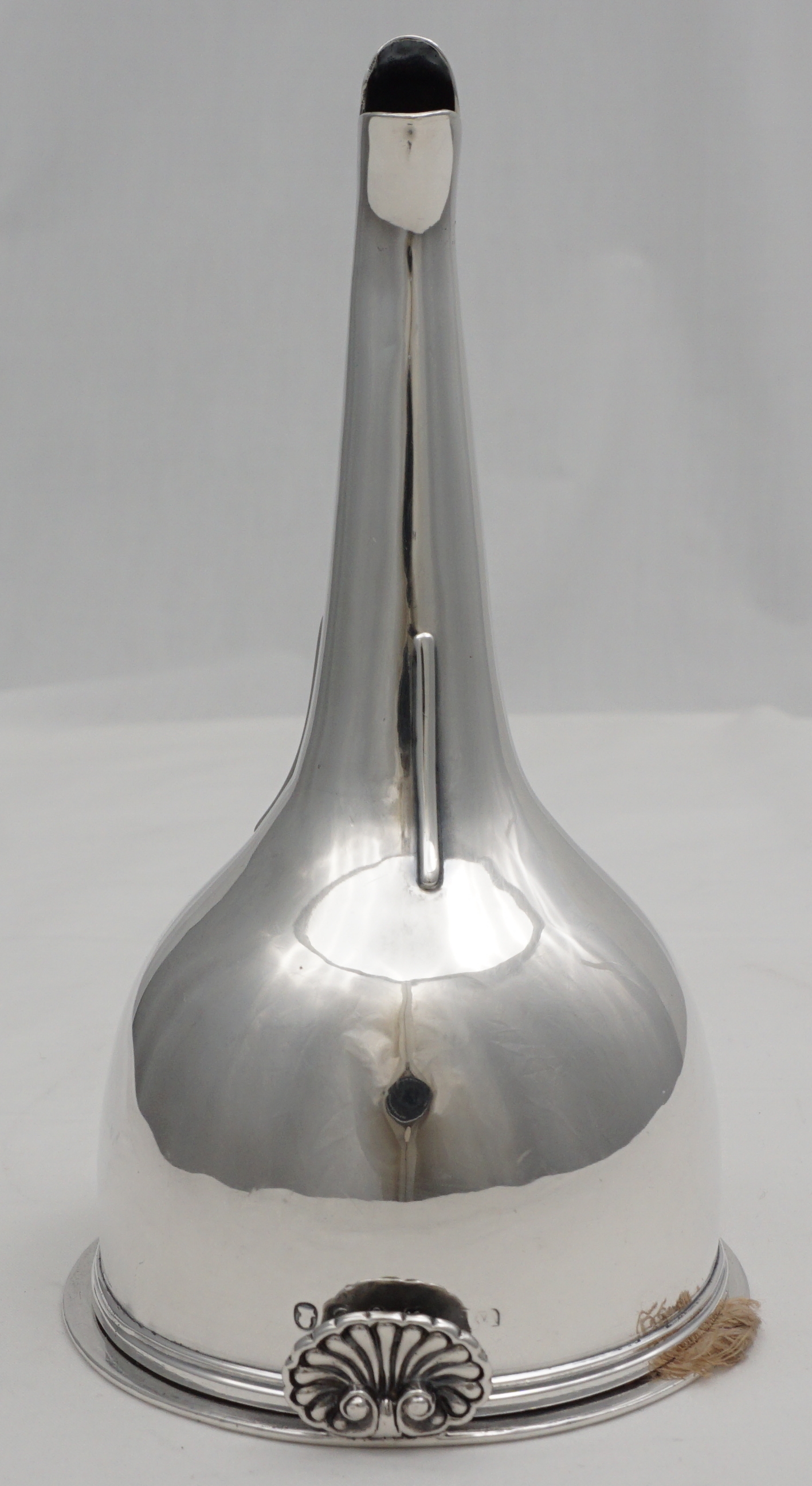 DESCRIPTION | Superb antique English Georgian solid sterling silver wine funnel with thread decorated top rims, cast shell tang, original silver strainer section and muslin ring. Full set of hallmarks to main body and matching partial hallmarks to strainer and ring showing that the pieces have always been together. Pretty little crest, repeated on the strainer, is of a vertical lion's gamb (gamb = late Latin thence old French for animal's leg). |