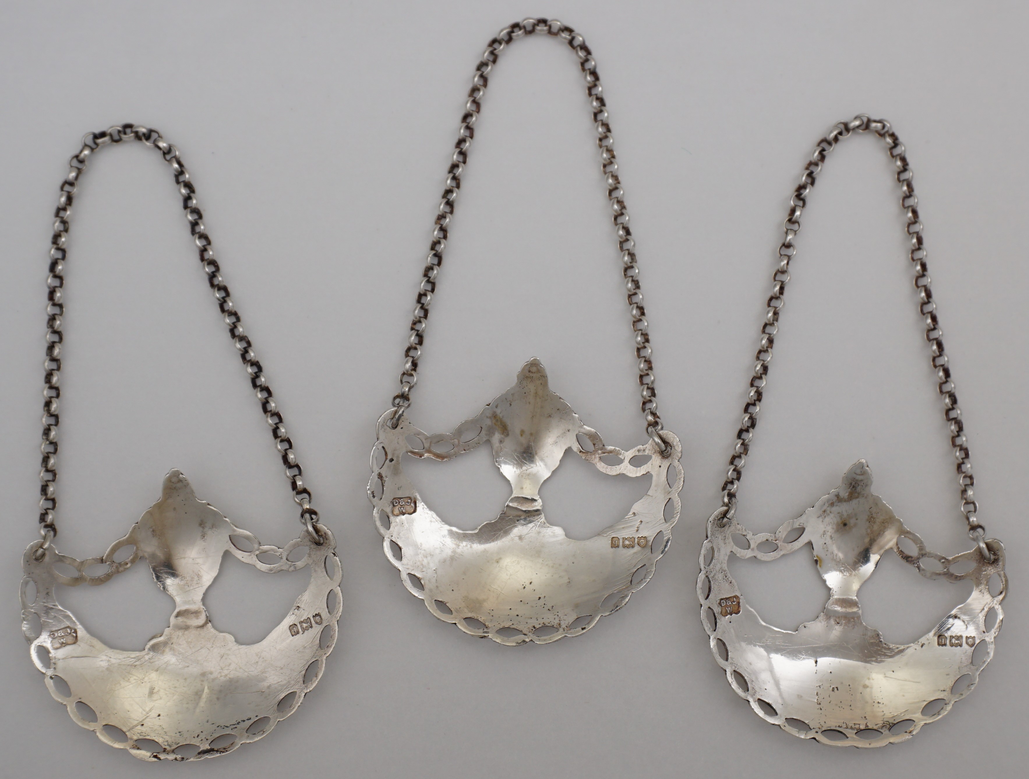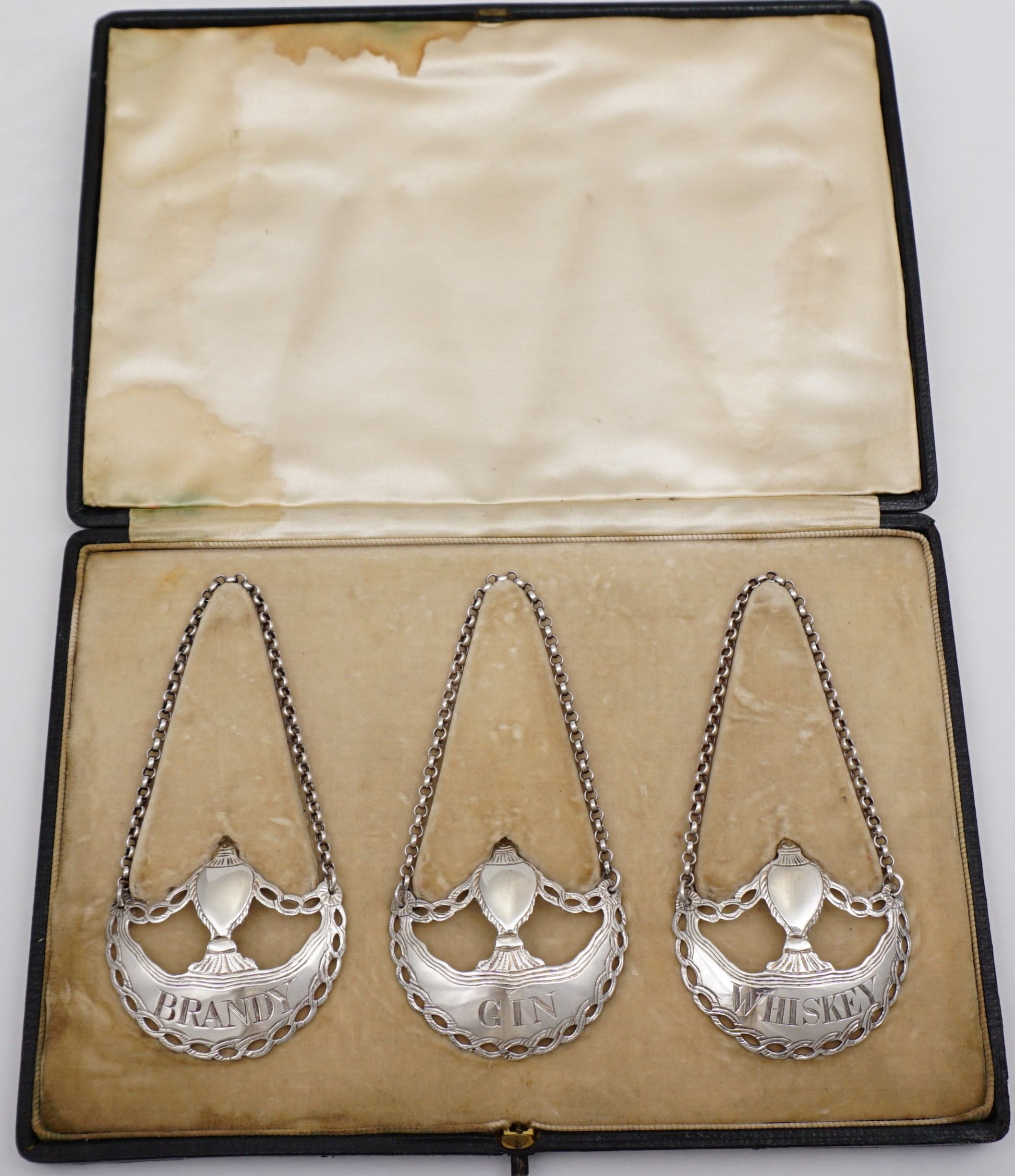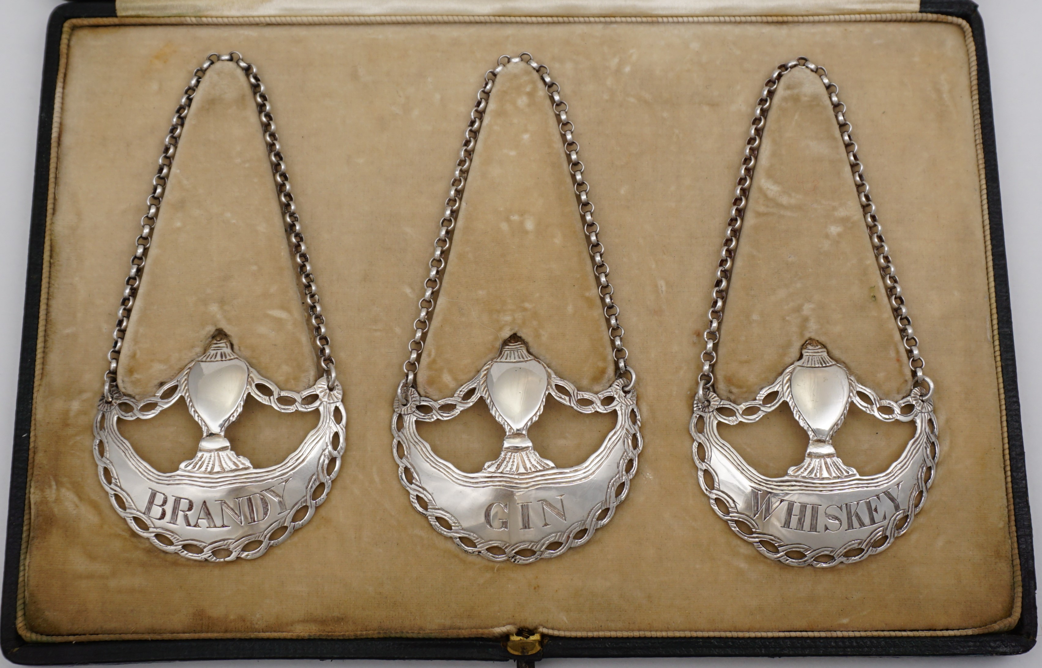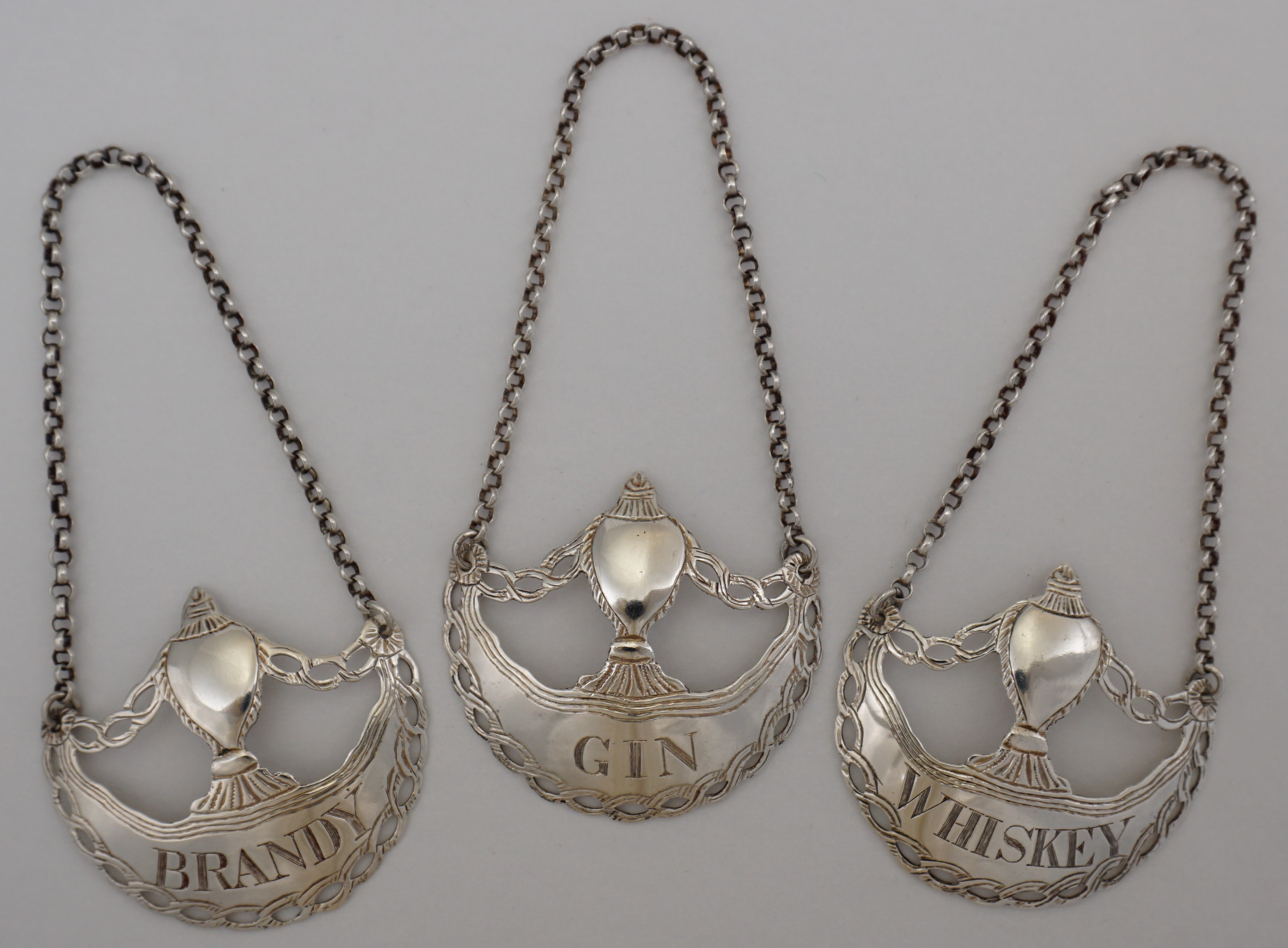 DESCRIPTION | Cased set of three high quality antique English cast solid sterling silver spirit labels in the neo-classical urn form innovated by Hester Bateman and her family in the late 18th century. |