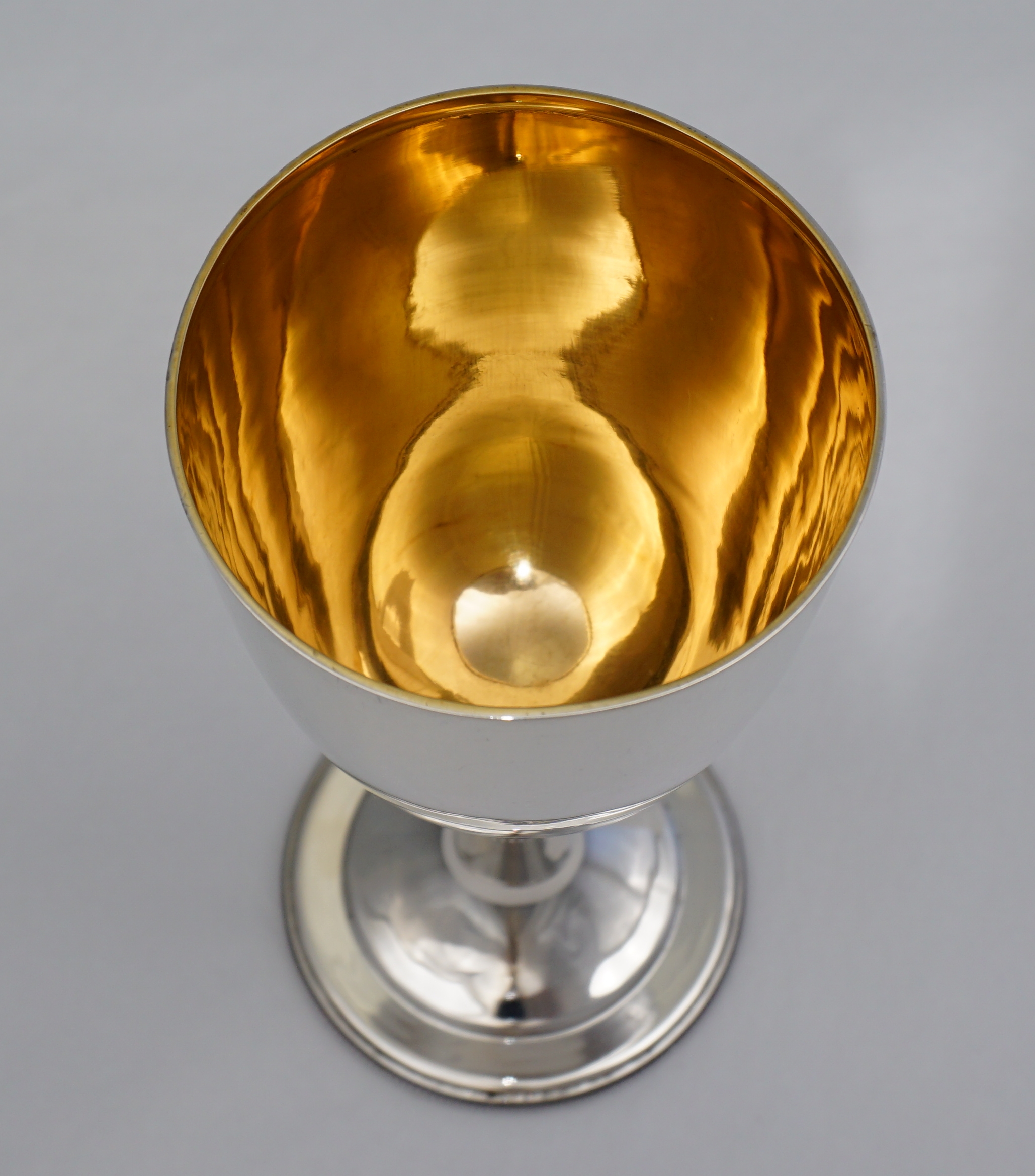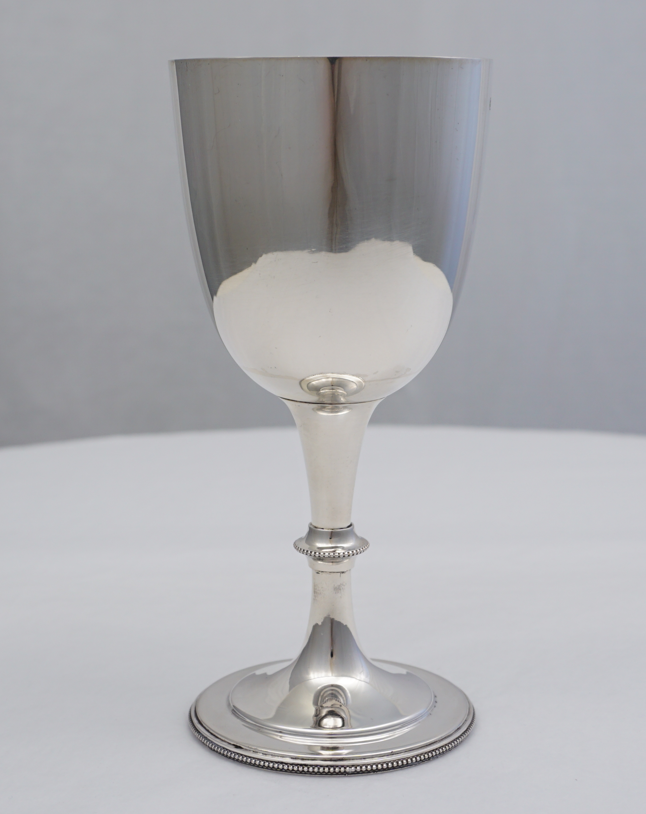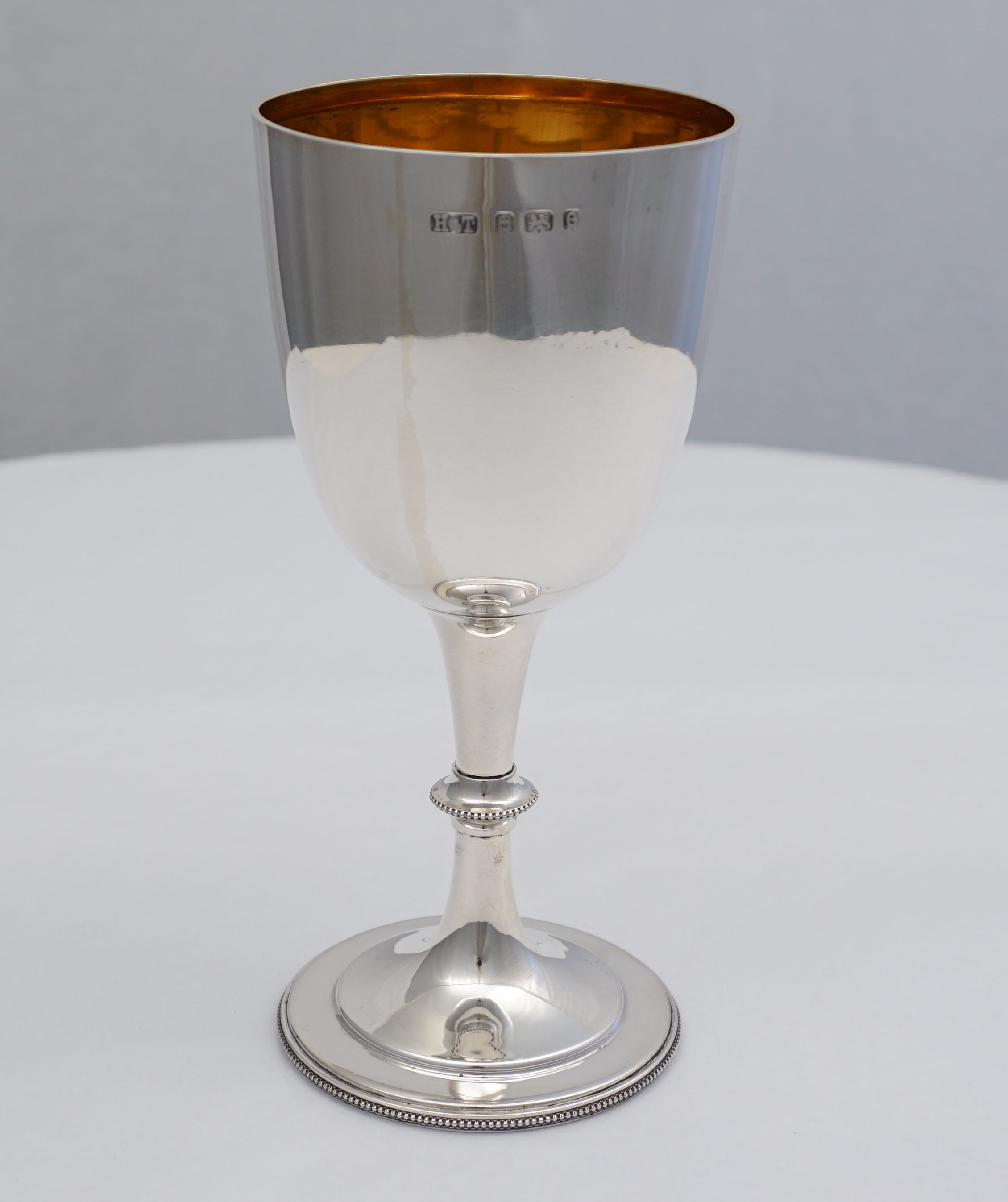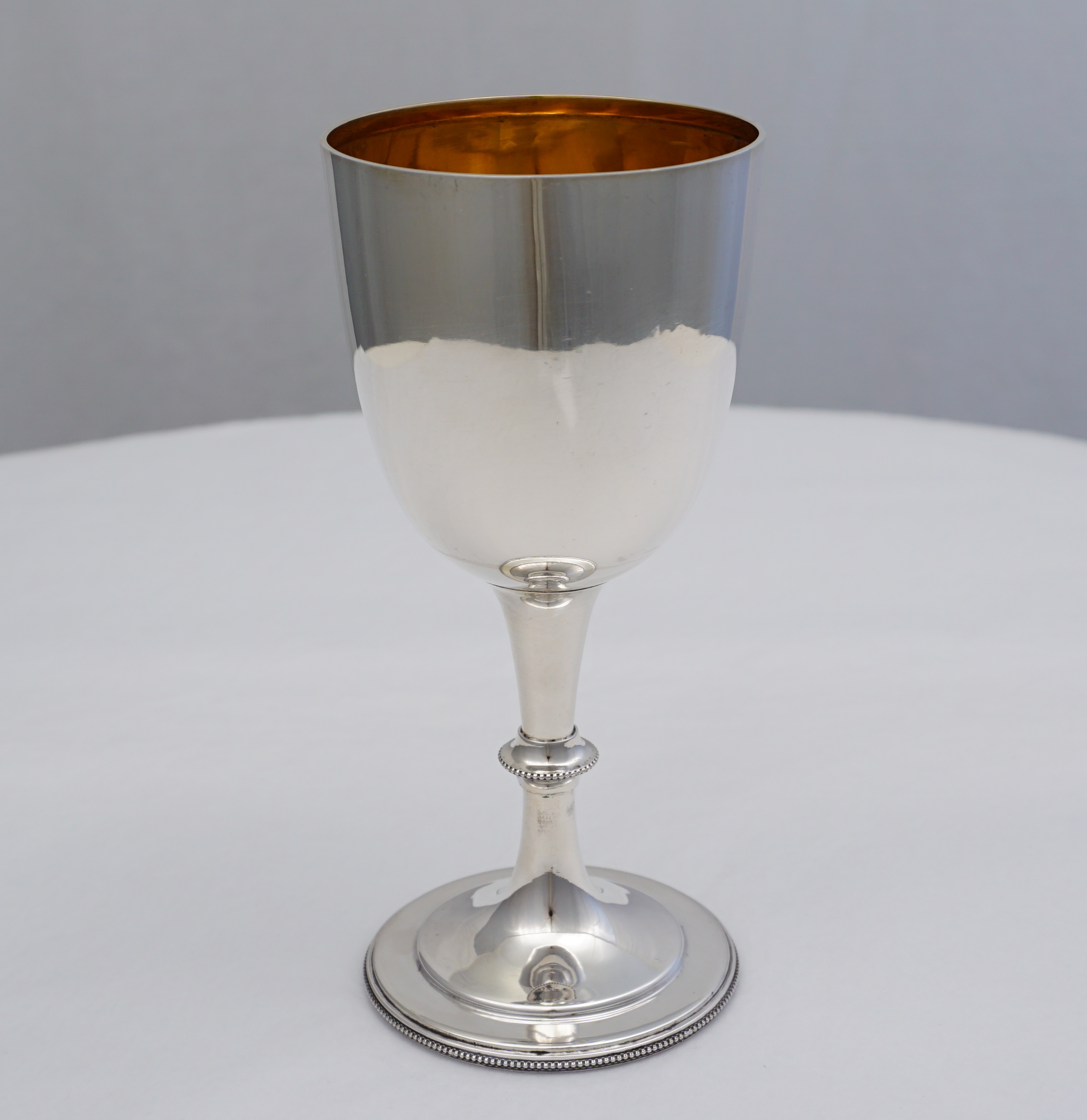 DESCRIPTION | Beautiful antique Edwardian English solid sterling silver goblet with bead edge decoration and a gilded interior. |