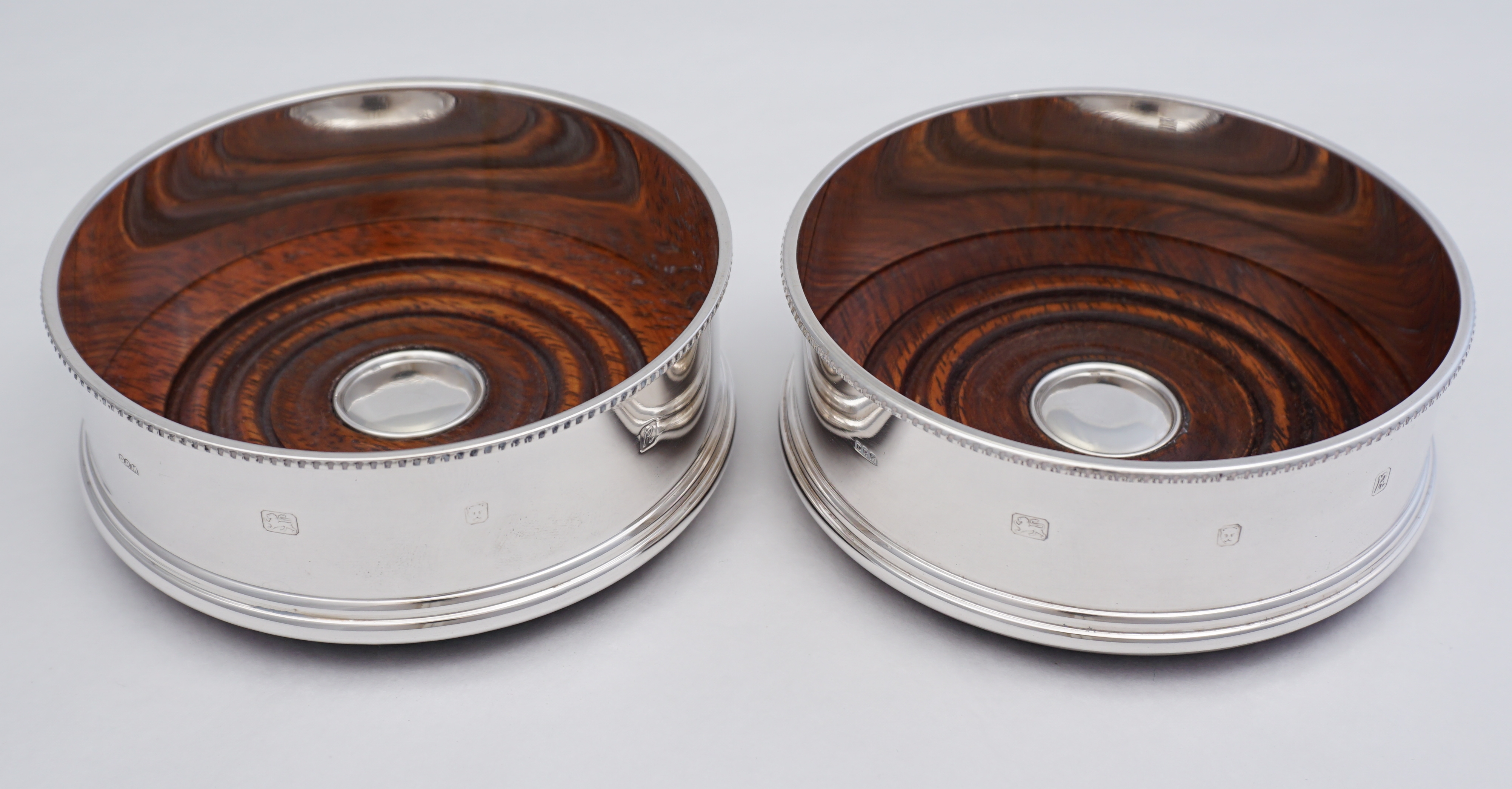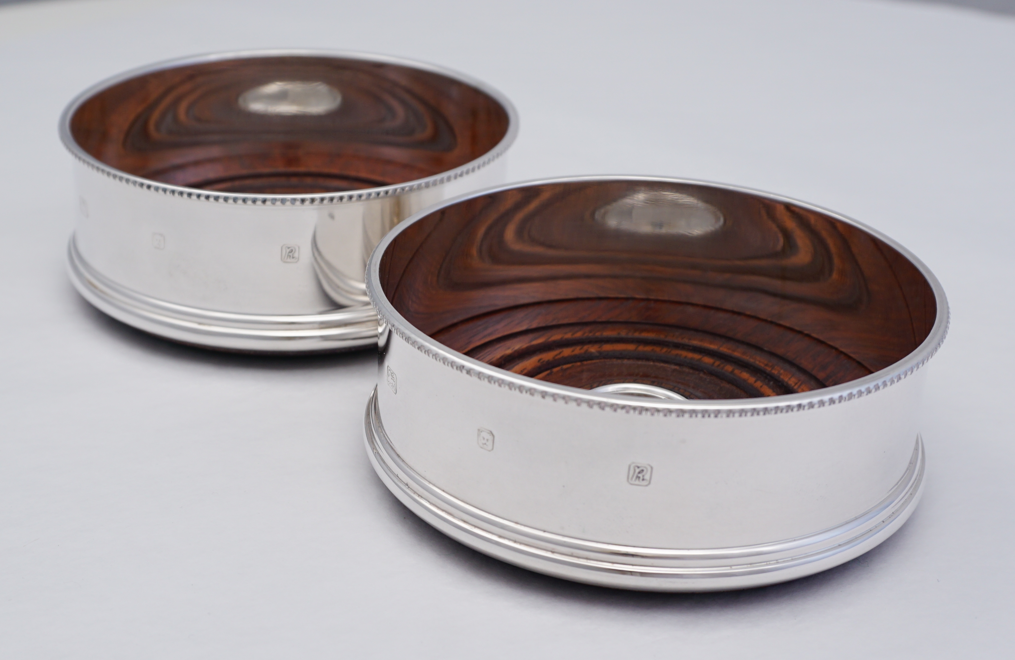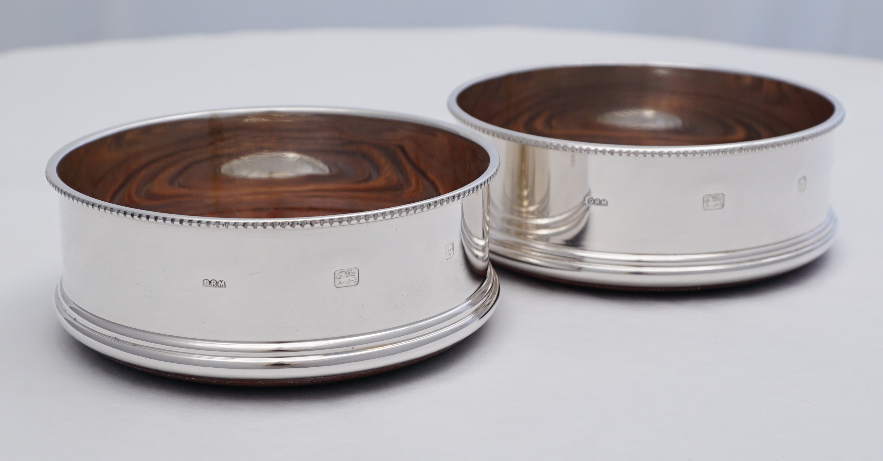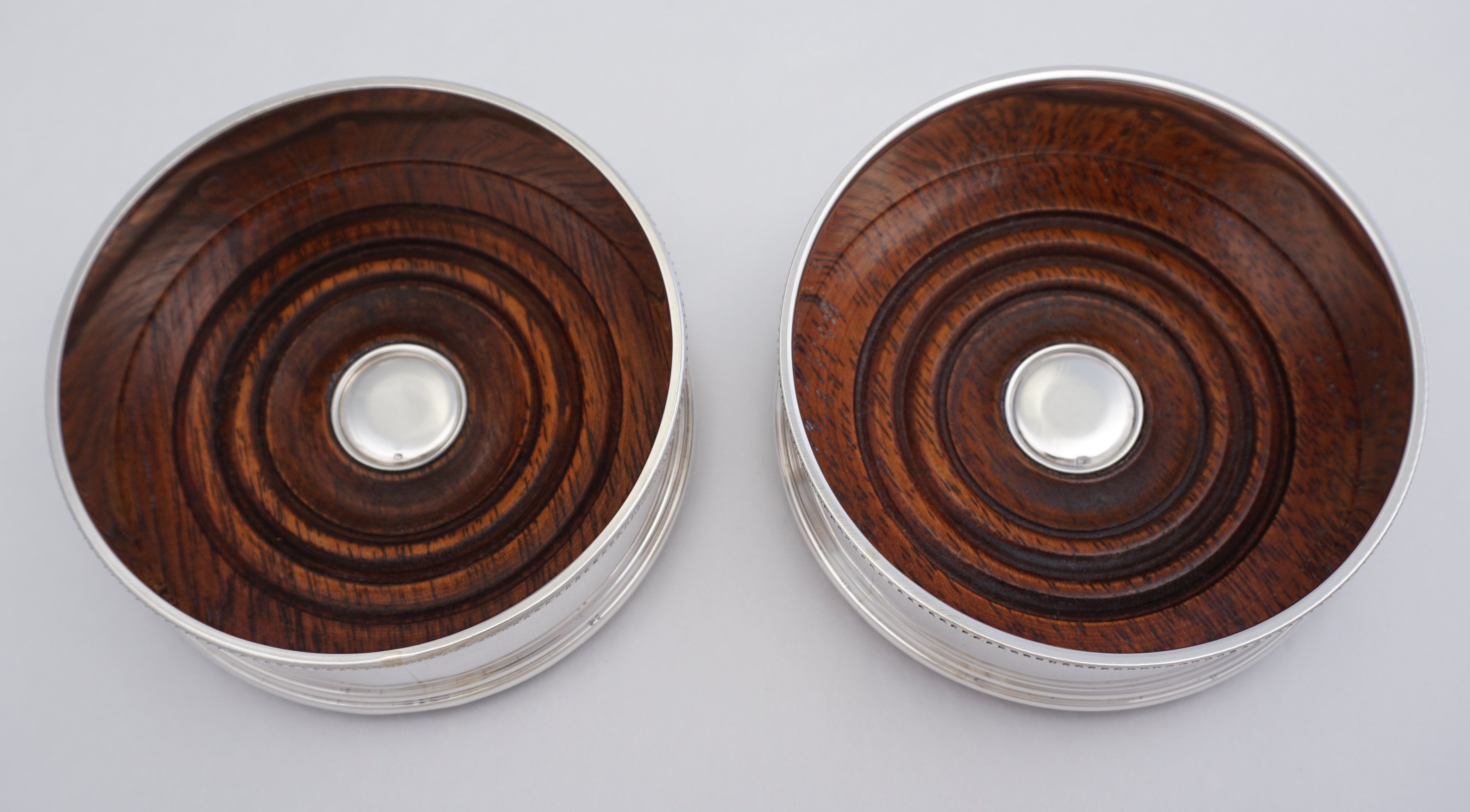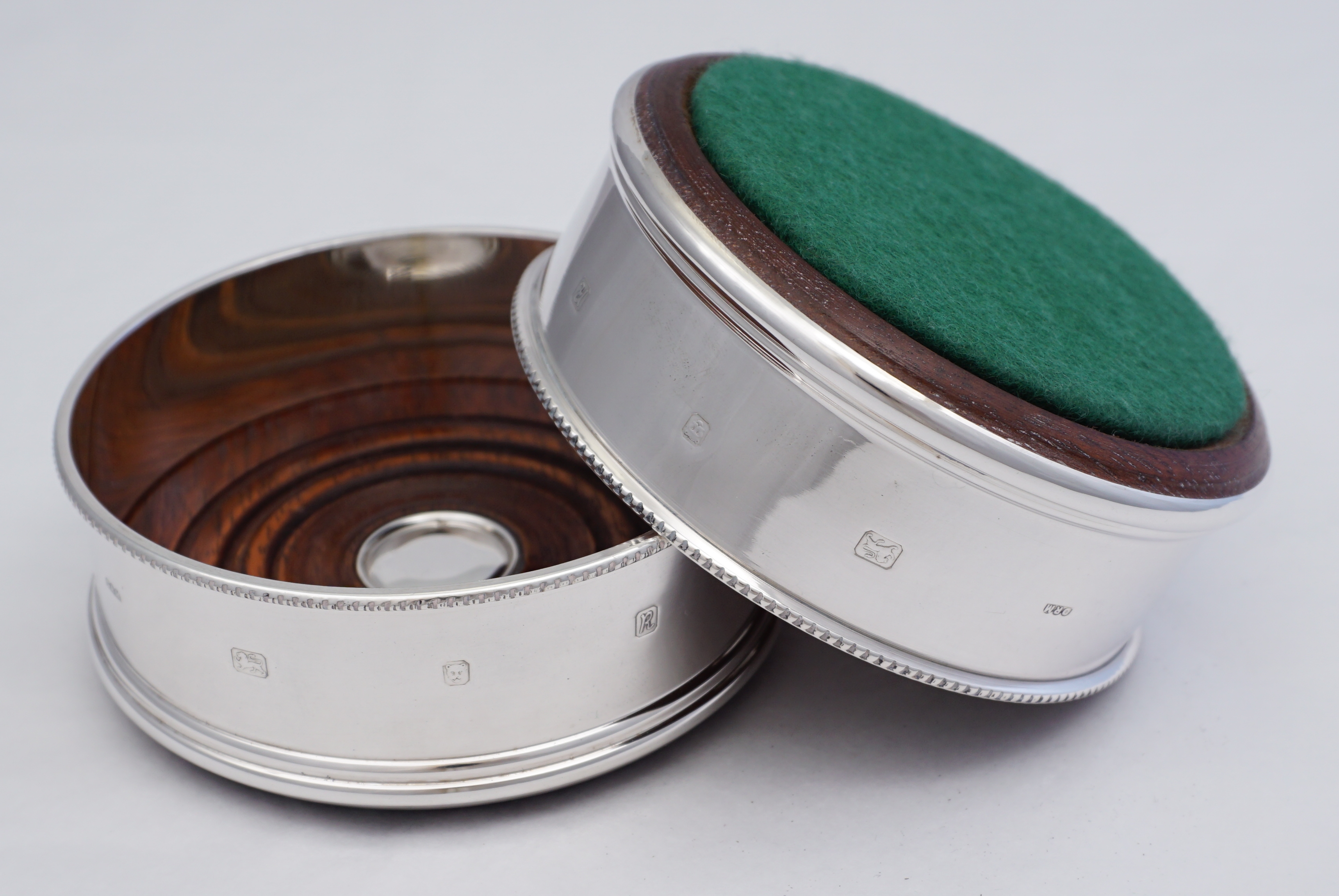 DESCRIPTION | Pair of vintage English solid sterling silver bottle coasters with silver button inset turned wood bases and felt bottoms. |