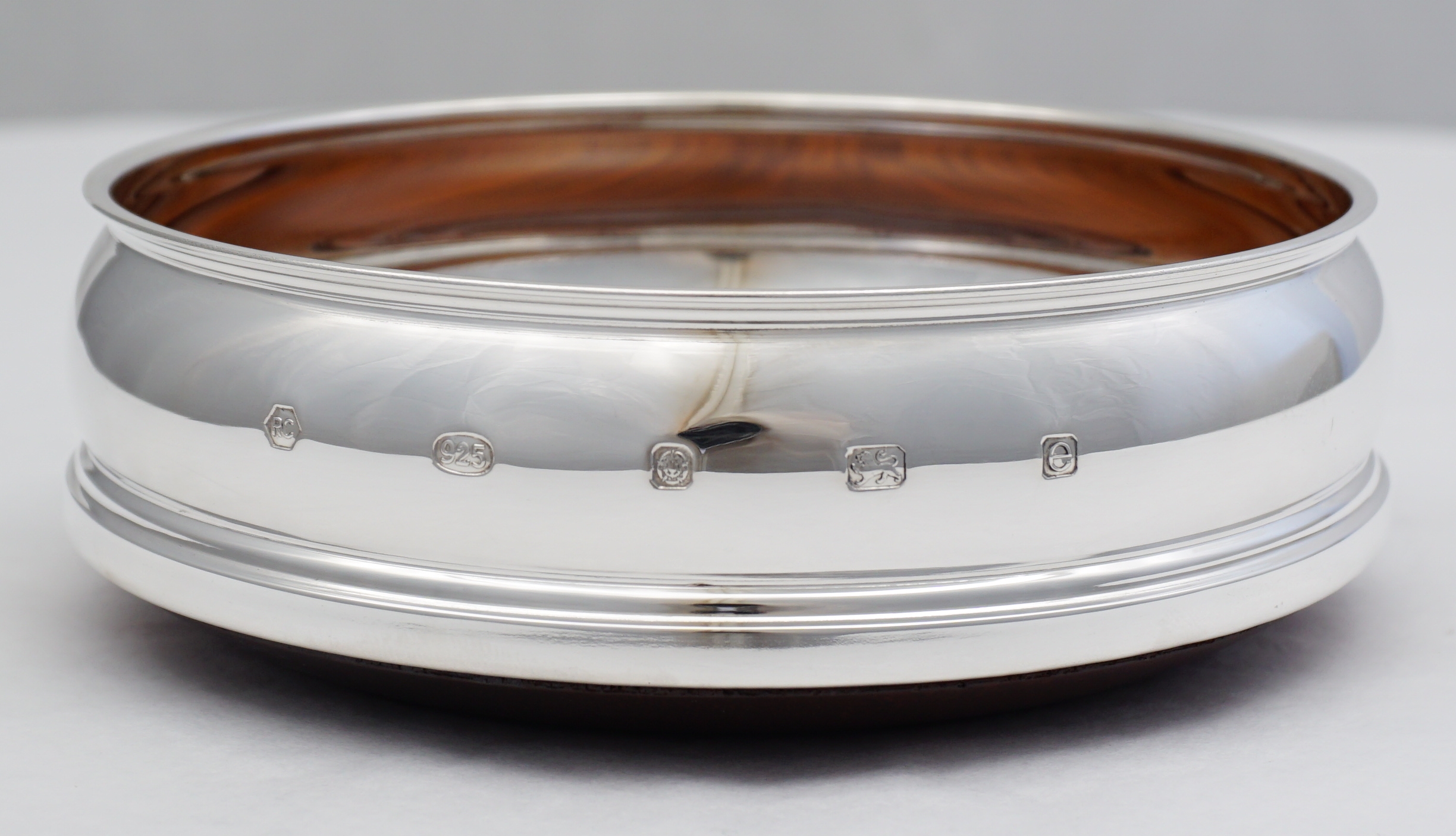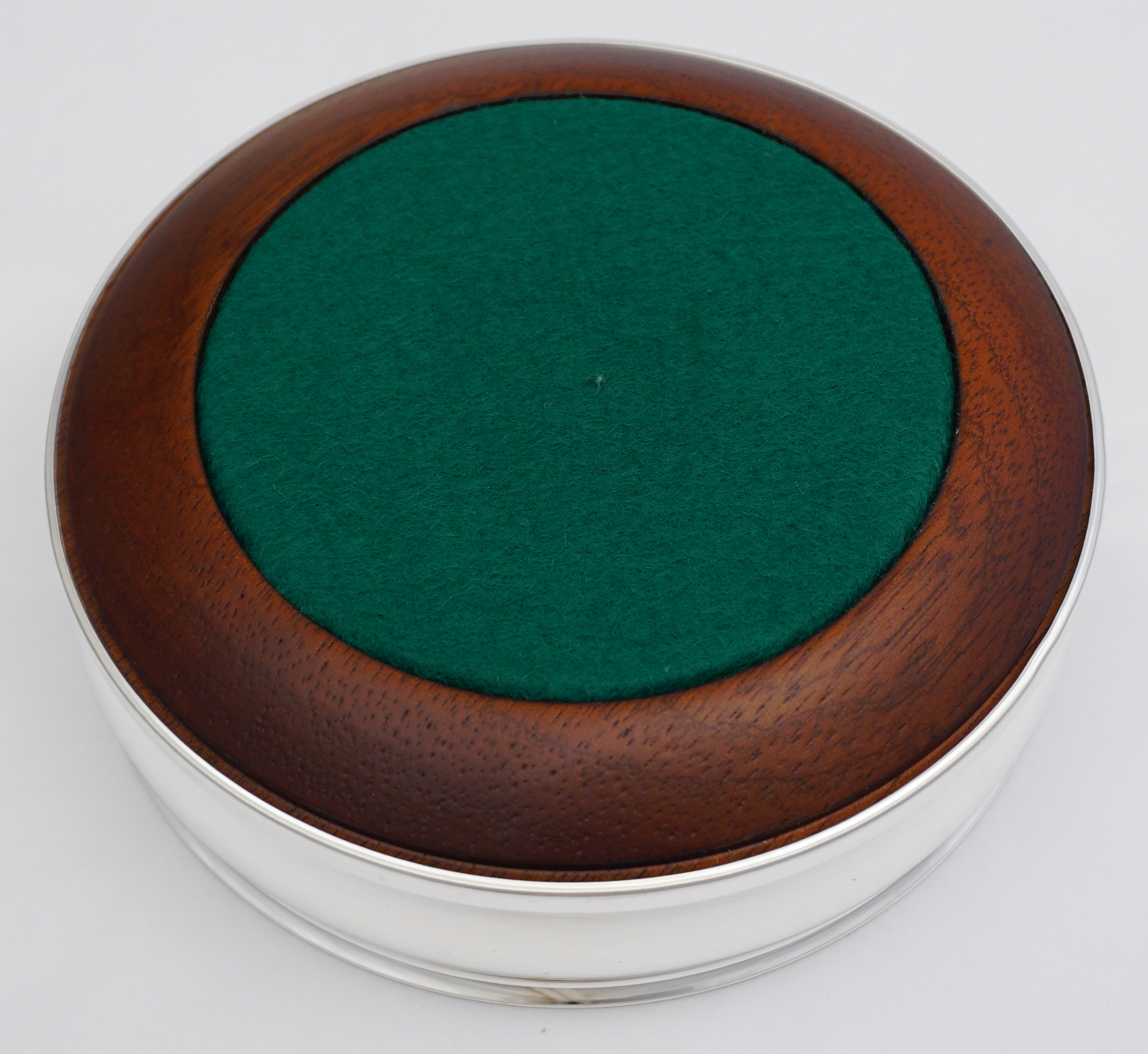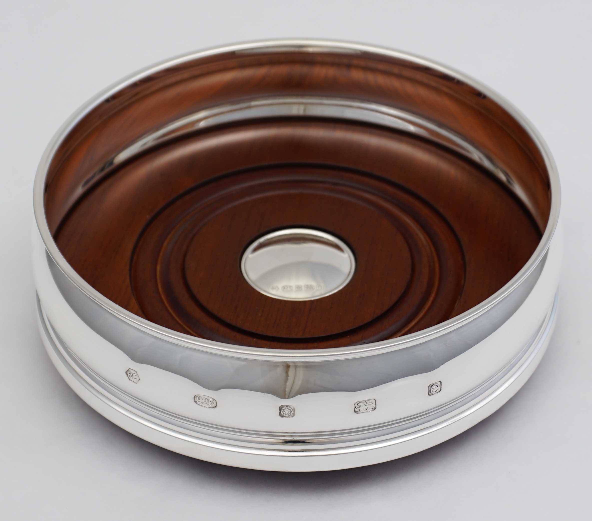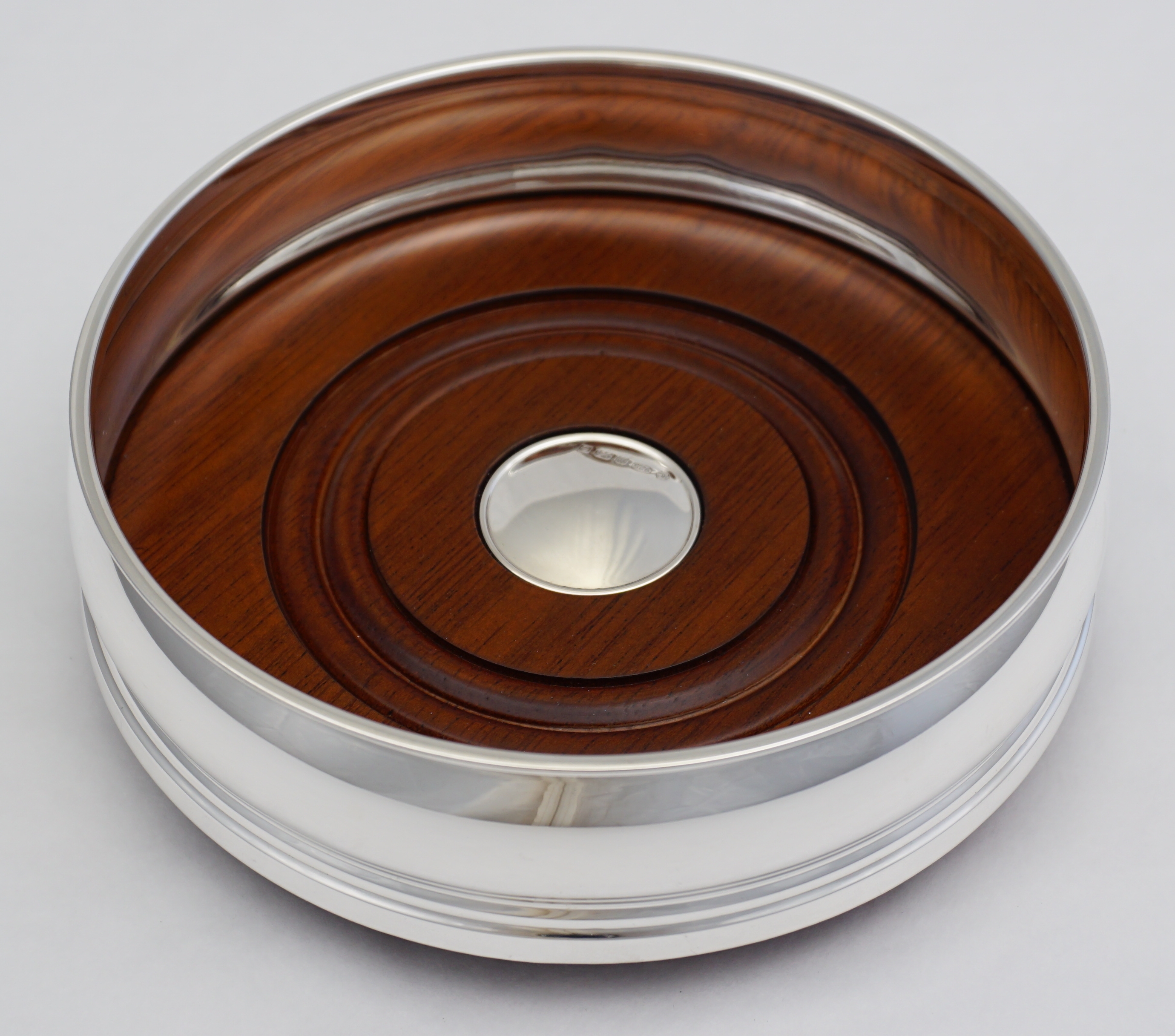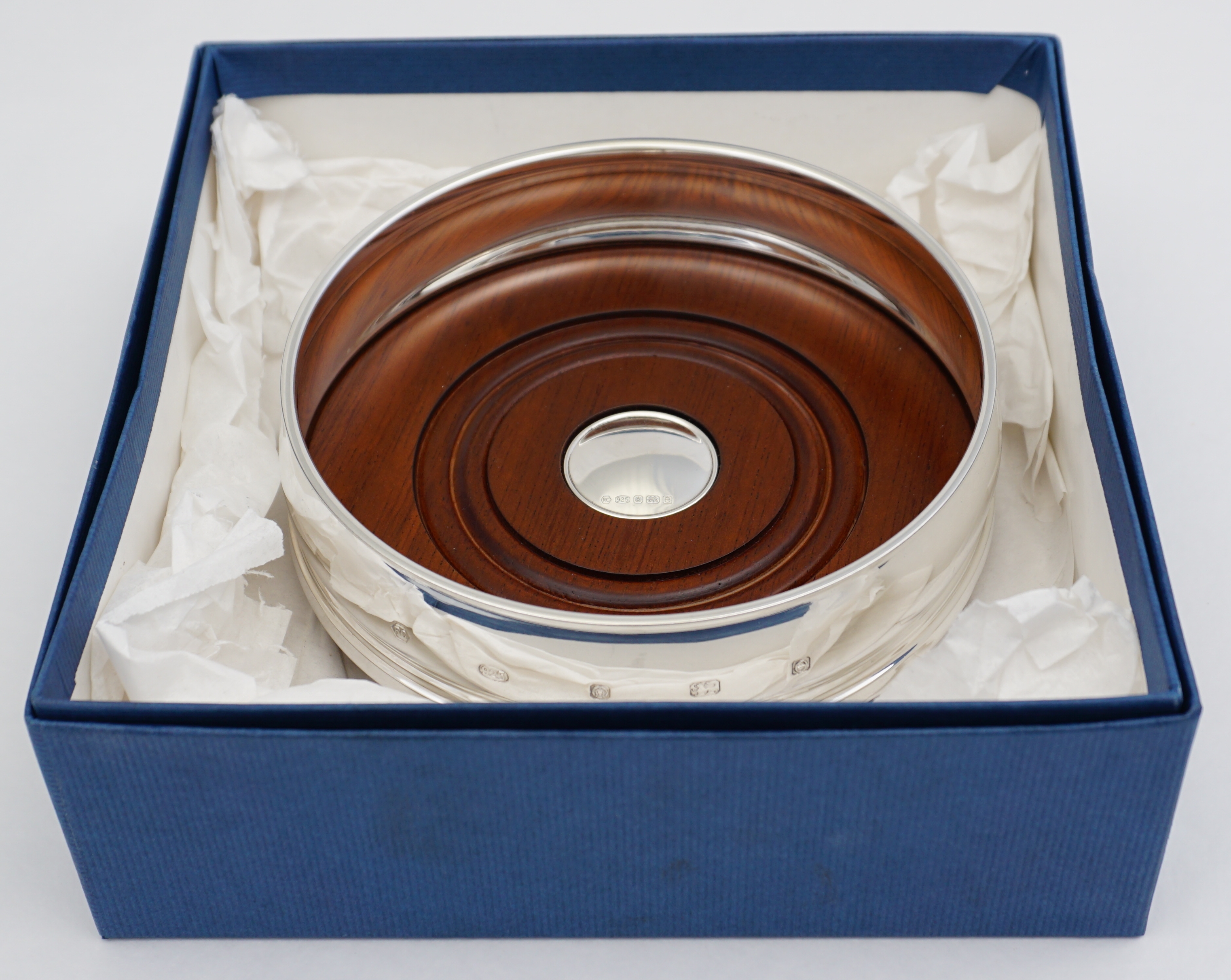 DESCRIPTION | Perfect English solid sterling silver bottle coaster with a silver button inset turned wood base with a felt bottom. Never used and complete with original box. |