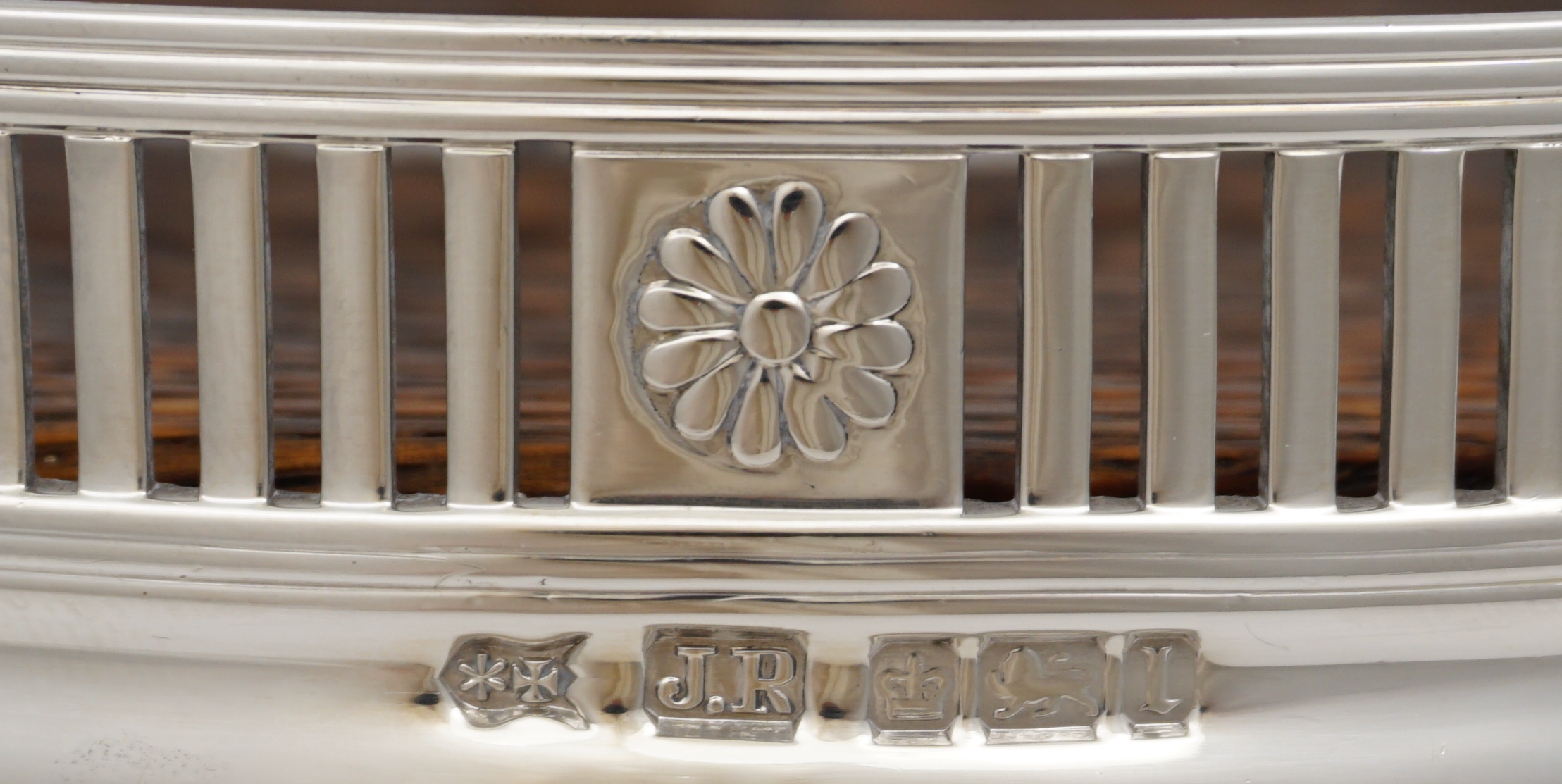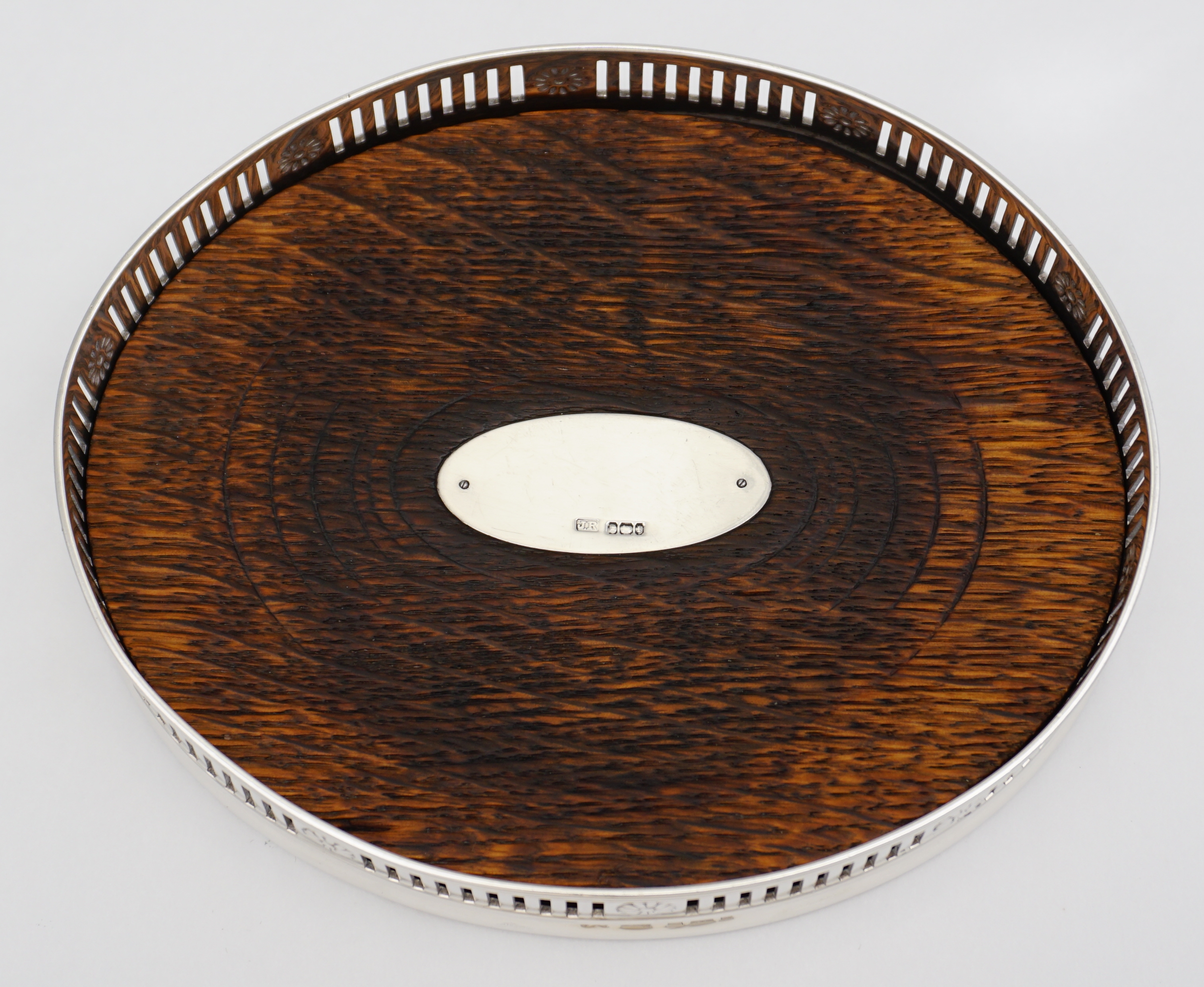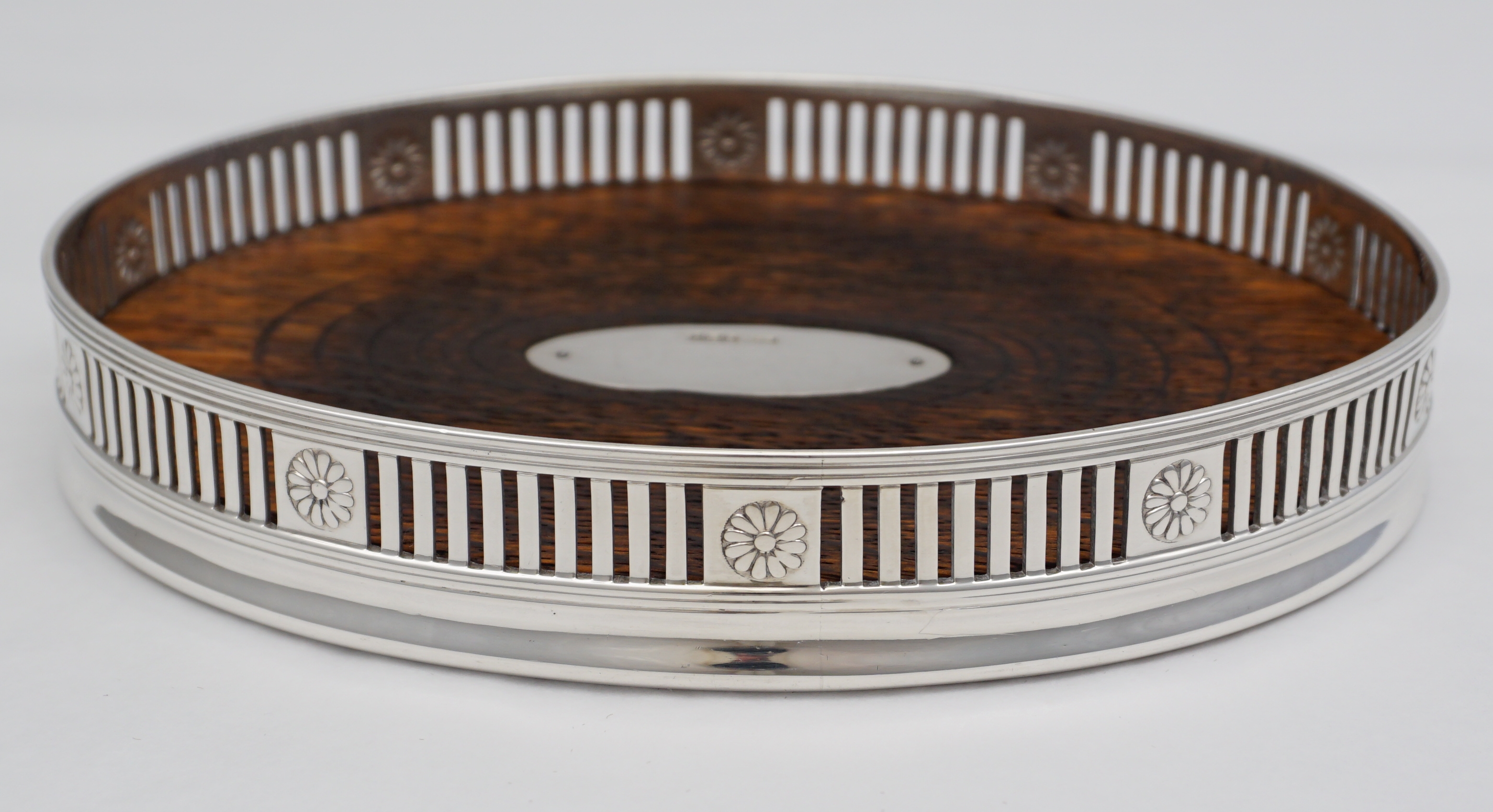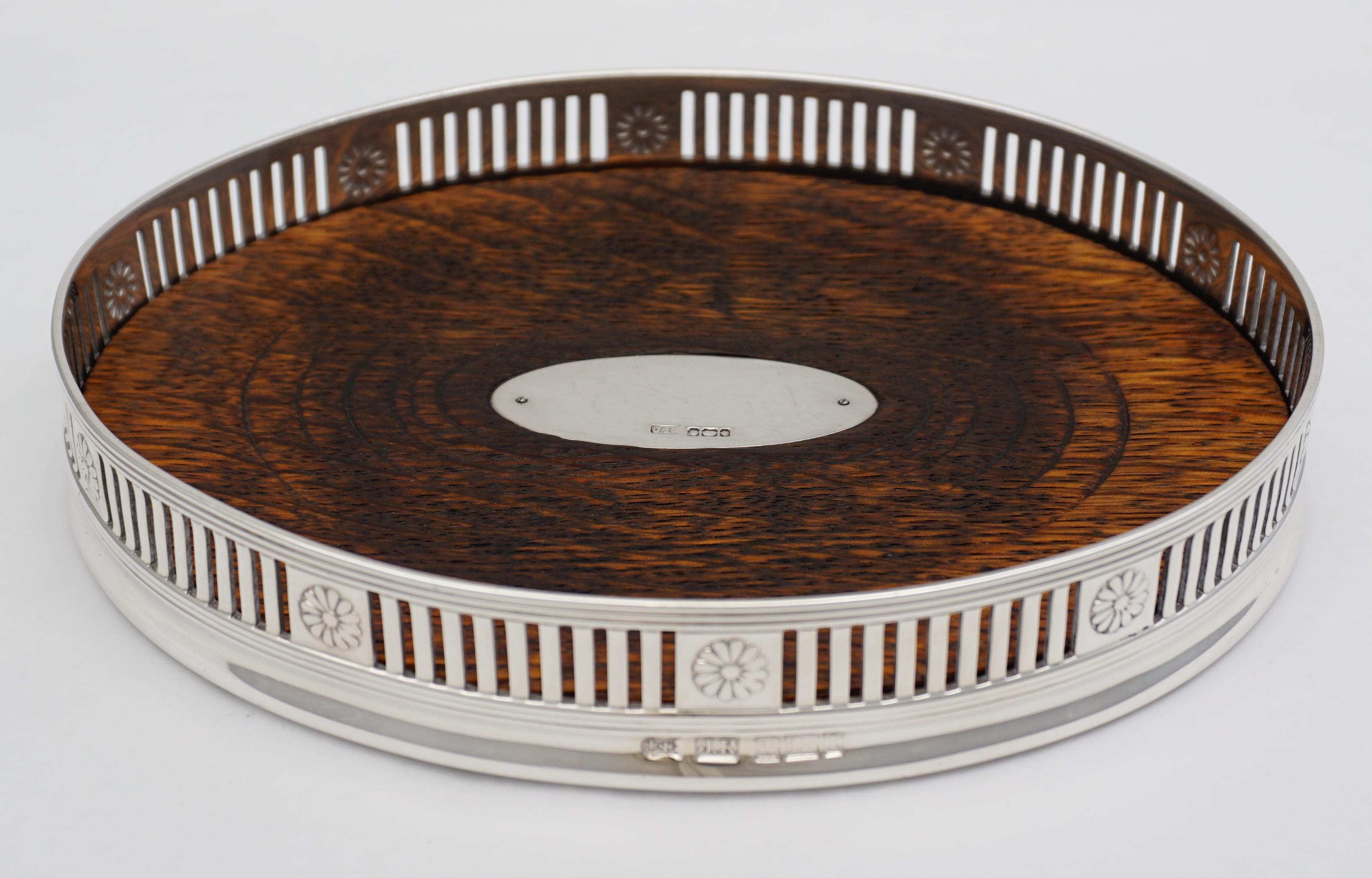 DESCRIPTION | High quality antique English solid sterling silver oval coaster with blank silver cartouche set turned oak base. Heavy gauge silver and even heavier oak. |