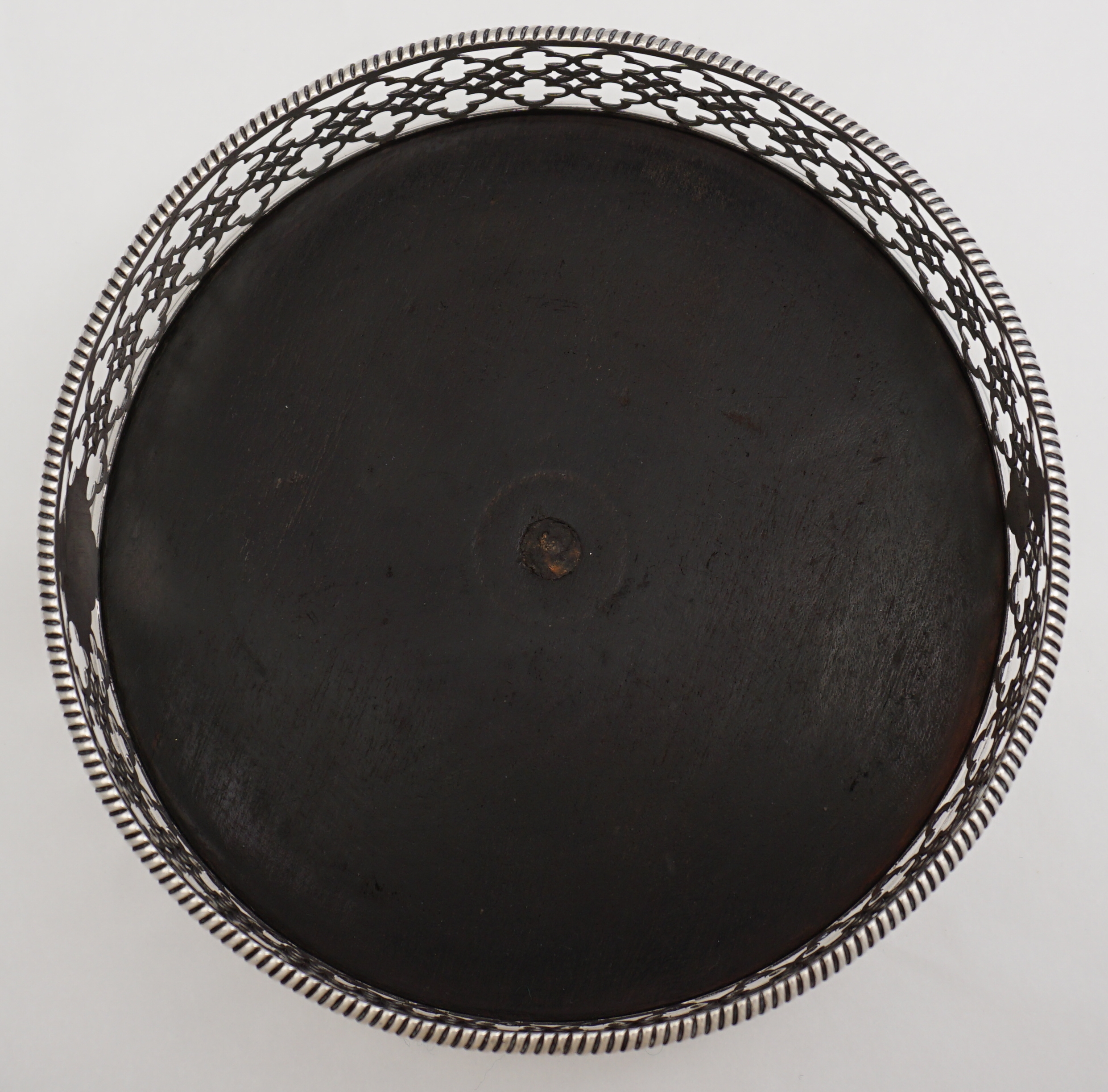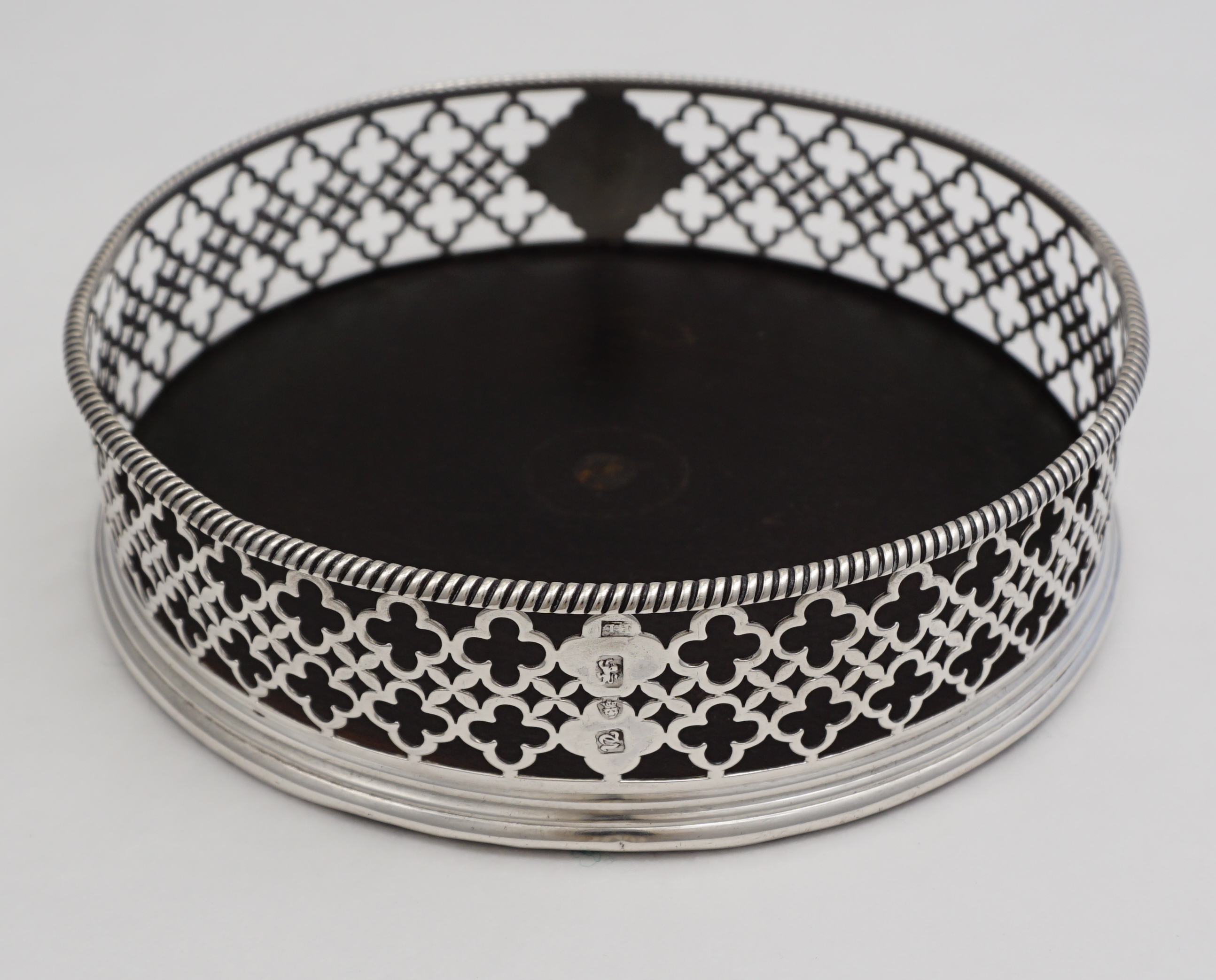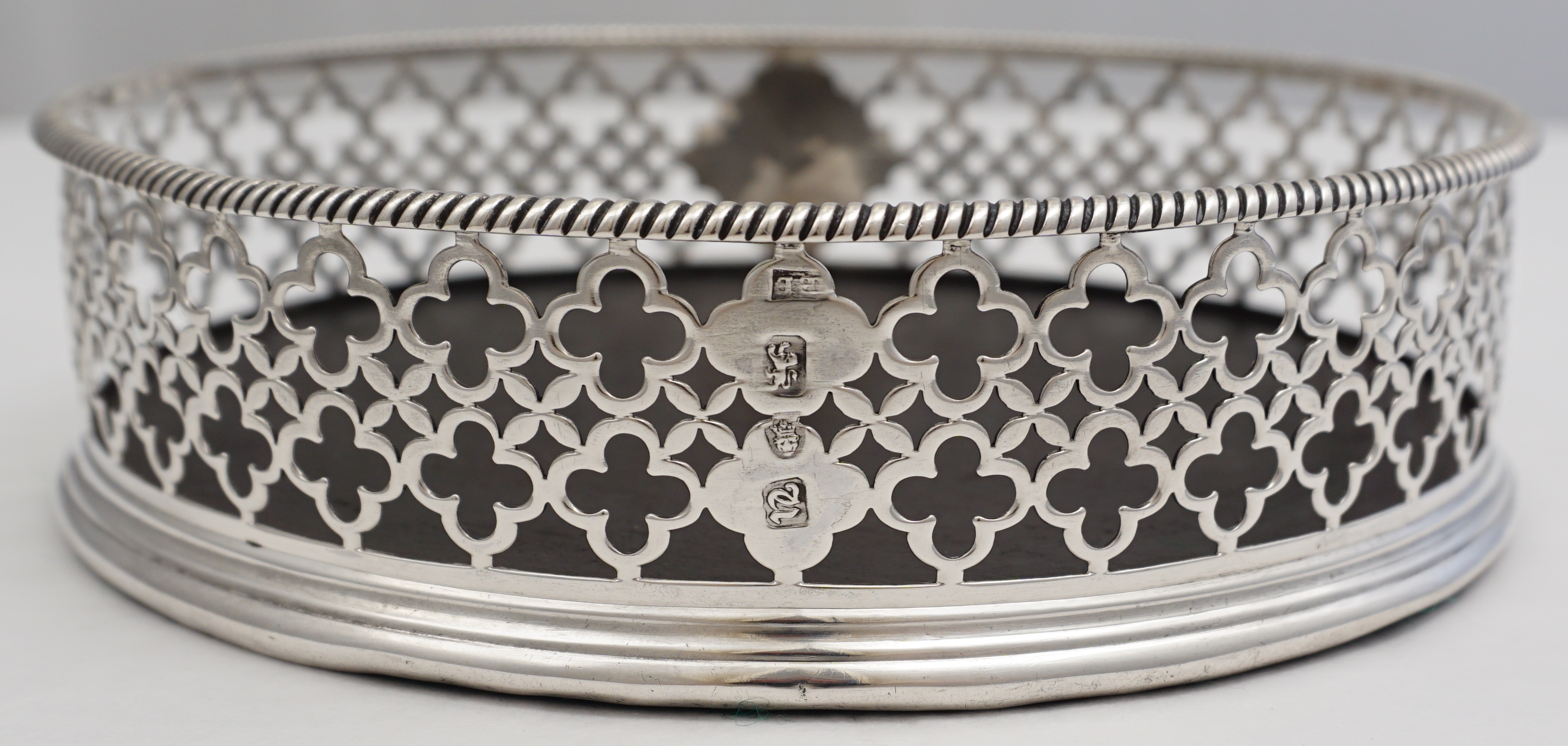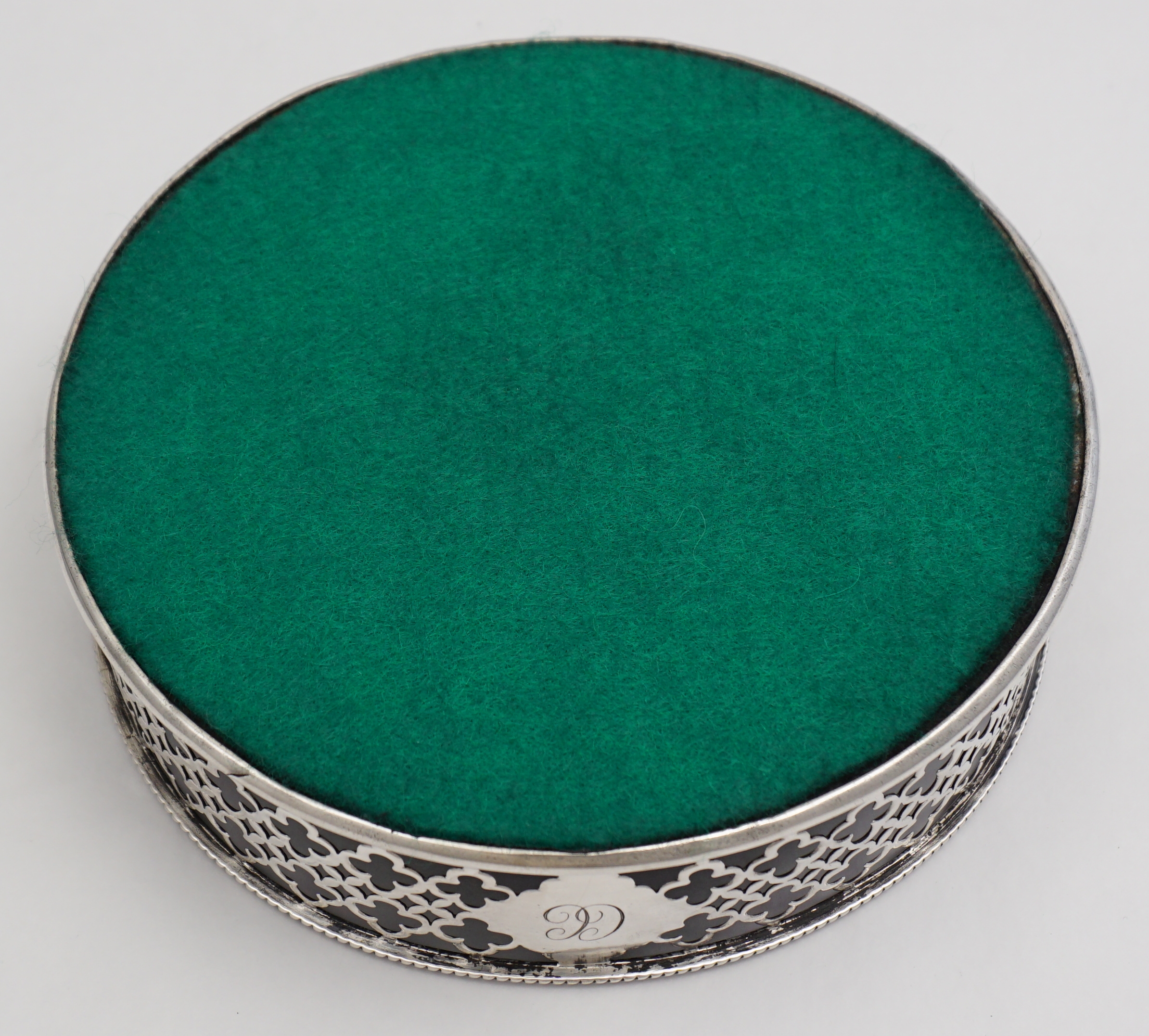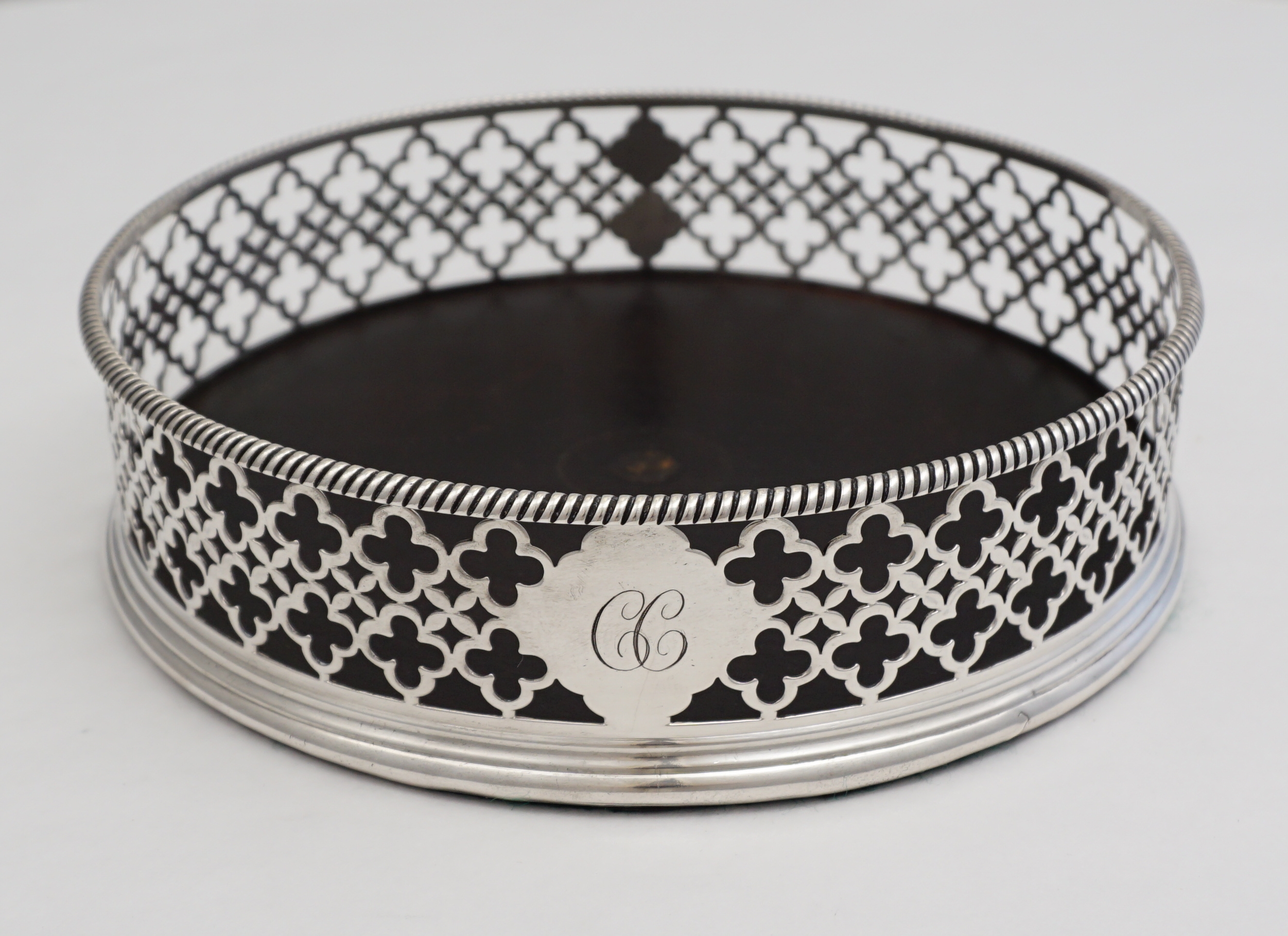 DESCRIPTION | Very good antique English Georgian pierced solid sterling silver 'large type bottle/decanter coaster' with a green felt lined ebony base. The cartouche is engraved 'CC' and the beautifully clear hallmarks have been struck to the two unpierced panels. Nice sign of quality and planning to leave the two unpierced areas to receive the hallmarks as so often important marks are lost within the piercing. This item began life as a Georgian cruet stand with central silver carrying handle and probably four glass bottles. Over time bottles get broken and the silver handle breaks due to the heavy load when all bottles/jars are full. This is an intelligent and functional re-purposing much in tune with today's ethos. Impossible to be certain when the conversion was done as all that was needed was to unscrew the three bracket feet and plug the hole where the handle went but I would guess this item has spent half its life as a cruet stand and half as a large coaster. |