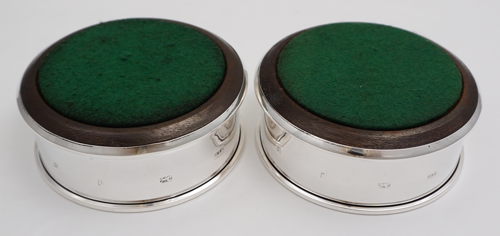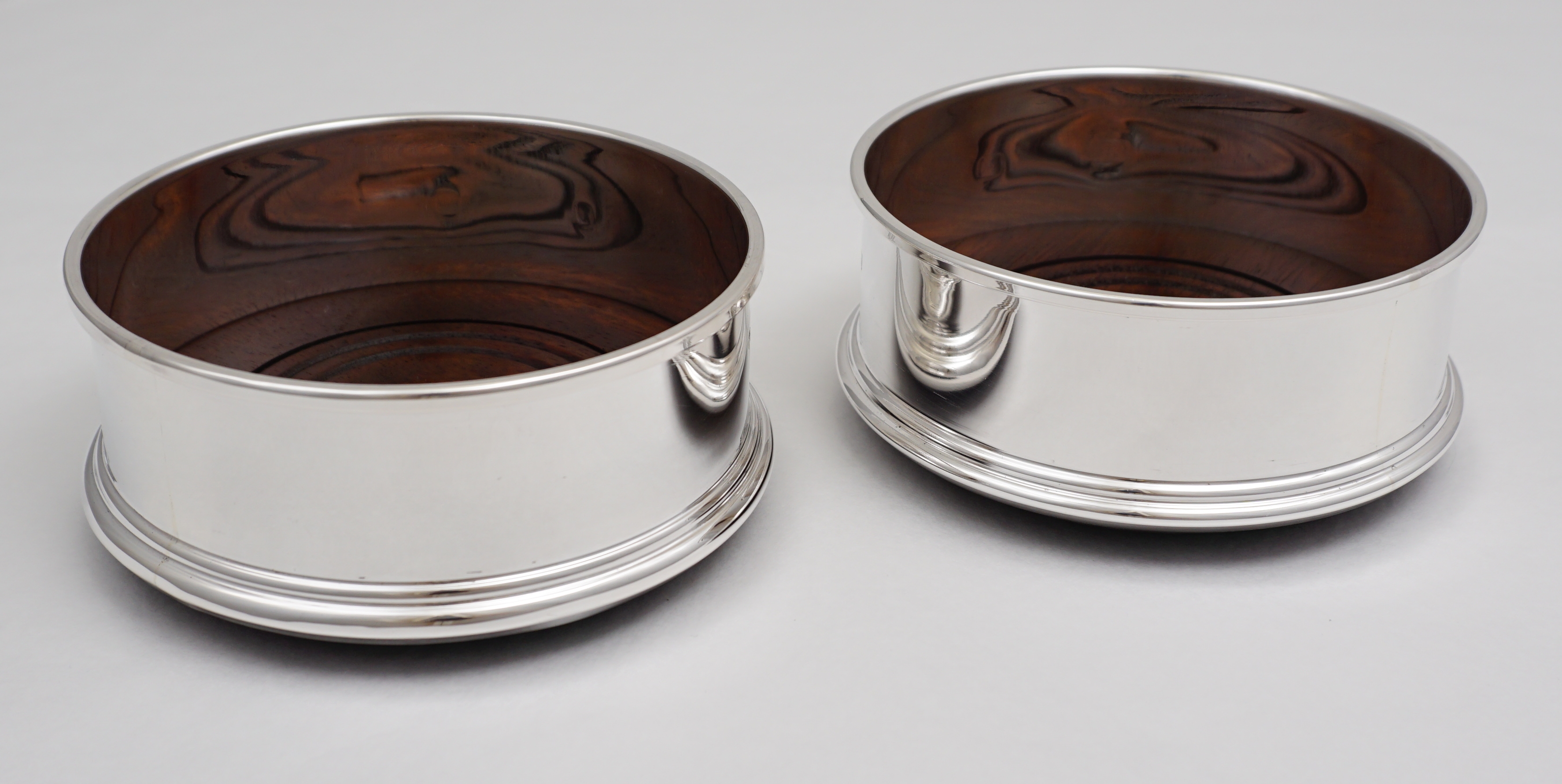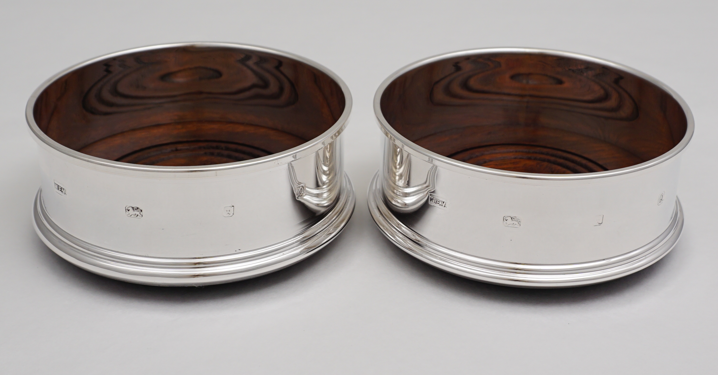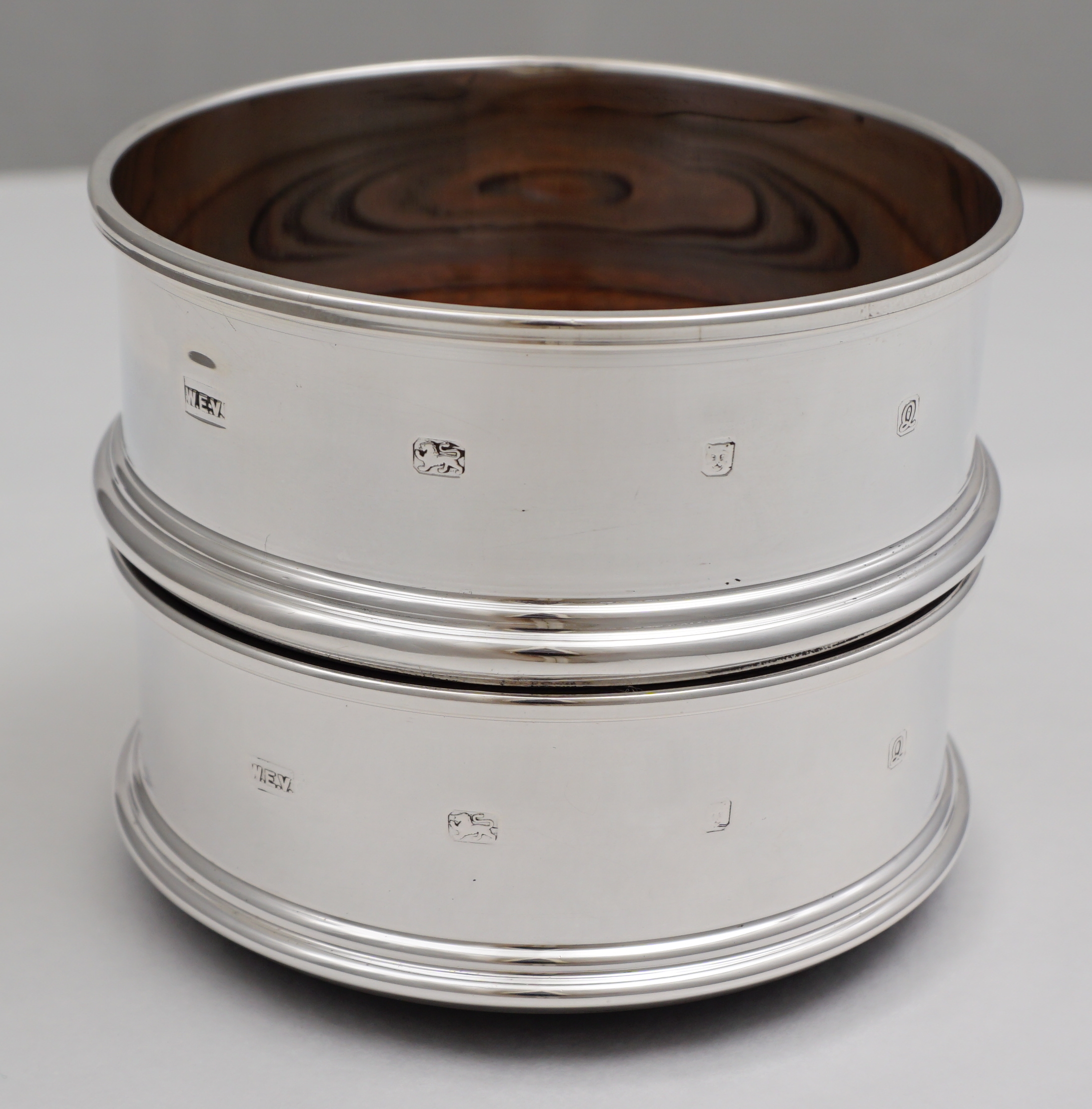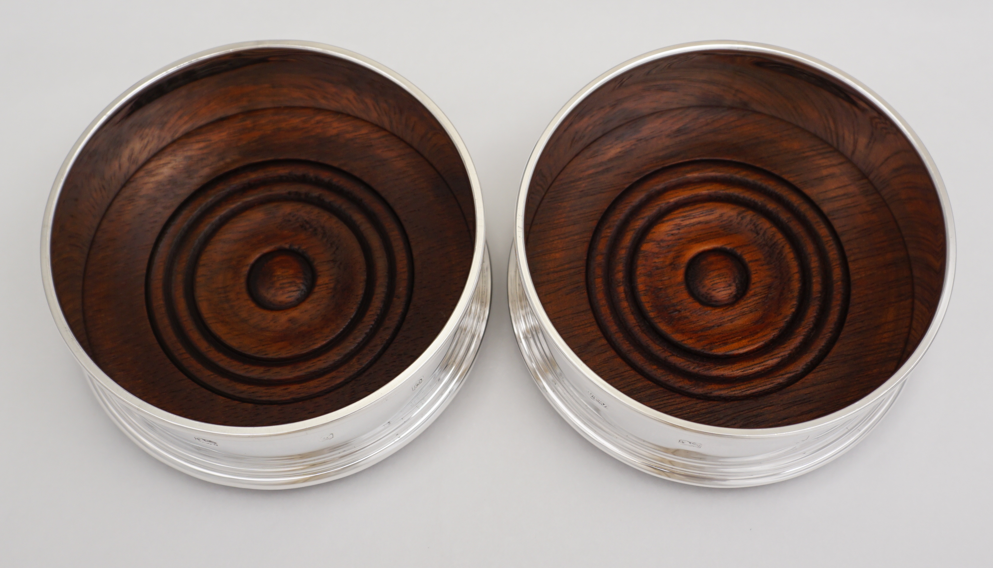 DESCRIPTION | Good pair of vintage English solid sterling silver wine bottle coasters with felt bottomed turned wood bases. |